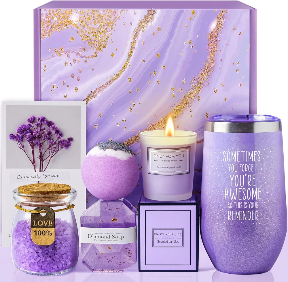 Elegant Gifts for Women for Any Occasion - LE CADEAU presents the Lavender Gift Basket for Women, a carefully curated collection of relaxation and tranquility, perfect gifts for birthdays, Christmas, Mother's Day, Valentine's Day, and anniversaries. A perfect curation of lavender-inspired goodies symbolizing care and thoughtfulness, ensuring unforgettable moments for the women you love. Relaxing Gifts for Her - The 6-piece Sister Gift Basket is a practical and thoughtful choice, featuring a 20oz wine tumbler, stainless steel straw, scented candle, bath salt, bath bomb, soap, and a heartfelt greeting card with dry flowers. Indulge her senses with this elegant lavender-themed gift set, designed to bring relaxation, tranquility, and happiness to her day. Personalized Gifts for Women Who Have Everything - Stand out with this lavender care package that adds a touch of elegance, diverging from traditional pink-themed gift boxes. A surefire way to make her smile on her birthday! The quote "YOU ARE AWESOME" on the wine tumbler adds a personal touch, making it a perfect gift for best friends, sisters, moms, daughters, coworkers, or girlfriends. Perfect Christmas Surprise - the beautifully crafted gift set perfect for birthdays, Christmas, Mother's Day, Valentine's Day, and anniversaries. The gift includes a lovely purple lavender greeting card, allowing you to customize your heartfelt message for the recipient, Express your love and appreciation to the important women in your life - whether it's your best friend, sister, mom, wife, nurse, teacher, coworker, or boss female. Product Description LE CADEAU Lavender Gift Basket for Women - Relaxation, Tranquility, and Joy | Perfect Birthday & Christmas Gifts for Her Elegant Purple Lavender Theme: Stand out with this lavender care package that adds a touch of elegance, diverging from traditional pink-themed gift boxes Stress Relief and Self-Care Pamper her with a 20oz insulated stainless steel tumbler, lavender-scented candle, handmade soap bars, a luxurious bath bomb and bath salt - all aimed at providing a relaxing spa-like experience. Relaxation and Tranquility Indulge her senses with this elegant lavender-themed gift set, designed to bring relaxation, tranquility, and happiness to her day. Thoughtful and Unique Gift A perfect curation of lavender-inspired goodies symbolizing care and thoughtfulness, making it an ideal gift for the special women in your life. Versatile Occasion Gifting Express your care and affection on various occasions including Christmas, birthdays, Mother's Day, Valentine's Day, and more. Also suitable for get well soon wishes, post-surgery recovery, and thinking of you gestures. Perfect gifts for best friend, sister, girlfriend, wife, mom, or daughter...