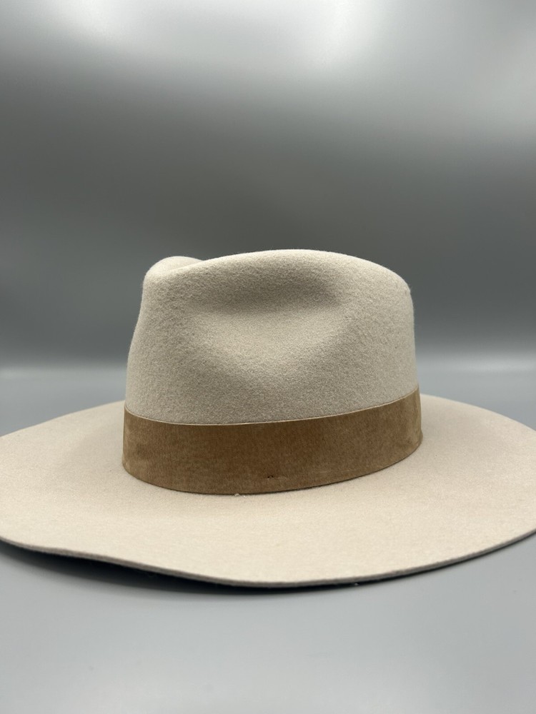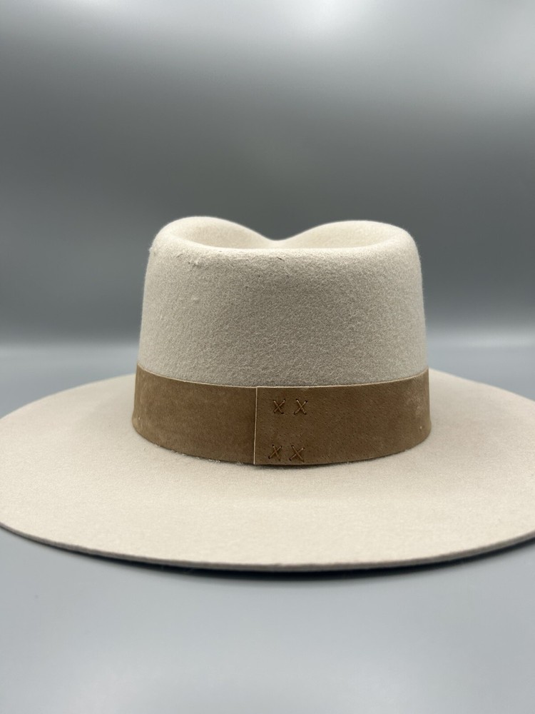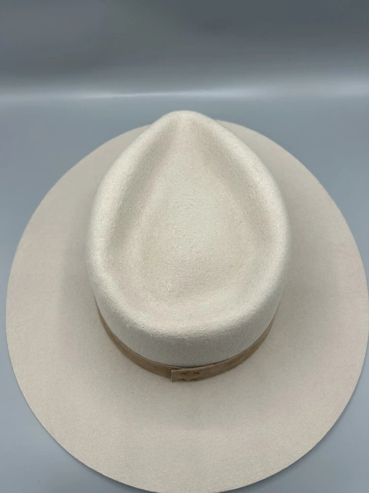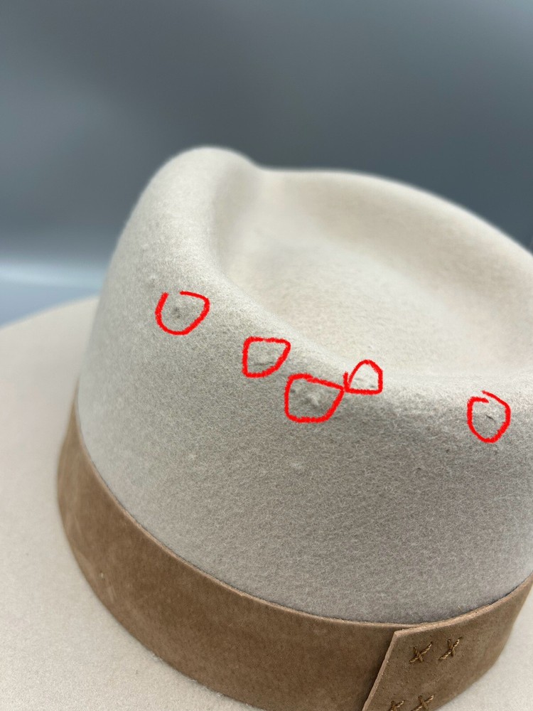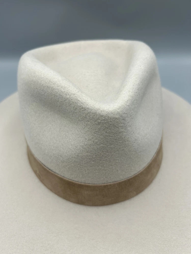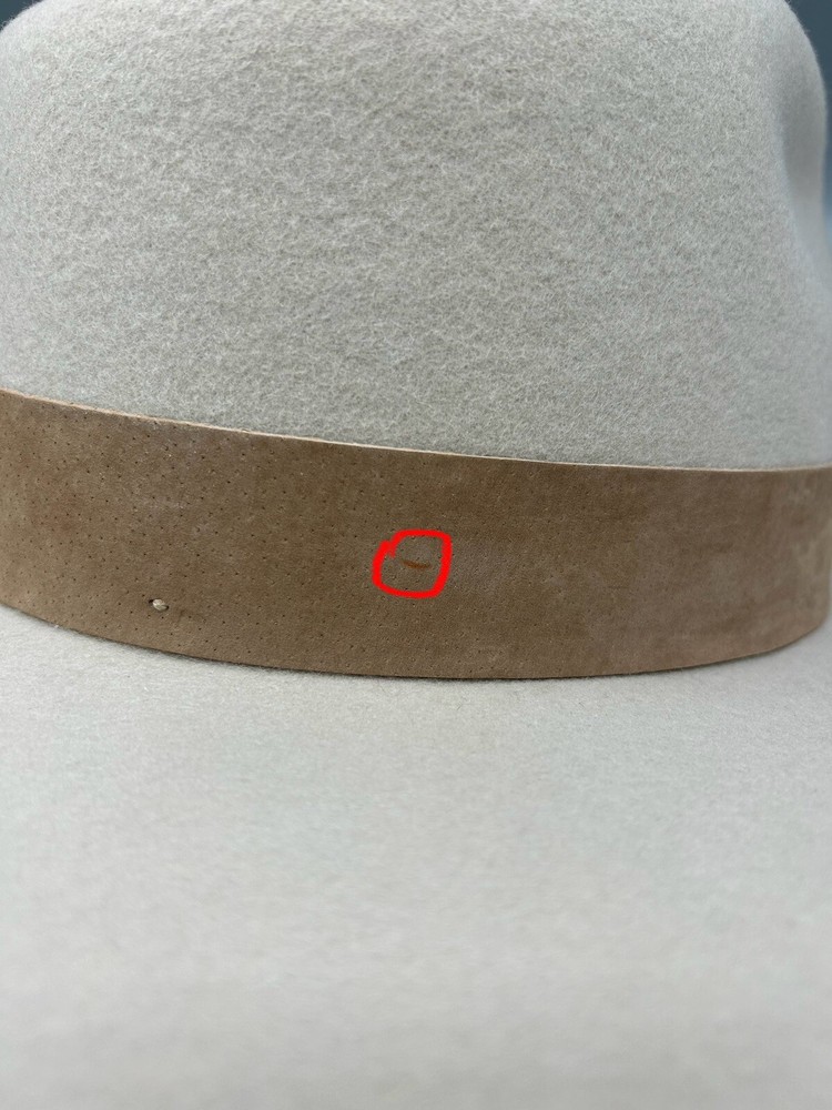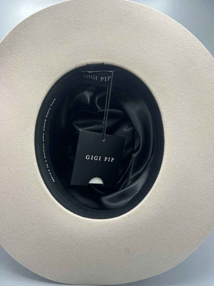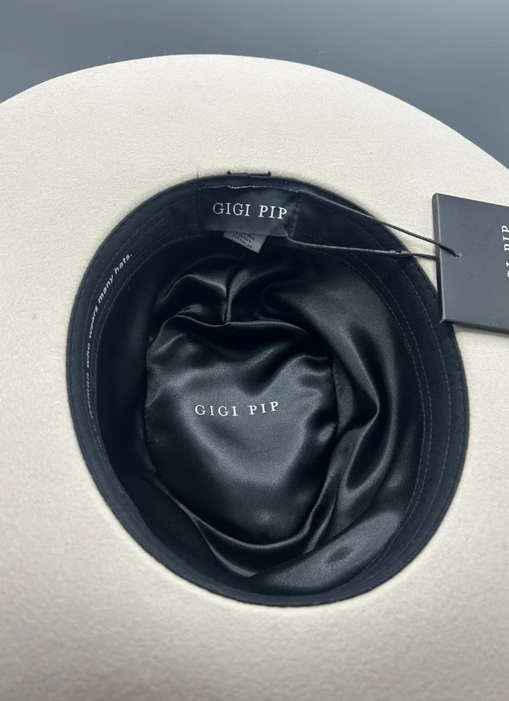 Defects include the little tiny mark on the band, and the little holes, all shown and circled in photos. Beautiful Gigi Pip Miller Fedora hat. Size S/M 57. 100% Australian wool. Teardrop fedora crown. Tall crown height. Stiff wide flat brim. Features a hand sewn suede brown band attached. Great sun protection. The cutest and softest hat!!
