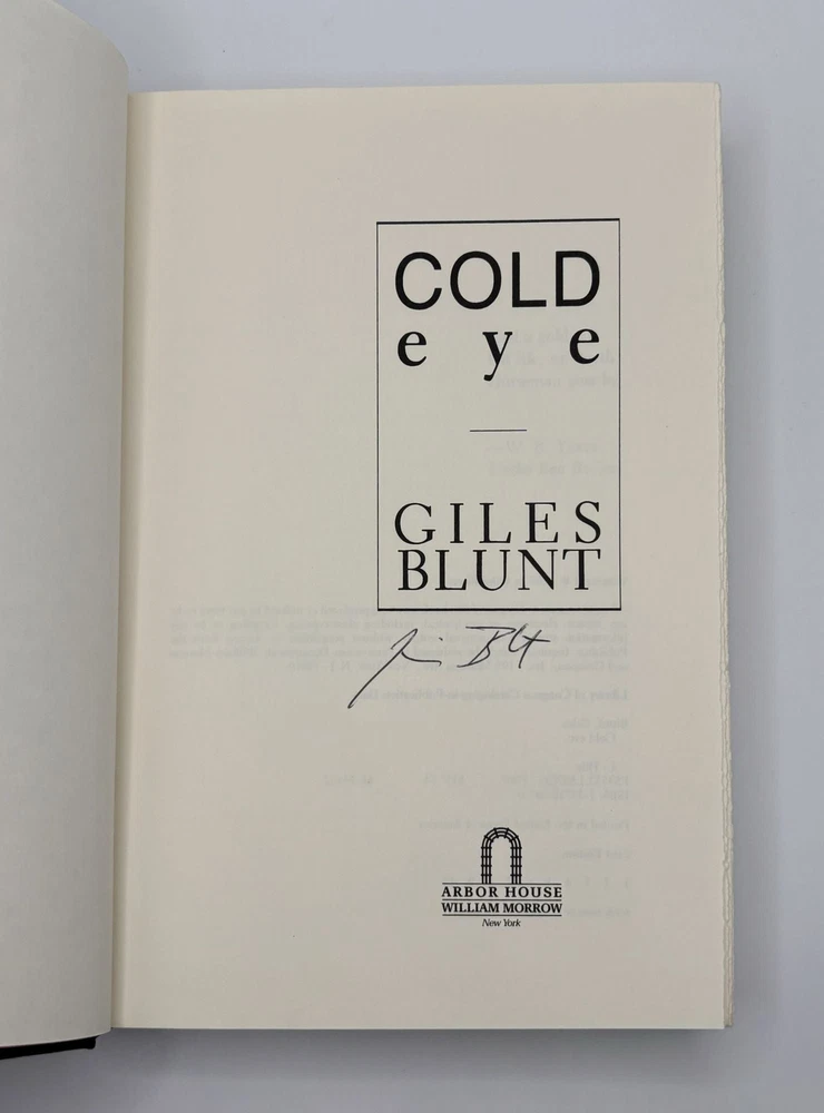 COLD EYE [Signed] Author: Blunt, Giles Title: COLD EYE [Signed] Publication: New York, New York: Arbor House, 1989 Edition: First Edition, First Printing Description: Octavo, 288 pages. In Very Good condition with Very Good condition dust jacket. Spine is black with red and cream lettering. Dust jacket protected by mylar covering, price uncut: "$16.95" on front flap and has mild shelving wear along extremities. Boards have mild shelving wear along extremities. Text block has mild foxing along head edge. Signed flat by Giles Blunt on title page. Shelved in hallway. Seller ID: 1392220 Subject: Literature Welcome to the eBay store of Second Story Books! DC's Oldest Rare and Used Bookstore, Second Story Books operates two open shops in the Washington D.C. metropolitan area. We have an extensive internet presence and provide accredited appraisals member ASA. This listing was created by Bibliopolis.