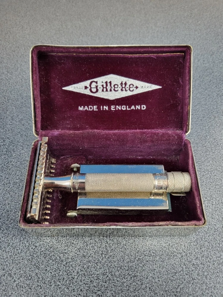 A much sought after antique Gillette RFB No.88 razor set. Manufactured in 1934 and in excellent condition, the razor has the Brit Pat nos 352975/6-363892 on the handle. Weighs 59gms and comes with 4 unopened Blue razor blades.