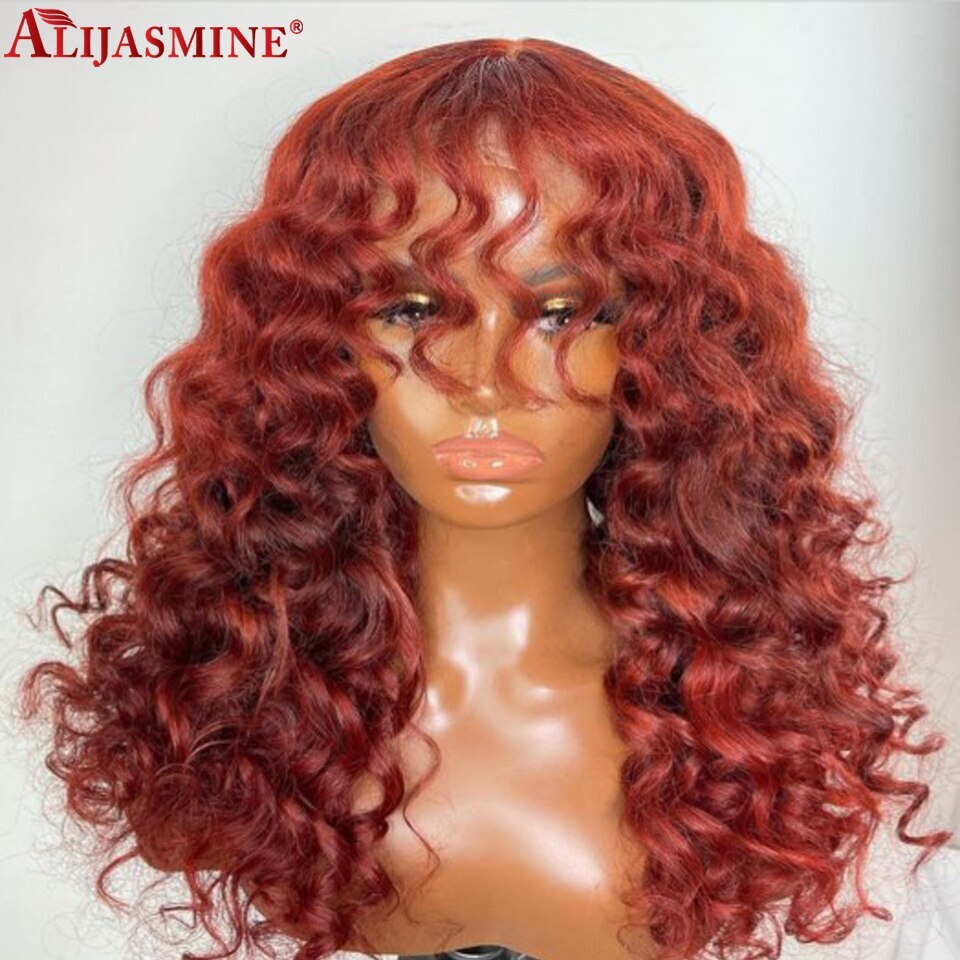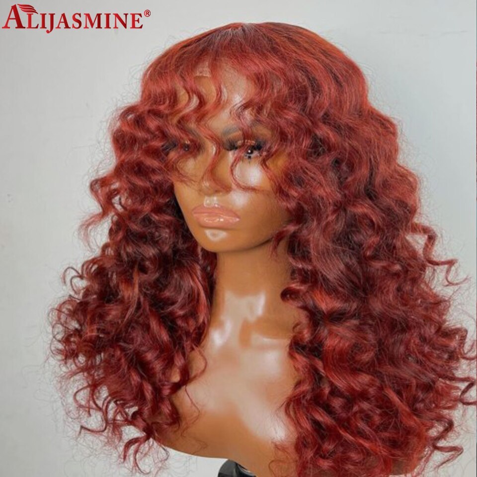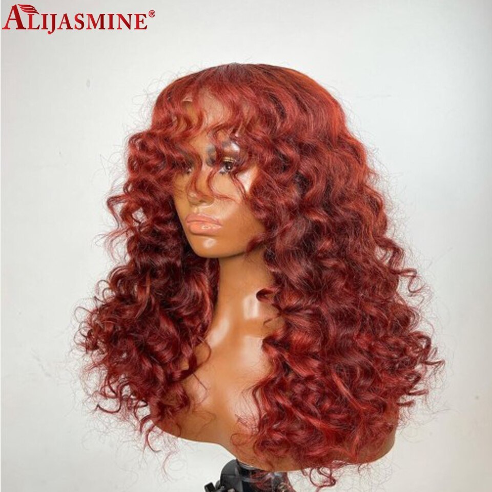 Ginger Brown Colored Curly Human Hair Wig with Bangs Glueless Full Machine Made Brazilian Deep Wave Wig for Women Remy Fringe 100% Human Hair Wig All for 1 real and free shipping Pre Plucked & Bleacked Knots Natural Hairline With Soft Baby Hair Around Can Be Dyed and Restyled By Youslef Transparent Lace Color Suitable For All Customer 130% 150% 180% 200% 250% High Density Lace Wigs We Will Add 4 Combs & Adjustable Strap Then Wig More Safer. All Of Our Wigs Are 100% Human Hair,Very Healthy For People.