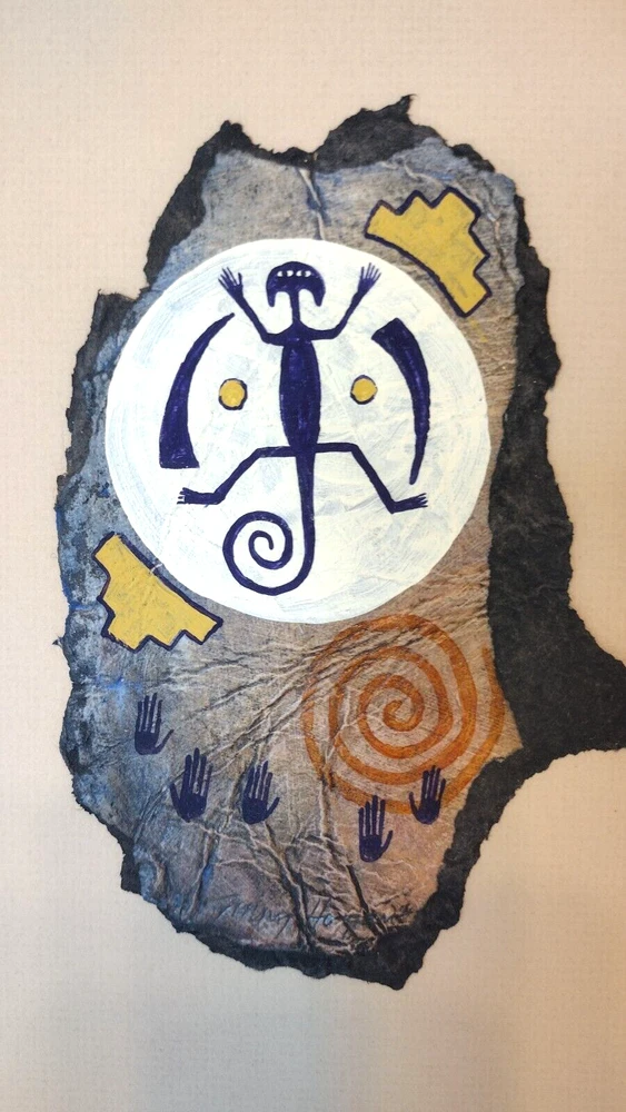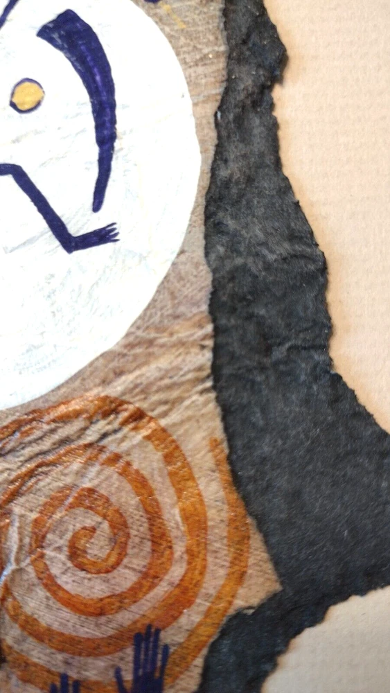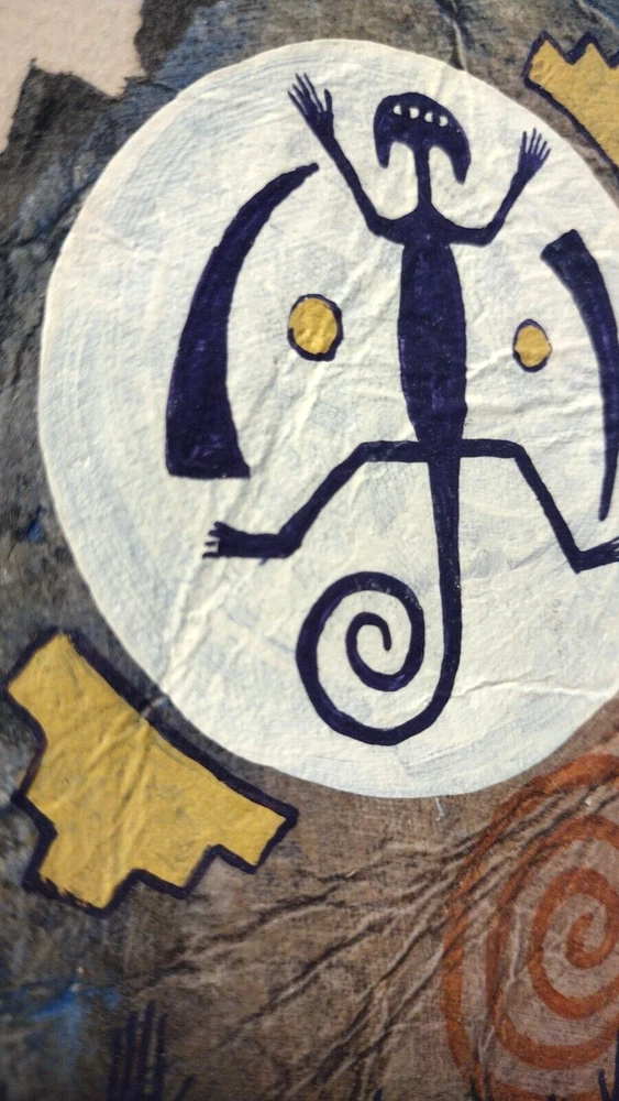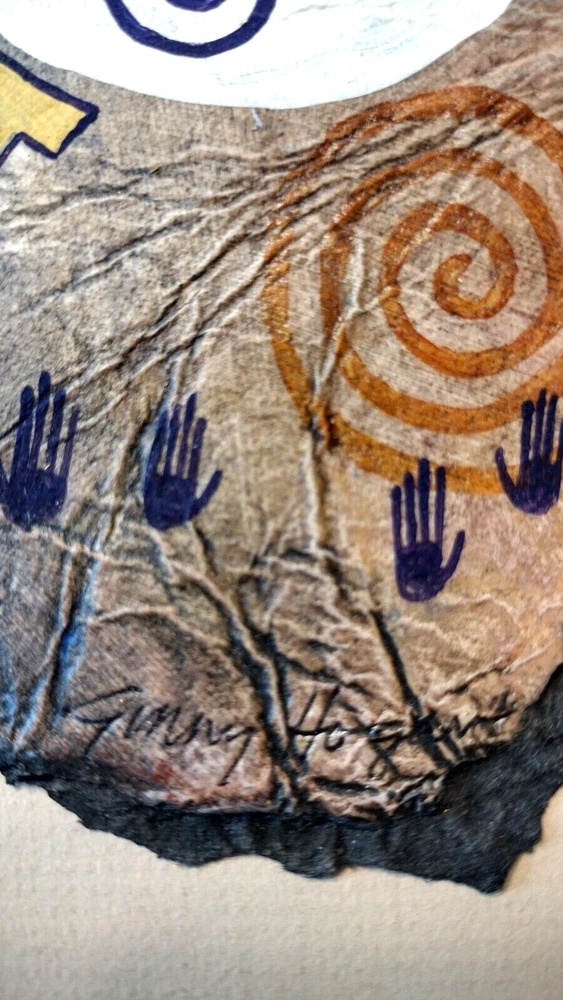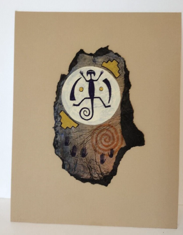 This beautiful piece is created and signed by artist Ginny Hogan of New Mexico. It is matted on a tan/beige background and signed in the bottom right corner of the art. The matting will fit a 8" x 10" frame; the art piece itself measures approximately 6.5" in length and 4.25" at its widest. Please see all photographs as they are part of the description. Shipped with USPS First Class Mail. About the Artist: The artist attended CSU and learned the ancient art of paper-making. She uses 100% cotton rag to form sheets, wrinkling the edges when dry, ripping the edges and coating them with layers of acrylic paint to created an aged effect ready for painting. Hogan is a self-taught artist inspired by cave and rock art, painting and pecking called pictographs and petroglyphs made by native people all over the world. Her work is primarily southwest in nature including bison, horses and desert landscapes. UpQ4