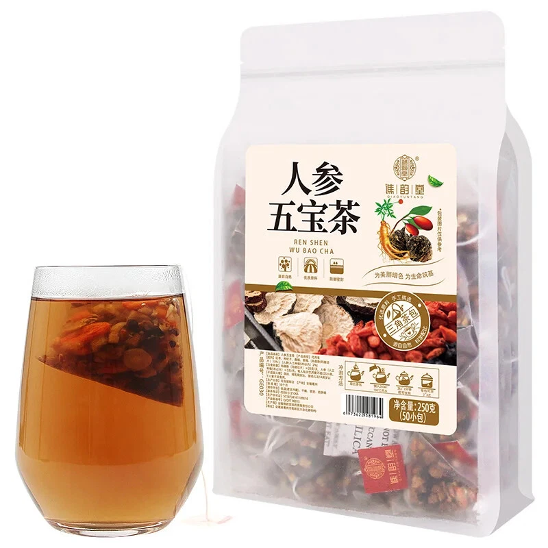 Name: Ginseng Five Treasure Tea Type: substitute tea Specification: 250g/bag=50 small bags Storage method: in a cool and dry place Ingredients: jujube goji berry mulberry, Huangjing maca powder ginseng This product adopts a triangular tea bag design, which can prevent tea ingredients from entering the mouth when drinking. Independent small bags are more convenient. All raw materials are of good quality and scientifically proportioned
