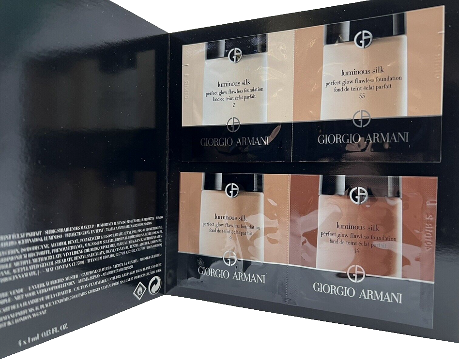 Giorgio Armani 4PK Luminous Silk Foundation 4 Sample Shades 2, 5.5, 9 & 14 This lightweight foundation with Micro–fil™ technology allows color pigments to lay flat for seamless blending and layering. A makeup artist and celebrity favorite, this hydrating foundation helps improve skin texture and blur imperfections, all while delivering a long-lasting, lit-from-within glow.