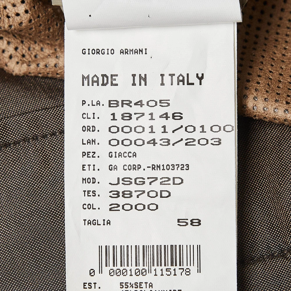This Giorgio Armani brown jacket offers the satisfaction of a comfortable fit and refined style. It is made of quality fabrics and designed with a front closure, two pockets, and long sleeves.Certified by The Luxury Closet - This item has gone through a detailed authentication process overseen by our experts. We offer a lifetime guarantee of authenticity on all our items. Import duties, taxes and charges are not included in the item price. These charges are the buyers responsibility. Please check with your country’s customs office to determine what these additional cost will be prior to buying. Our eBay Store About Us Contact Us Add to Favorite Sellers Giorgio Armani Brown Silk Blend Jacket XXXL $125.4 This Giorgio Armani brown jacket offers the satisfaction of a comfortable fit and refined style. It is made of quality fabrics and designed with a front closure, two pockets, and long sleeves. Product Details Brand Color Brown Dimensions Material Silk Blend Size XXXL Outsole Width Outsole Length Heel Height Includes The Luxury Closet Packaging Certified by The Luxury Closet This item has gone through a detailed authentication process overseen by our experts. We offer a lifetime guarantee of authenticity on all our items. How We Check The in-house team of experts at The Luxury Closet is highly trained to verify the authenticity and the condition of the luxury products. They ensure that only 100% authentic items are put on sale.The evaluation process is unique with its own mix of assessment criteria and differs according to the category. Each item is evaluated based on the following combination of hallmarks, hardware, stitching, symmetry, material, craftsmanship, stamping, codes, hologram stickers, and packaging. Our authenticators also check if the items have been modified or amended (e.g., aftermarket diamonds, replaced batteries, repaired bags, etc.) International Buyers Import duties, taxes and charges are not included in the item price. These charges are the buyers responsibility. Please check with your country’s customs office to determine what these additional cost will be prior to buying.