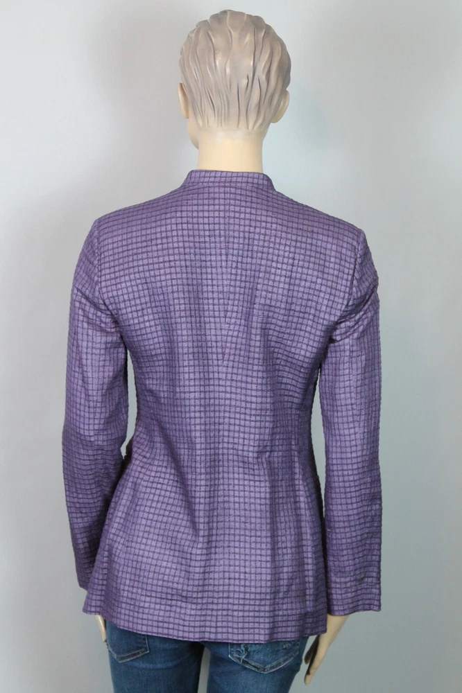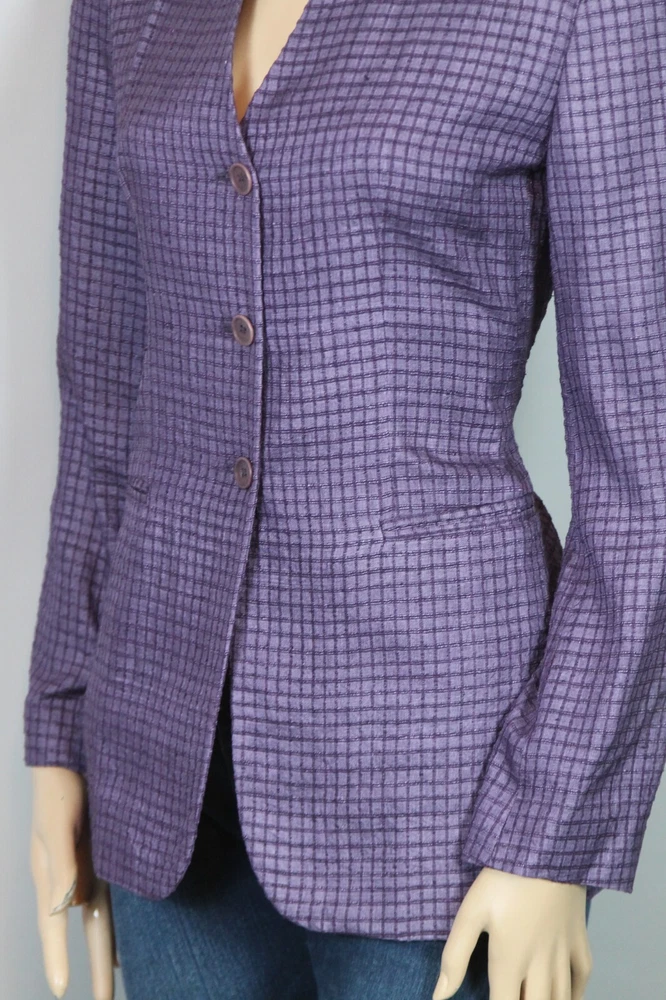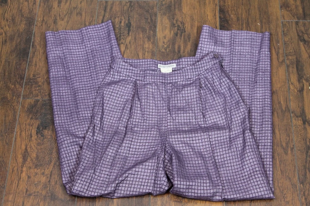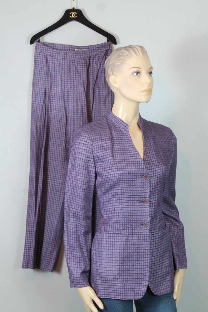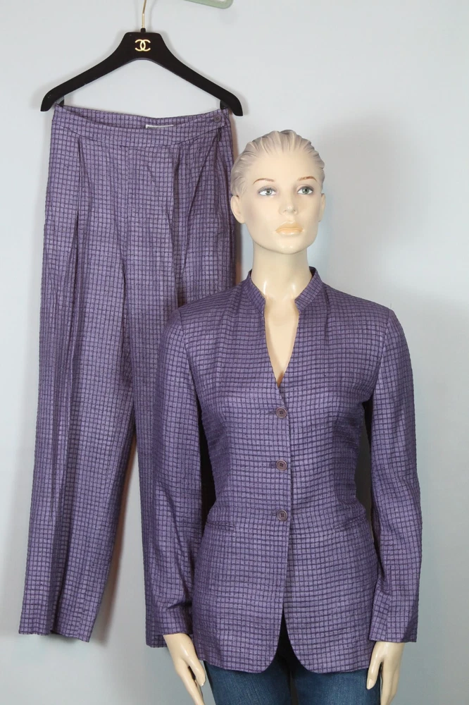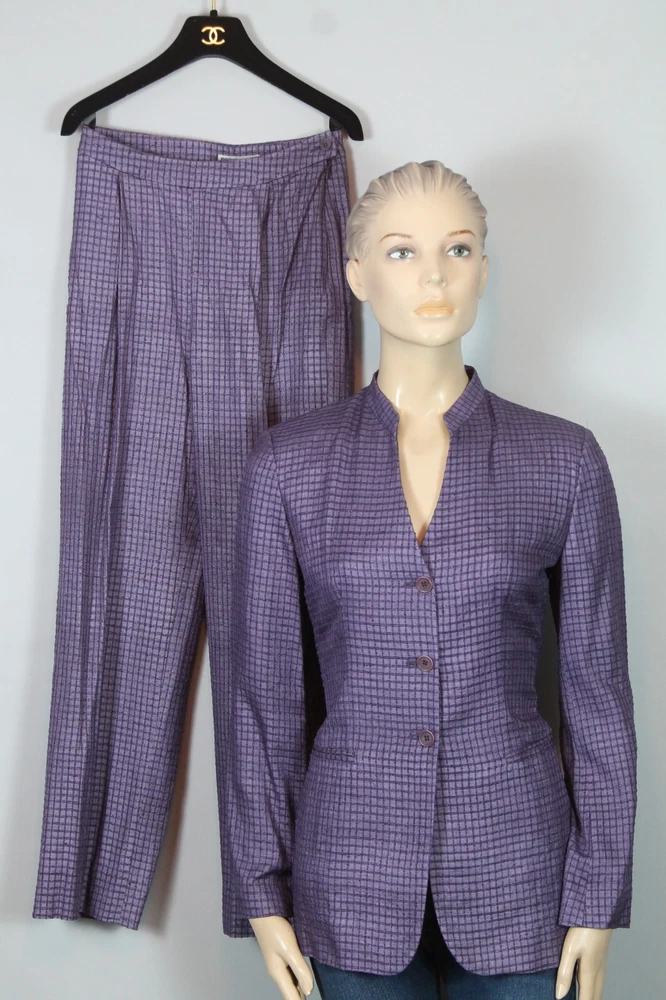 Elevate your professional wardrobe with EMPORIO ARMANI GIORGIO ARMANI Made in Italy pure silk suit set, a testament to classic Italian elegance. The ensemble includes a well-tailored blazer jacket with stunning design and matching pants, both in a sophisticated Iris purple color that lends confidence to any business setting. Crafted with meticulous attention to detail, this two-piece pant suit is designed to flatter. The suit is an embodiment of timeless style, seamlessly blending functionality with high fashion, perfect for the discerning woman who values both comfort and sartorial excellence. Size and Measurements Garment measured flat from side to side. 40 Jacket - Bust:19" Length:27" Sleeves:23.5" Pants - Waist:13" Hip:20" Inseam:29" Condition: Pre-owned great gently used condition. Original owned was a smoker, now suit is ozone treated to eliminate the odor. Please see detailed pics. If you have any questions or concerns, please don't hesitate to ask. (H/R) Track Page Views With Auctiva's Counter