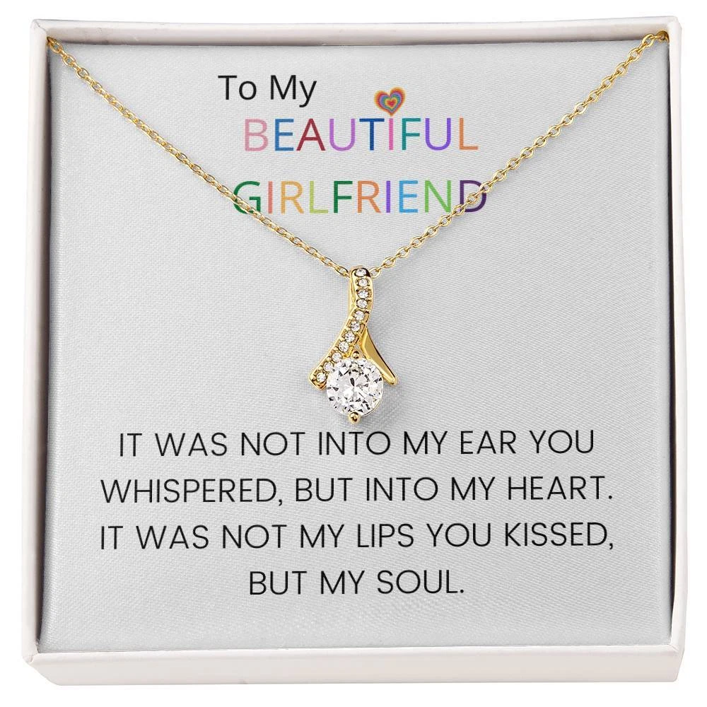 To My Beautiful Girlfriend It was not into my ear you whispered but into my heart. It was not my lips you kissed but my soul. Imagine her reaction when she opens this stunning gift! The Alluring Beauty necklace features a petite ribbon shaped pendant that is sure to dazzle your special someone. Whether it's a birthday or anniversary, make sure to get her a gift she will love for years to come. 14k white gold finish or 18k yellow gold finish over stainless steel 7mm cubic zirconia Pendant dimensions: 0.8" (20mm) height / 0.4" (10mm) width Adjustable length: 18" - 22" (45.72 cm - 55.88 cm) Lobster clasp Your piece is lovingly packaged in a complimentary soft touch box for easy gifting. Elevate your presentation by upgrading to the mahogany style luxury box, which features a brilliant LED spotlight.