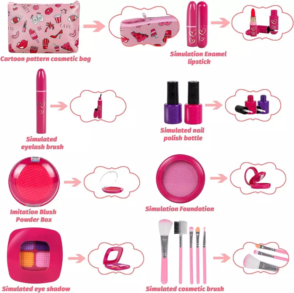 CONTACT US DIRECTLY FOR FREE & PREPAID RETURNS Girl Gifts Pretend Play Makeup Toys Beauty Set for Toddler Little Girls Age 3 4 Girl Gifts Pretend Play Makeup Toys Beauty Set for Toddler Little Girls Age 3 4 5 6-8 Kids Your Princess Niece Granddaughter Birthday Halloween Christmas (Fake Cosmetic 15Pcs Kits) Description Item model number RGMZ-1 Product Dimensions 8 x 5 x 1.18 inches Country of Origin China Item Weight 7 ounces Manufacturer recommended age 3 years and up Department Girls 👩👧👧【Pretend Make Up Looks Like Mom’s】Pretend makeup kit looks like real makeup cases but filled with colorful EVA foam, which comes with lipstick, lip gloss, blusher, eyeshadow, powder, makeup brushes. Without applying to skin, this toy makeup is perfect for baby girls who wants to be just like mom. Save Moms Expensive Cosmetics and Unleash Kids’ Creativity. ❤️【💯Safe Quality Bring More Fun💯】ASTM and CPC certificated Toddlers Makeup Kit. Non-toxic material with eco-friendly foam cosmetic toys with rounded edges to avoid injury and ensure children safe play and no mess to clean up, also don’t worry about toddler’s sensitive skin. 💄【Learn by imitating and pretending】Girls love to imitate their moms apply makeup. RONGGE play makeup set for toddlers is designed to inspire imaginary and creative play, allowing your little girls enjoy to ‘put makeup’ on herself, her dolls or other people. 🛍️【Package Include】The RONGGE pretend make up toys kits includes 15 total pieces: cosmetic bag with zipper, quad compartment bright eye shadow, bronzer and blush combo, lip gloss, eye catching foundation with mirror, makeup brush set, lipstick, and nail polishes. 💝【Best Gifts for Girls】Our fake makeup set is not a real cosmetic that there is a colored soft foam made of kid-safe foam and plastic instead of an actual. The kids make up sets is designed for 3 4 5, 6-8 year old toddler girls. Good choice for birthday, festival and Christmas as a gift for little girl. Let the imagination run wild and enjoy hours of play with a complete pretend make up set, designed especially for your little princess! Product Description RONGGE Girl Toys Makeup Kit for Your Little Princess to Pretend Play to Apply Makeup Children will imitate the behavior of adults. Children see their mothers doing makeup every day. They will pretend that they are also making up, but real cosmetics will damage the skin. You will like our makeup set toy because kids toy makeup have real makeup feelings and are safe. Made of non-toxic materials, it gives you and your children a more secure experience. Why choice RONGGE pretend make up set? If your little girl is obsessed with make up but she was 2. If your little girl is trying to waer your expensive cosmetics and mess everywhere. If you are worry about comestic makeup was not apply to your little girl’s skin. If you are looking for some kind of play makeup kit for your little girl. RONGGE pretend makeup set for little girls will be your idea choice. Package Include The RONGGE pretend make up toys kits includes 15 total pieces: cosmetic bag with zipper, quad compartment bright eye shadow, bronzer and blush combo, lip gloss, eye catching foundation with mirror, makeup brush set, lipstick, and nail polishes. Safe Quality Bring More Fun ASTM and CPC certificated Toddlers Makeup Kit. Non-toxic material with foam cosmetic toys with rounded edges to avoid injury and ensure children safe play and no mess to clean up, also don’t worry about toddler’s sensitive skin. Learn by imitating and pretending Girls love to imitate their moms apply makeup. RONGGE play makeup set for toddlers is designed to inspire imaginary and creative play, allowing your little girls enjoy to ‘put makeup’ on herself, her dolls or other people. Best Gifts for Girls The kids make up sets is designed for 3 4 5, 6-8 year old toddler girls. Good choice for birthday, festival and Christmas as a gift for little girl. Let the imagination run wild and enjoy hours of play with a complete pretend make up set, designed especially for your little princess! Fake but looks like real With realistic shape and shade, kids play make up kit looks and feels just like real makeup, but it completely fake and mess-free. Meets Safety Standards for Children’s Use Encourages imagination and creative play via pretend play makeup set with safety material. Unleash Kids’ Creativity Ideal for creative and imaginative play to aid in your child's healthy development. Girl Gifts Pretend Play Makeup Toys Beauty Set for Toddler Little Girls Age 3 4 5 6-8 Kids Your Princess Niece Granddaughter Birthday Halloween Christmas (Fake Cosmetic 15Pcs Kits) REVIEWS The product came very well packaged. I'm very happy. thank you for everything. Seller strongly recommended. This is great! I definitely recommend! Product looks amazing Delivery was fast. Excellent seller, great communication. I advise everyone