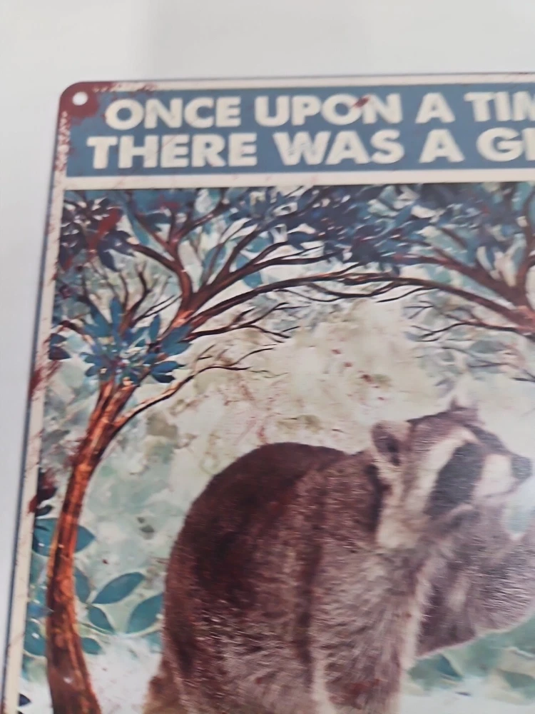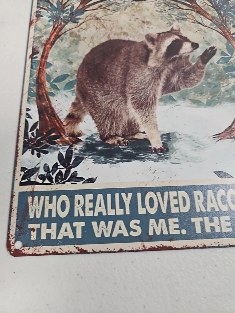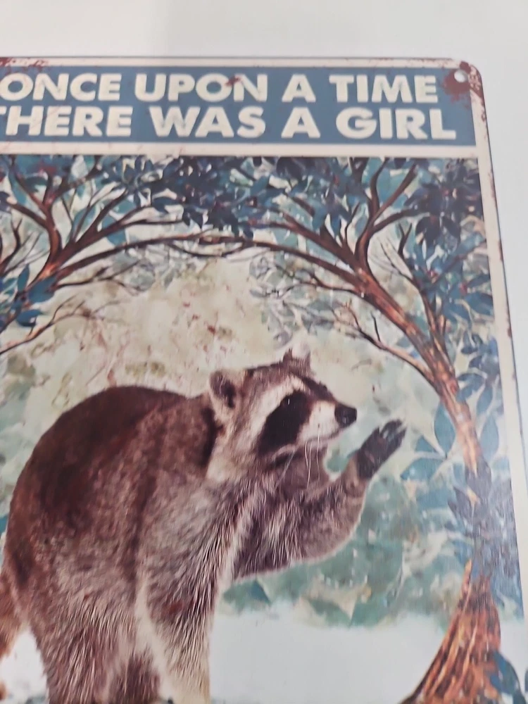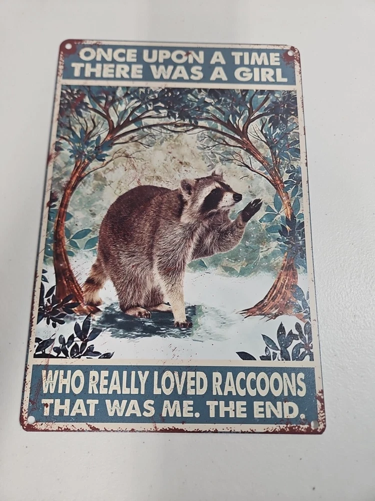This metal sign is a perfect addition to any room, whether it's your office, garage, or any other room. The sign features a girl who loved raccoons, with a rustic and primitive style that will surely capture the attention of anyone who sees it. The sign is made of high-quality metal, which ensures its durability and longevity. The sign is easy to mount, and it can be hung on the wall or door. It measures 12 inches in height and 8 inches in width, making it the perfect size for any space. The sign is also decorative and indoor-friendly, which makes it a great gift for anyone who loves raccoons or wants to add a touch of rustic charm to their home.
