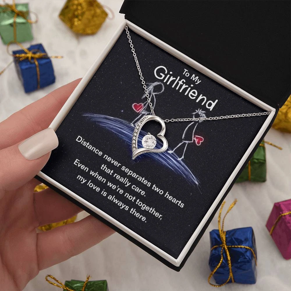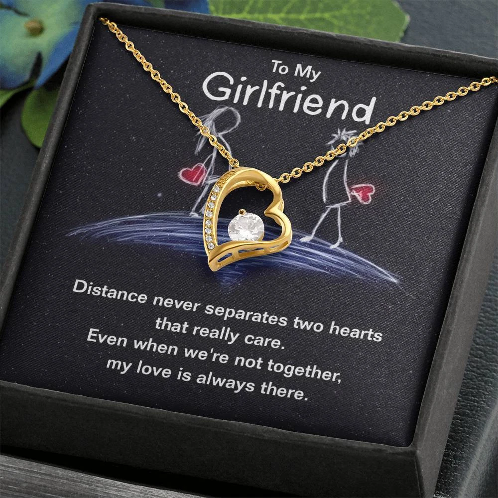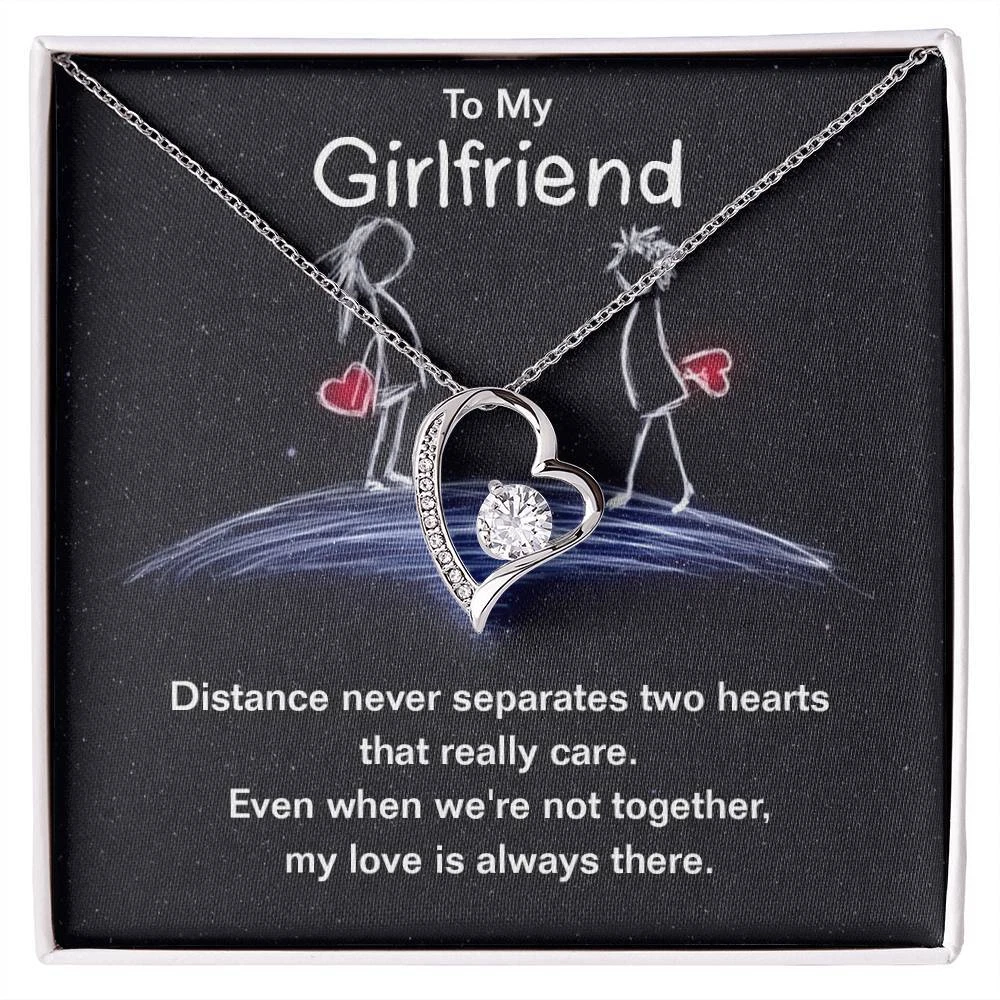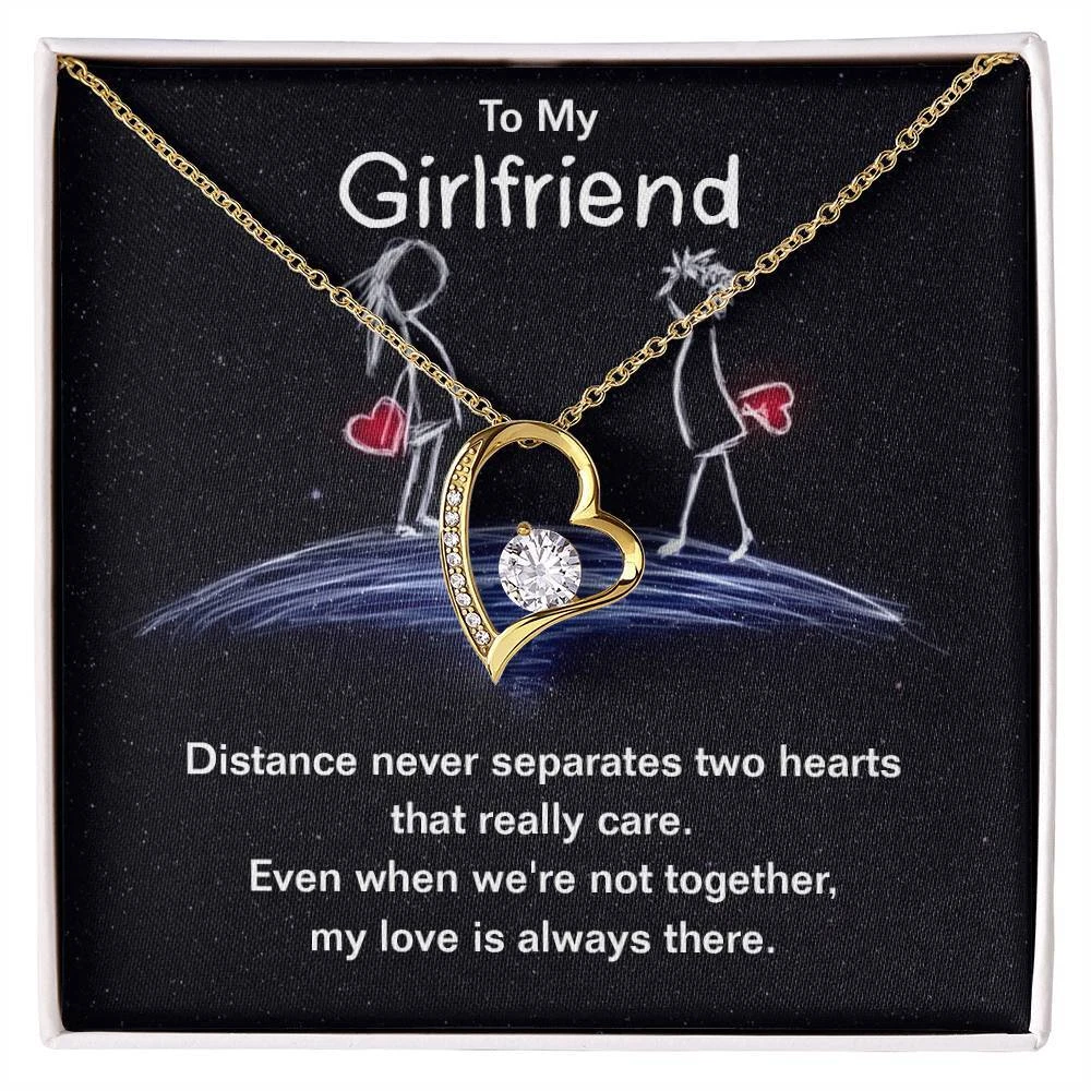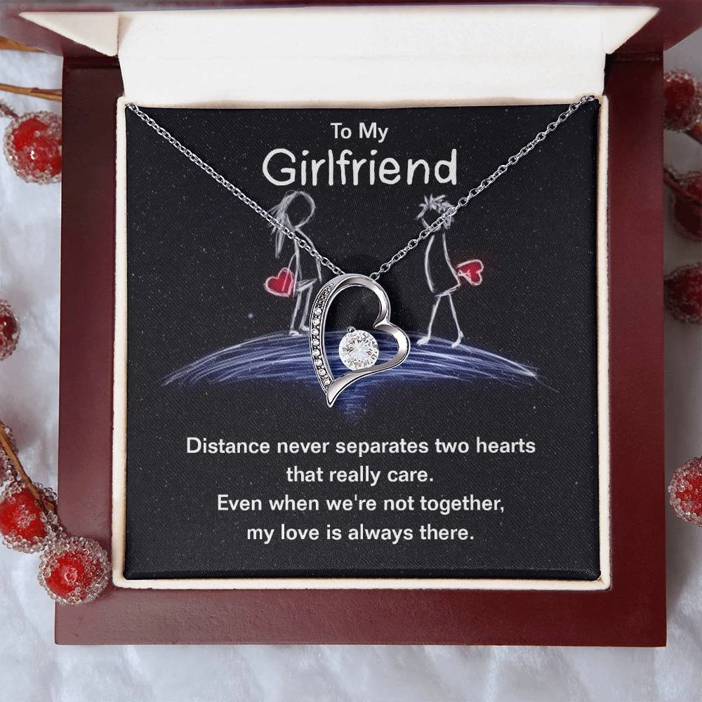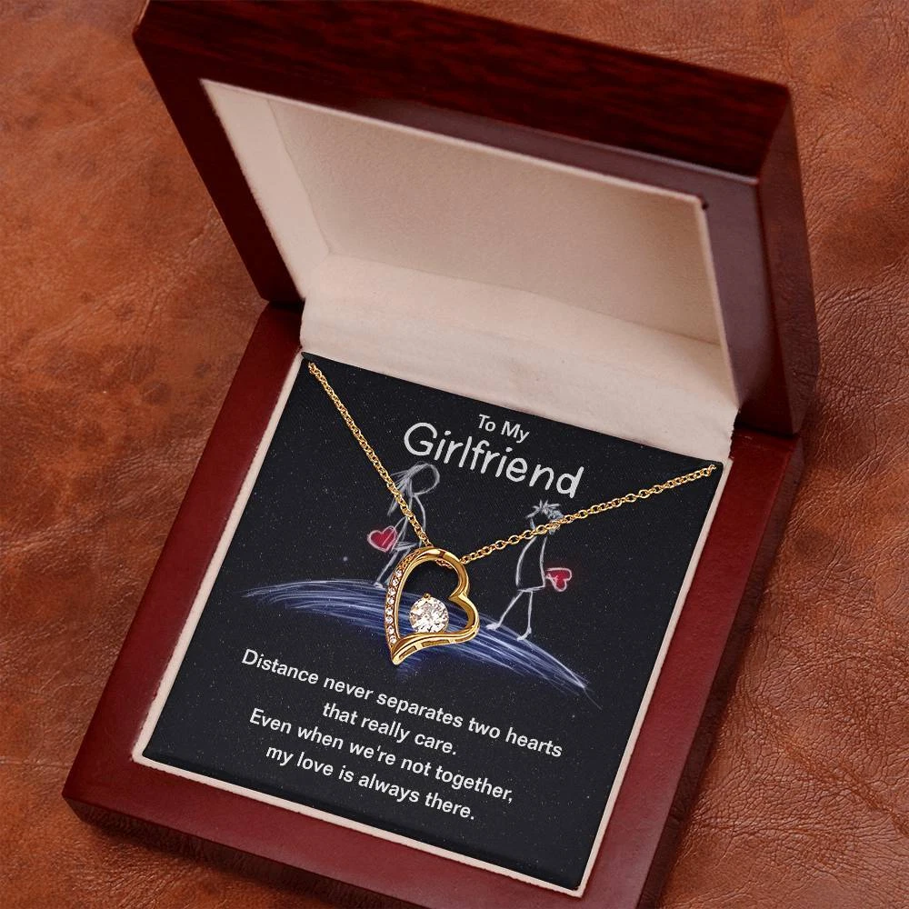The dazzling Forever Love Necklace is sure to make her heart melt! This necklace features a stunning 6.5mm CZ crystal surrounded by a polished heart pendant embellished with smaller crystals to add extra sparkle and shine. Beautifully crafted with either a white gold or yellow gold finish, be sure to give her a classic gift she can enjoy everyday. 14k white gold finish or 18k yellow gold finish 6.5mm round cut cubic zirconia stone Pendant dimensions: 0.8" (2.2cm) height / 0.7" (1.8cm) width Adjustable chain length: 18" - 22" (45.72cm - 55.88cm) Lobster clasp attachment Your piece is lovingly packaged in a complimentary soft touch box for easy gifting. Elevate your presentation by upgrading to the mahogany style luxury box, which features a brilliant LED spotlight.