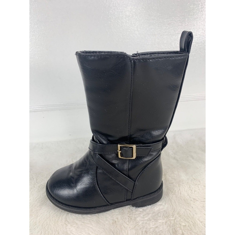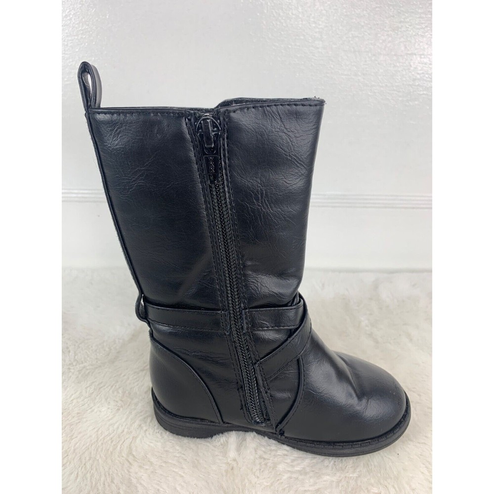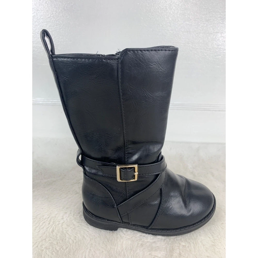 These mid-calf boots combine style and practicality, offering a sleek design with durable faux leather. A convenient side zipper ensures easy wear, while the buckle adds a fashionable touch. Suitable for various occasions and outfits, these boots provide comfort and elegance for young wearers. • Faux leather material • Mid-calf length • Side zipper closure • Buckle detail • Sturdy sole • Size 6 Slight scuffing on the sole.