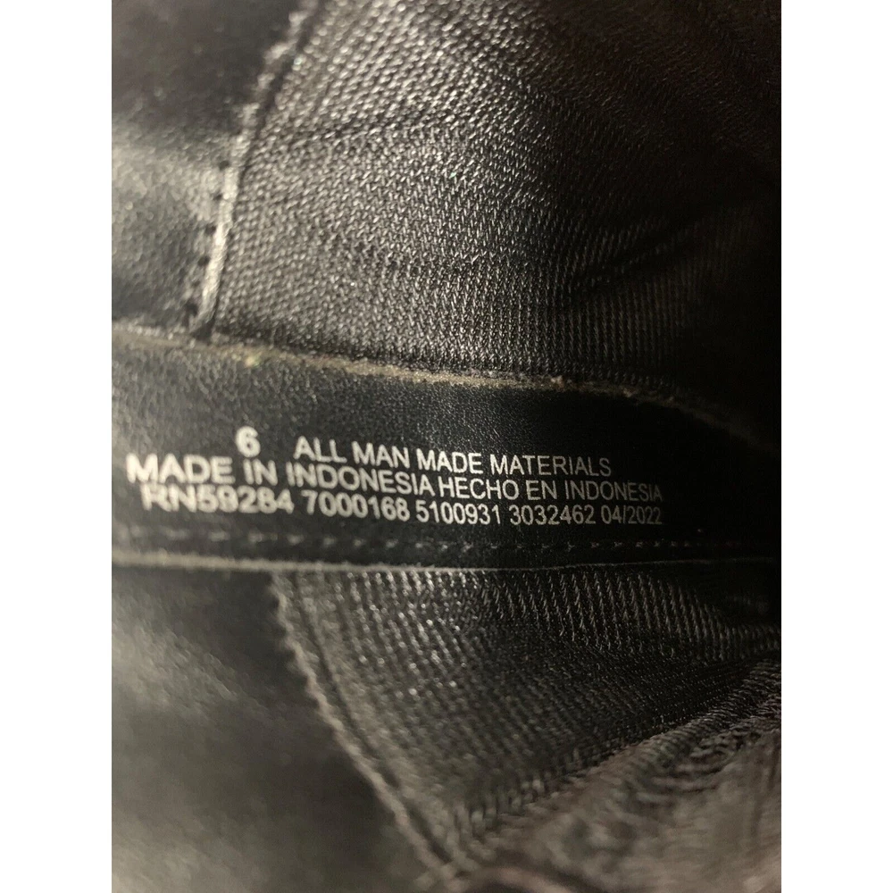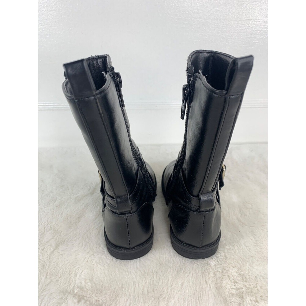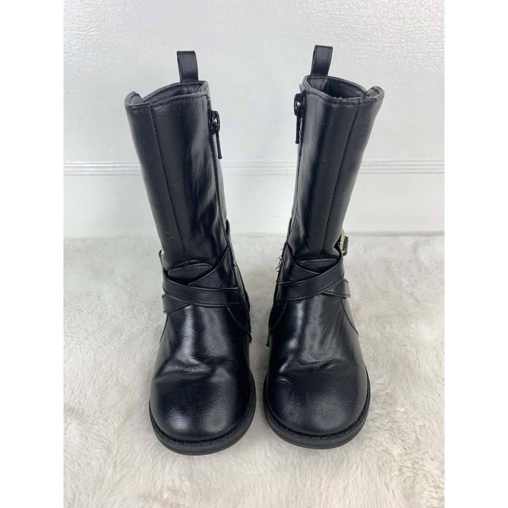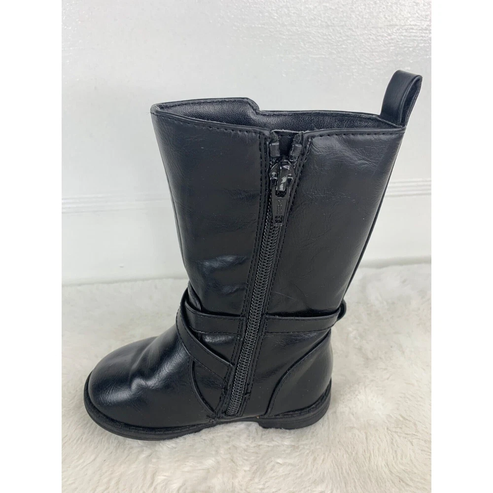 These mid-calf boots combine style and practicality, offering a sleek design with durable faux leather. A convenient side zipper ensures easy wear, while the buckle adds a fashionable touch. Suitable for various occasions and outfits, these boots provide comfort and elegance for young wearers. • Faux leather material • Mid-calf length • Side zipper closure • Buckle detail • Sturdy sole • Size 6 Slight scuffing on the sole.