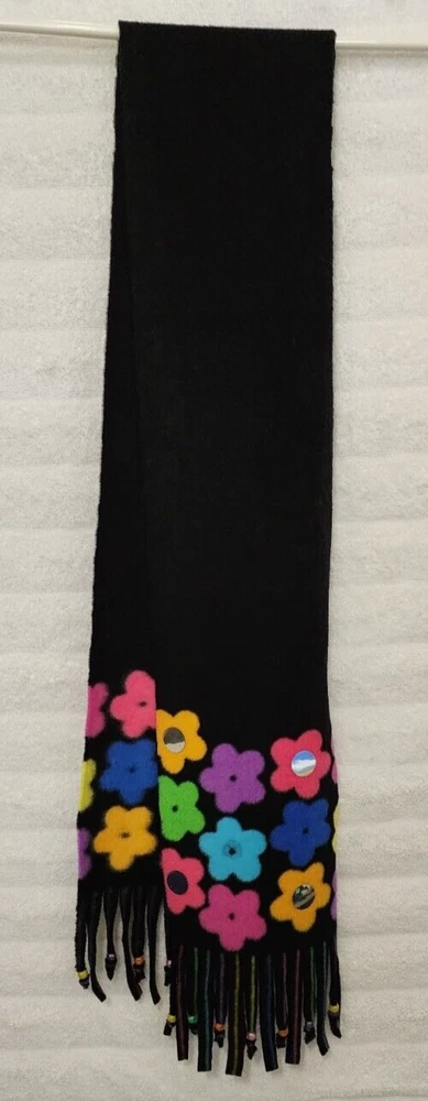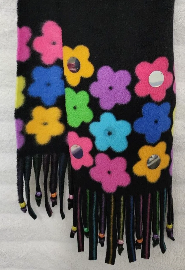 Girls Black w/ Colorful Flowers Fleece SCARF Sequins Fringe 58” L x 6 1/4” W This girls' scarf is a perfect addition to any winter or fall outfit. The black fleece material is accented with colorful floral details, making it a fun and playful accessory for any occasion. Measuring 58 inches in length and 6 1/4 inches in width, it's the perfect size to keep your little girl warm and cozy. The scarf features fringe edges, beaded accents, and sequin details, adding a touch of sparkle to the overall design. Whether she's wearing it to school or out with friends, this scarf is sure to make her smile. It's a great gift for any young fashionista who loves to accessorize.