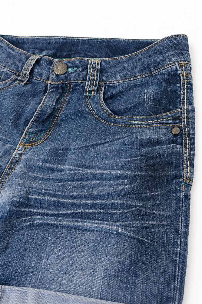 Cherokee Distressed 7" Denim Shorts Girls size Large (10-12) Cute everyday shorts with a fitted look. Medium wash blue denim with cuffed hems, contrast stitching, and classic 5-pocket styling. Pre-owned in good condition. There are tiny holes on the front and scratch marks near the left pocket. The rubber band used to adjust the waist is missing.