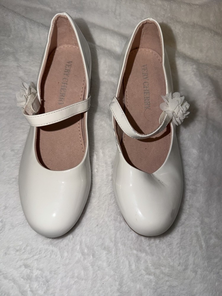Four pairs of girls dress shoes, size 4. Black leather, patent white, silver and pink. NEVER WORN