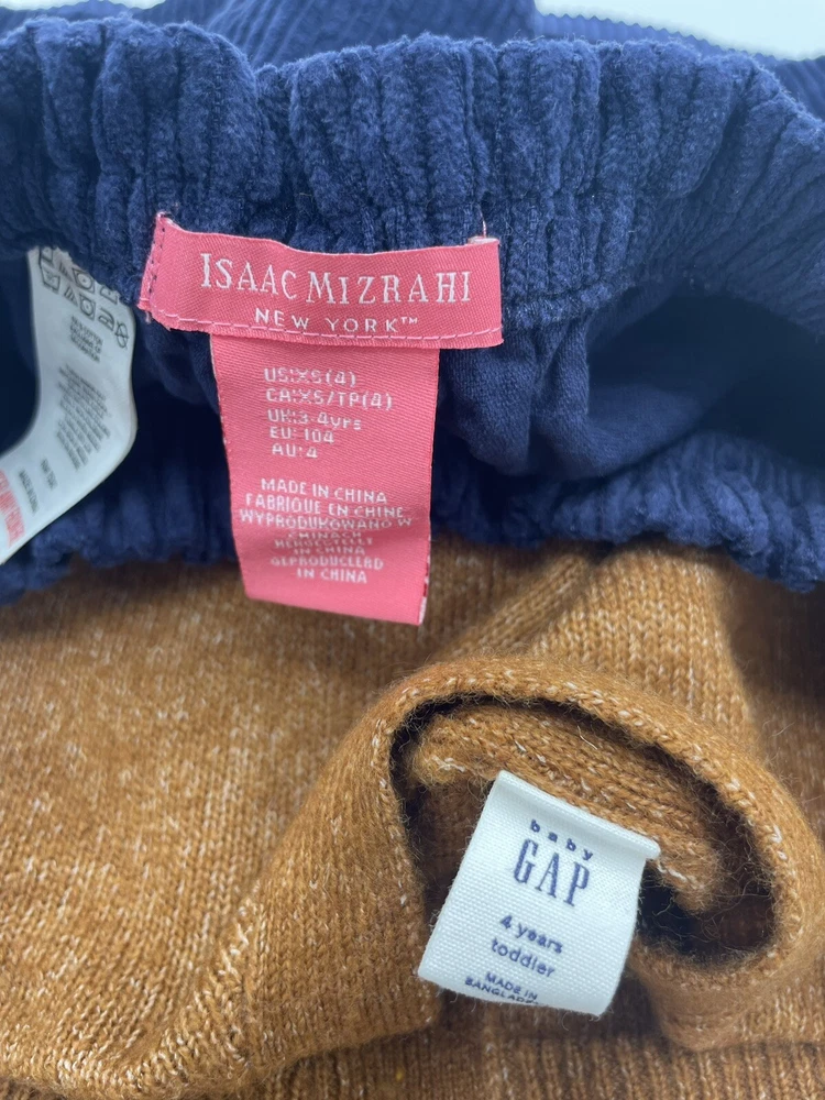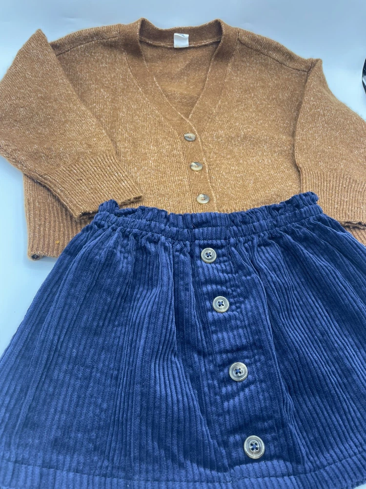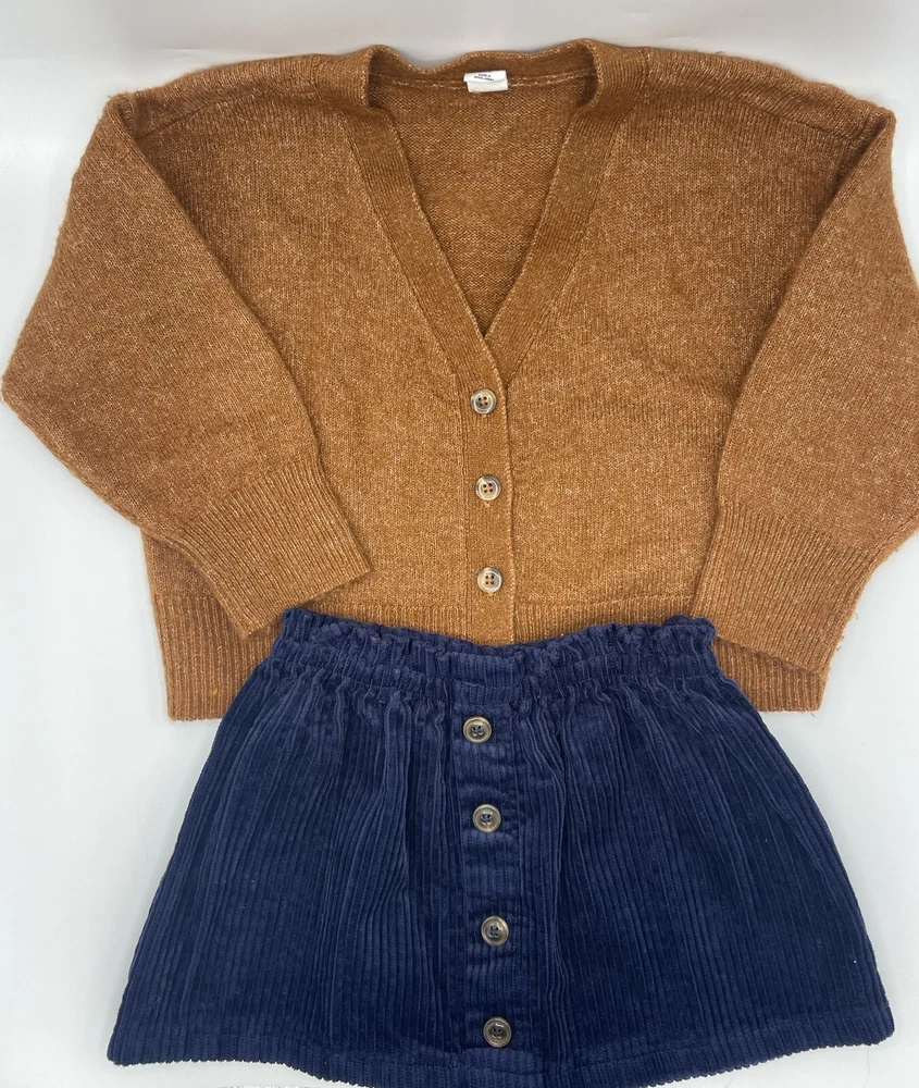 This two-piece outfit from Isaac Misrahi Gap Kids is perfect for any young girl's wardrobe. The camel and navy colors make it a versatile addition to any outfit, while the corduroy fabric type gives it a preppy and stylish feel. The long sleeves and button accents add a touch of sophistication, making it suitable for both casual and party occasions. The set includes a cardigan and skirt, both in size 4. It's ideal for school or any other activity, and its regular fit ensures comfort and ease of movement. Whether it's fall or winter, this outfit is sure to keep your child warm and stylish. Very nice preowned condition. See photos for condition details. Thank you!