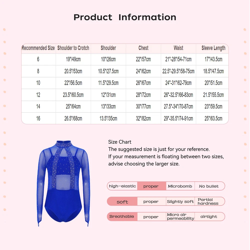 Click Here to New Arrivals New Arrivals Hot Sale Women's Dresses Women's Swimsuit Girls'Dresses Girls'Sleepwear Girls'Swimwear Boys'Clothing Baby Clothing Girls Leotard Sparkle Gymnastics Shiny Bodysuit Stage Performance Activewear #1 Set Include : 1Pc Leotard, 1Pc Camisole Condition : New with tags Material : 55% Nylon, 30% Polyester, 15% Spandex Features: Crafted from a blend of nylon, polyester, and spandex, this leotard offers excellent stretch and flexibility, allowing for unrestricted movement during gymnastics or dance. The mock-neck and long-sleeve design is both trendy and practical, providing extra coverage and a modern look. The cutout back adds a touch of uniqueness, making your little girl stand out in the performance. The sheer mesh bodice with shiny rhinestones bring a glamorous and eye-catching element, perfect for stage performances. The matching spaghetti straps camisole provide extra coverage. Suitable for various dance and gymnastics events, as well as for practice sessions. Size Chart : The suggested size is just for your reference. If your measurement is floating between two sizes, advise choosing the larger size. (Measurements shown in the size chart refer to item measurements, not body) Tag No. Recommended Size Shoulder to Crotch Shoulder Chest Waist Sleeve Length 6 6 19"/49cm 10"/26cm 22"/57cm 21"-28"/54-71cm 17"/43.5cm 8 8 20.5"/53cm 10.5"/27.5cm 24"/62cm 22.5"-29.5"/58-75cm 18.5"/47.5cm 10 10 22"/56.5cm 11.5"/29.5cm 26"/67cm 24"-31"/62-79cm 20"/51.5cm 12 12 23.5"/60.5cm 12"/31cm 28"/72cm 26"-32.5"/66-83cm 21.5"/55.5cm 14 14 25"/64cm 13"/33cm 30"/77cm 27.5"-34"/70-87cm 23"/59.5cm 16 16 26.5"/68cm 13.5"/35cm 32"/82cm 29"-35.5"/74-91cm 25"/63.5cm Friendly Tips: The size is measured by hands, please allow 1-3cm errors of measurement. Photo color might be a little different from the actual product due to color display of different monitors. #2 Set Include : 1Pc Ballet Underwear Condition : New with tag Material : Cotton, Spandex Features : Girl’s Ballet Dance Briefs Underwear. Elastic waistband, high leg cut design. Stretchy fabric, soft and comfortable to wear. Suitable for dance class, gymnastic exercise, yoga, etc. Size Chart : The suggested age and height is just for your reference. If your measurement is floating between two sizes, advise choosing the larger size. (Measurements shown in the size chart refer to item measurements, not body.) Tag No. Recommended Size for Kids Waist Length 110 2-3 16.0-23.0"/40-58cm 8.0"/21cm 120 3-4 16.5-24.0"/42-60cm 8.5"/22cm 130 5-6 18.0-25.0"/46-64cm 9.0"/23cm 140 7-8 19.0-26.0"/48-66cm 9.0"/24cm 150 8-10 20.0-27.0"/50-68cm 10.0"/25cm 160 10-12 21.0-29.0"/54-74cm 10.0"/26cm Friendly Tips: The size is measured by hands, please allow 1-3cm errors of measurement. Photo color might be a little different from the actual product due to color display of different monitors. Product names are trademarks of the listed manufacturer or other owners, and are not trademarks of alwaysforbauhinia. The manufacturer does not necessarily endorse use of these products. Payment Methods Terms and Conditions Shipping Combined shipping is limited only to the items listed under this seller account : rakendw All the free shipping item don't offer discount. We REDUCE US$1.00 on shipping cost for each additional item. Please contact us to send you the update invoice once you finish your purchase. Please note that only the item in same currency can be combined.Please note that we do NOT offer shipping discount for bidding orders or item value less than $5.00 International Orders: The buyer is responsible for any applicable import duties and local taxes. Please verify with your customs before making your purchase. Please verify your address during checkout. We are not responsible for any wrong or undeliverable addresses. Your item will be sent to your ebay address. Please make sure your ebay address is correct. Any non- received items caused by invalid address are not in our full refund or replacement policy. All items will be shipped within 1 business day after full payment is received. It takes about 10-20 days to US UK AU DE; about 20-35 days to other countries.Shipping may influenced by holidays, events and other uncertainties. We could not guarantee the arrival time. If you can't accept the shipping time, please check the extra charge with us to ship your item via express. Please check my other products below: Boys Circus Ringmaster Costume Kids Magician Showman Tailcoat Halloween Dress Up USD 17.49 US~ Women Glitter Belly Dance Bra Top Tassels Bras Halloween Party Performance USD 8.49 US~ Womens Sequin Tassel Jumpsuit 70s 80s Disco Dance Leotard Rompers Clubwear USD 8.59 Womens Sheer Mesh Patchwork Metallic Shiny Babydoll Bodysuit Gymnastics Leotards USD 8.99 Women One Piece Jumpsuits Long Sleeve Leotard Music Cycling Halloween Cosplay USD 8.99 Womens Shiny Metallic Short Sleeve Bodysuit High Cut Leotard Jumpsuit Clubwear USD 6.99 US Mens Adult Incontinence Leak-protection Underwear Cover Pant Pvc Tear-away USD 9.99 Women's Sequin Crop Top Long Sleeve Shoulder Epaulet Front Zipper Dance Jacket USD 8.99 Women's Metallic Shiny Back Zipper Bodysuit Fly Sleeve Leotard Jumpsuit Clubwear USD 9.99 Womens Shiny Metallic Tassel Long Sleeve Jacket Turn-Down Collar Cropped Coat USD 7.99 US Womens Pu Leather Lapel Glossy Jacket Wetlook Open Front Long Trench Coat USD 11.99 Womens PU Leather Front Zipper Slit Sleeveless Wetlook Bodycon Club Mini Dress USD 8.99 Women Mythical Satin Loose Harem Pants Arabian Princess Costume Lantern Trousers USD 7.99 Women's Bell Bottom Pants 70s Disco Style Shiny Sequin Trim Club Party Trousers USD 9.99 US Womens Structured Shoulder Boards Crop Jacket Metallic Long Sleeve Crop Top USD 9.99 Women's Wet Look Clubwear Top Pu Push-up Underwire Short Sleeve Glossy Crop Top USD 7.99 USU Women Bodycon Teddy Babydoll Nightwear Hollowing Out Breast Teddy Bodysuit USD 7.99 US Womens Pu Leather Mini Dress Bodycon Hollow Out Lace Lingerie D