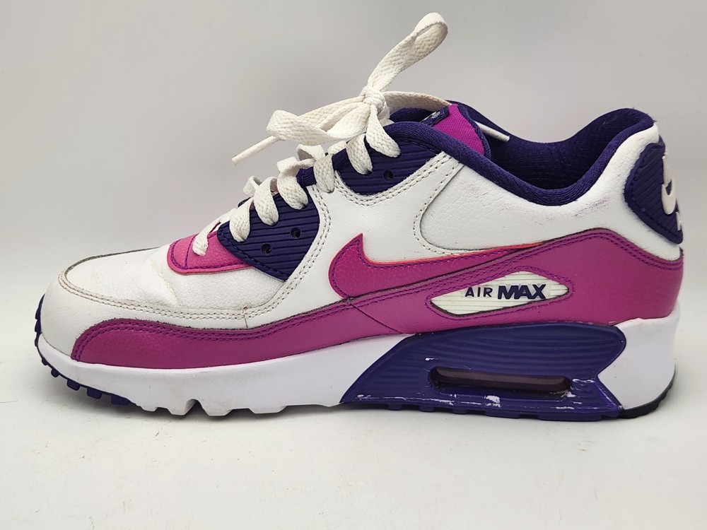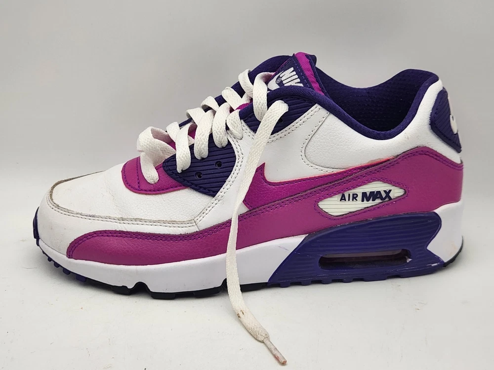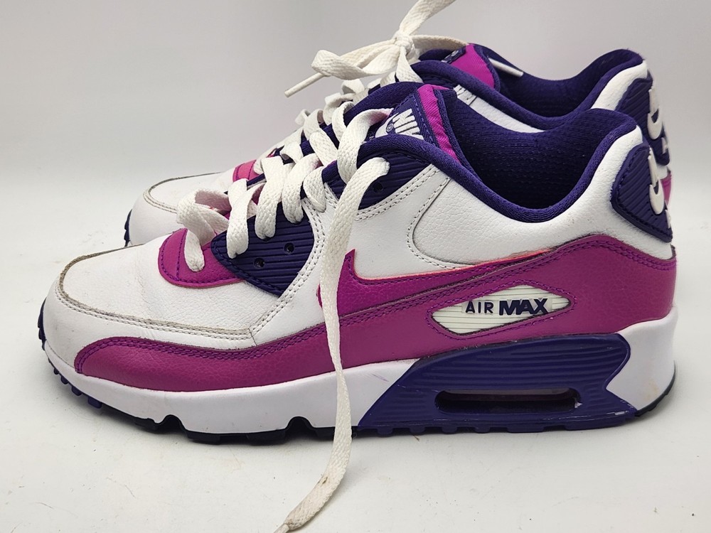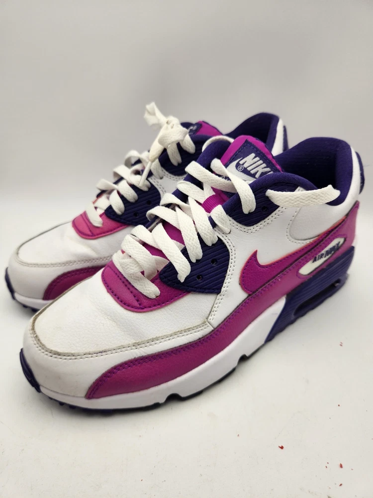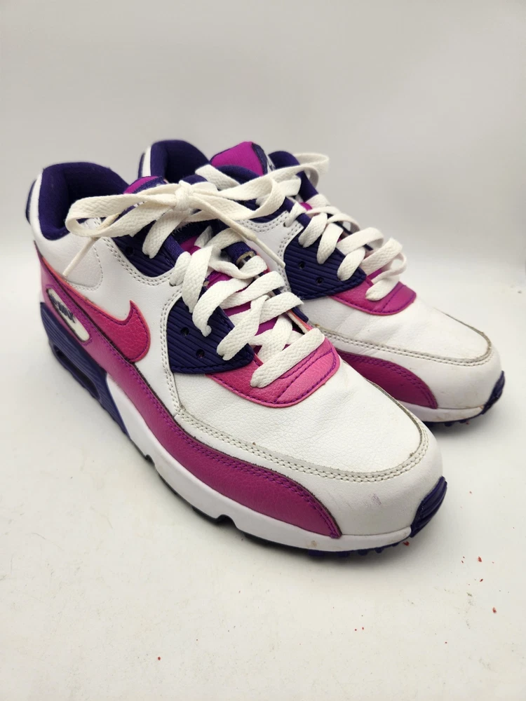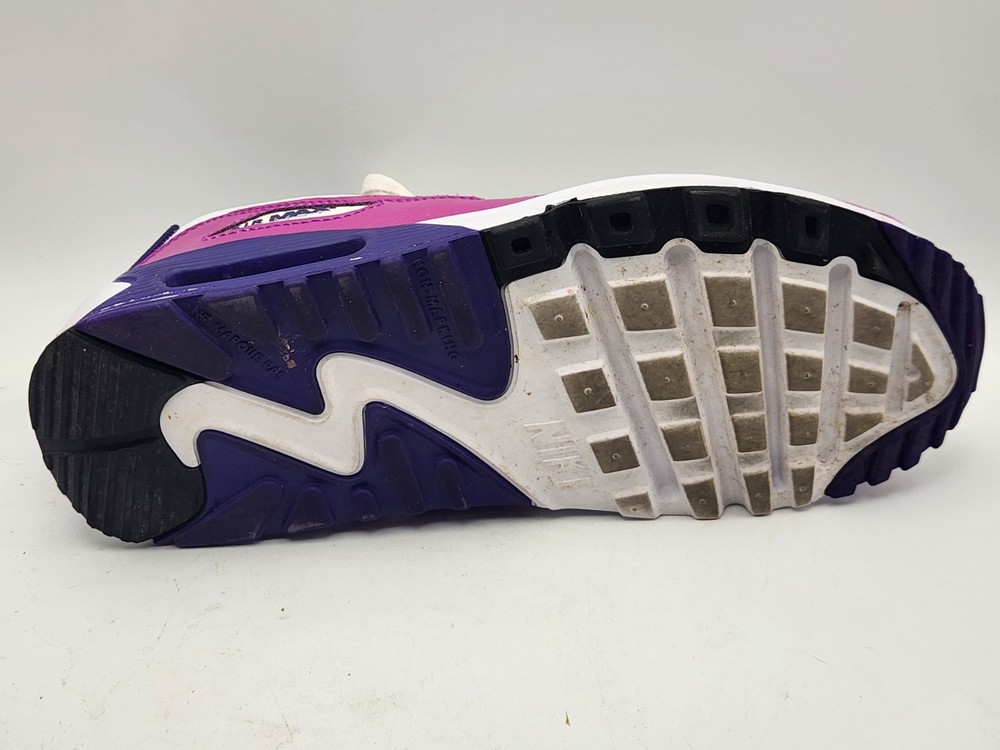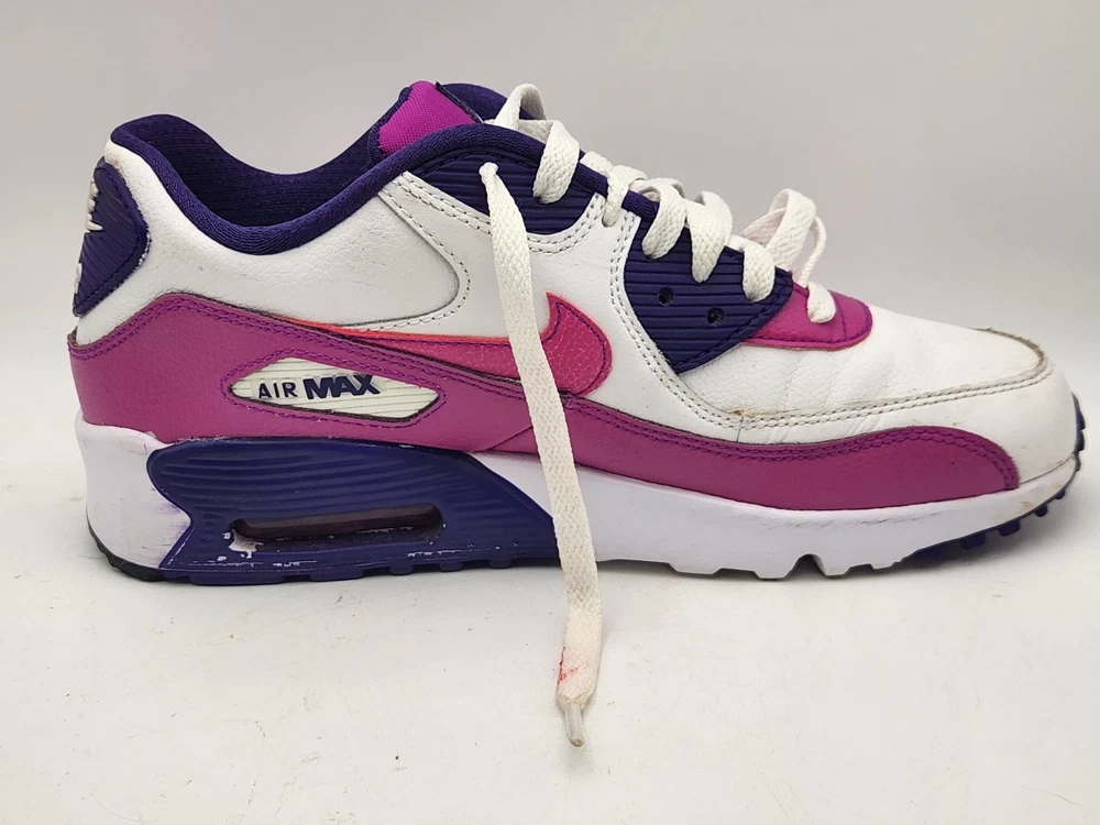 These Girls Nike Air Max 90s in size 6.5Y are the perfect combination of style and comfort for young athletic girls. With a low-top design, round toe shape, lace-up closure, and rubber cleat type, these shoes are ideal for activewear occasions like running and jogging. The Nike Air Max 90 model features moderate cushioning level and logo accents, making them a trendy choice for the 90s-themed fashion. Perfect for summer, fall, and spring seasons, these sneakers are a must-have for any active young girl's wardrobe. See pictures closely before purchasing. Nice! Thanks for looking.A22