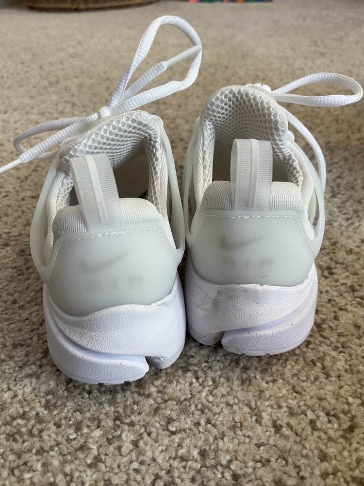 The Girls Nike Air Presto Size 3 is a stylish and comfortable sneaker designed for athletic activities. Featuring a round toe shape, lace-up closure, and flat heel, these shoes are perfect for active girls who need moderate cushioning. The mesh fabric type provides breathability, making them ideal for summer, fall, and spring seasons. The rubber outsole and foam insole offer durability and support for all-day wear. With the iconic Nike Air Presto model and signature logo accents, these white sneakers are a fashionable choice for young athletes.