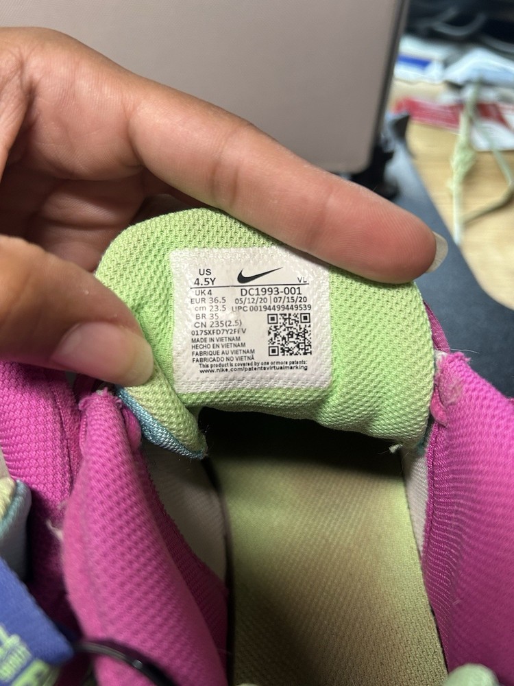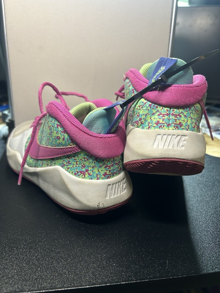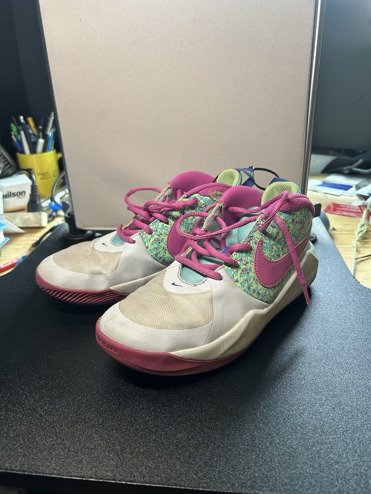 These Girls Pink and Green Nike Basketball Shoes in youth size 4.5 are perfect for young athletes looking to hit the court in style. With a solid pink color and round toe shape, these lace-up sneakers feature Nike's iconic logo as accents. Made with mesh fabric and rubber outsole, they offer breathability and traction for basketball performance during the summer, fall, and spring seasons. Perfect for active wear, these sneakers are a great choice for young girls wanting to make a statement on the basketball court.