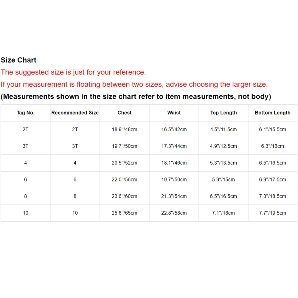 Click Here to New Arrivals New Arrivals Hot Sale Women's Dresses Women's Swimsuit Girls'Dresses Girls'Sleepwear Girls'Swimwear Boys'Clothing Baby Clothing Girls Set Suits Swimsuit Padded Swimwear Sleeveless Briefs Swimming Shorts Surf #1 Set Include : 1Pcs Girls Swim Top, 1Pc Swim Bottoma, 1Pc Cover UP Skirt Condition : Brand New Material : 82% Polyester, 18% Spandex Features : Made of polyester and spandex, soft and gentle to skin, keep girls feel breathable and comfortable when wearing. 3Pcs of bikini top, bikini bottoms and cover up mesh skirt for girls, vivid floral print make girls more beautiful. Designed with adjustable straps, soft chest pads, high waist, breathable mesh lining and front split mesh skirt. Cover up skirt can better block the sun rays and provide privacy. Quickly-dry fabric keeps girls feel cool and dry. Suitable for a variety of water activities such as swimming, bathing, surfing, beach, vacasion, pool party, hot spring, etc. Size Chart The suggested size is just for your reference. If your measurement is floating between two sizes, advise choosing the larger size. (Measurements shown in the size chart refer to item measurements, not body) Tag No. Recommended Size Chest Tops Length(Excluded Straps) Skirt Waist Skirt Length Briefs Waist Briefs Length 9Y 8-9 24.4’’/62cm 7.9’’/20cm 22.0’’/56cm 10.6’’/27cm 22.0-27.6’’/56-70cm 9.8’’/25cm 10Y 10-11 25.2’’/64cm 8.3’’/21cm 22.8’’/58cm 11.4’’/29cm 23.6-30.7’’/60-78cm 10.2’’/26cm 11-12Y 11-12 26.8’’/68cm 8.7’’/22cm 23.6’’/60cm 12.2’’/31cm 24.4-31.5’’/62-80cm 10.6’’/27cm 13-14Y 13-14 28.3’’/72cm 9.1’’/23cm 25.2’’/64cm 13.4’’/34cm 25.2-32.3’’/64-82cm 11.0’’/28cm Friendly Tips: The size is measured by hands, please allow minor error of measurement. Photo color might be a little different from the actual product due to color display of different monitors. #2 Set Include : 1Pc Girls Swimming Top, 1Pc Briefs Condition : Brand New Material : Polyester Features : 2Pcs Girls Spaghetti Straps Criss Cross at Rear Ruffle Hem Tube Top with Bottom Set Swimwear Suits. Size Table means age ranges for girls, but they are for general guidance only. Spaghetti straps, criss cross at rear, lining for better protection, ruffle hem adorned. Made of polyester material, smooth, soft, quickly dry, comfortable and breathable to wear. Perfect for tropical trip, beach holiday, pool party, swimming, bathing, and other water occasions, etc. Size Chart The suggested size is just for your reference. If your measurement is floating between two sizes, advise choosing the larger size. (Measurements shown in the size chart refer to item measurements, not body) Tag No. Recommended Size Chest Waist Top Length Bottom Length 2T 2 18.9’’/48cm 16.5’’/42cm 4.5’’/11.5cm 6.1’’/15.5cm 3T 3 19.7’’/50cm 17.3’’/44cm 4.9’’/12.5cm 6.3’’/16cm 4 4 20.5’’/52cm 18.1’’/46cm 5.3’’/13.5cm 6.5’’/16.5cm 6 6 22.0’’/56cm 19.7’’/50cm 5.9’’/15cm 6.9’’/17.5cm 8 8 23.6’’/60cm 21.3’’/54cm 6.5’’/16.5cm 7.3’’/18.5cm 10 10 25.6’’/65cm 22.8’’/58cm 7.1’’/18cm 7.7’’/19.5cm Friendly Tips: The size is measured by hands, please allow minor error of measurement. Photo color might be a little different from the actual product due to color display of different monitors. Product names are trademarks of the listed manufacturer or other owners, and are not trademarks of alwaysforbauhinia. The manufacturer does not necessarily endorse use of these products. Payment Methods Terms and Conditions Shipping Combined shipping is limited only to the items listed under this seller account : alwaysforbauhinia All the free shipping item don't offer discount. We REDUCE US$1.00 on shipping cost for each additional item. Please contact us to send you the update invoice once you finish your purchase. Please note that only the item in same currency can be combined.Please note that we do NOT offer shipping discount for bidding orders or item value less than $5.00 International Orders: The buyer is responsible for any applicable import duties and local taxes. Please verify with your customs before making your purchase. Please verify your address during checkout. We are not responsible for any wrong or undeliverable addresses. Your item will be sent to your ebay address. Please make sure your ebay address is correct. Any non- received items caused by invalid address are not in our full refund or replacement policy. All items will be shipped within 1 business day after full payment is received. It takes about 10-20 days to US UK AU DE; about 20-35 days to other countries.Shipping may influenced by holidays, events and other uncertainties. We could not guarantee the arrival time. If you can't accept the shipping time, please check the extra charge with us to ship your item via express. Please check my other products below: Kids Girl's Bathing Suits Cover Up Top And Bottoms Skirt Beach Swimsuit Pool USD 8.59 Womens Vest Blouse Top Tank Camisole Metallic Low Neck Ruched Clubwear Shirt USD 5.39 Adult Unisex Fake Hip Pad Nude Shapewear Soft Buttocks Enhancers Plump Sexy USD 6.99 Men's Jackets Athletic Blouse Zip-up Overcoat Jazz Vest Casual Coat Sparkly USD 8.59 Womens Nipple Party Stickers Props Chain Valentine Body O-ring Halter Stage New USD 6.99 Kids Girls Outfit Dress Dancewear Sparkly Leotard Splice Costumes Long Sleeves USD 7.99 Kids Girls Bodysuit Tutu Jumpsuit Ballet Leotards Figure Costume Decorated Mesh USD 10.69 Anime Cosplay Costume Christmas Rainbow Wig Nightclub Wigs Colorful Party Props USD 9.99 Kids Boys Jacket Halloween Overcoat Ring Outwear Circus Blazer Vampire Coat USD 9.59 Kids Girl's Bodysuit Jazz Rompers V-front Jumpsuit And Shorts Ballet Training USD 8.59 Womens Nipple Stickers Round Bra Covers Stage Breasts Pasties Rave Bra Pasties USD 5.99 Kids Girls Leotard 6-16 Years Set Ballet Activewear With Boxer Shorts Tracks