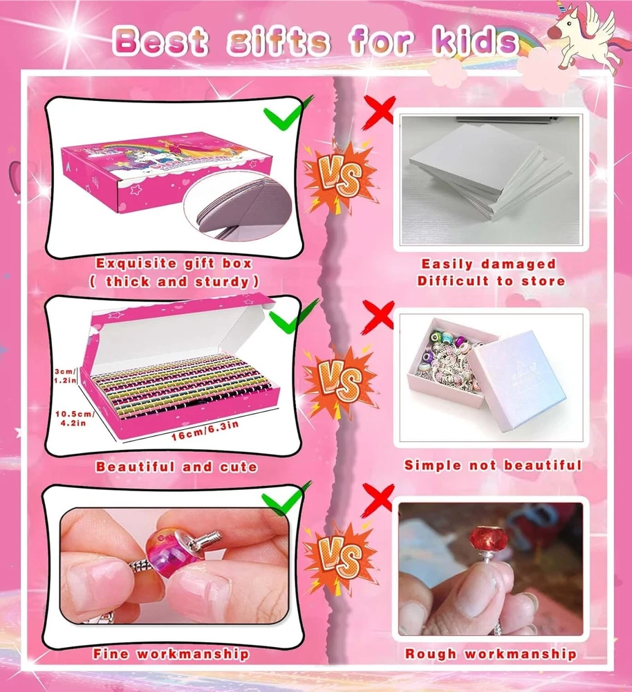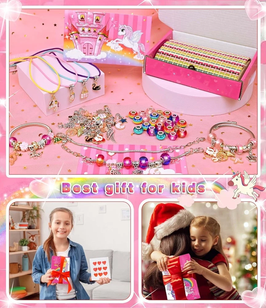 Girls Toys Age 6-12 Gifts for 5 6 7 8 9 10 Year Old Girls Arts and Crafts New Color: Colorful unicorn beautiful bracelet Bracelet making kit for girls kids: 4 necklace cords, 10 colored bead, 4 colored glass beads, 4 rainbow beads, 18 large hole metal beads, 18 pendants, 2 silver plated chains, 1 stainless steel bracelet, 1 spring bracelet, 1 User manual, 1 color wooden box. The colorful accessories can let girls match. Can let them match out four different styles of bracelets and four necklaces, jewelry making kit, girls gifts 8-12 years old. Exquisite Christmas gifts. Girls toys. Girls gifts 6 7 8 9 10 11 12 years old: unique color box design, exquisite color wooden boxes, beautiful accessories, beautiful bracelets and necklaces Cords. These are beautiful girls' Christmas gifts, birthday gifts, party gifts, children's day gifts, bracelet making gifts for girls kids teens. Gifts for Teen Girls. Perfect gift for girls kids age 5-12. Crafts for kids 6-8. Teenager gifts for girls. Quick collocation of beautiful bracelets: Beautiful bracelets in three styles. Bracelet with heart-shaped lobster clasp: just rotate and screw out the lobster clasp, and install accessories such as pendants into the bracelet. Stainless steel bracelet: just put accessories into it. Spring bracelet: rotate and unscrew the spring, install the accessories, and then rotate the spring again to complete. Charm Bracelet Making Kit for Girls. Toy for girls age 8-12. Gifts for Girls Kids Teens. Exquisite color box and wooden box: Exquisite unicorn color box and colorful wooden storage box are the best gifts for girls, and also convenient for storing accessories. Kids Jewelry Making Kits is a beautiful Christmas gift and birthday gift. Girls toys age 5 6 7 8 9 10 11. Gifts for teenage girls. Gifts for 6 7 8 9 10 11 year olds girls. Teenage girls gifts. Toys for 6-12 year olds girls. Toys for girls. Arts and crafts for girls kids ages 5 6 7 8 9 10 11 12: Colorful pendants and exquisite colored beads can let girls match beautiful bracelets and necklaces, Like a beautiful handicraft. Kids' craft kits. Crafts for Girls Ages 8-12. DIY Craft for Girls. Crafts for kids 6-8. Christmas gifts for kids. Teen girls gift ideas. Craft kits for girls age 8-10. Bracelet making kit for girls. Girls toys age 6 7 8 9 10 11.