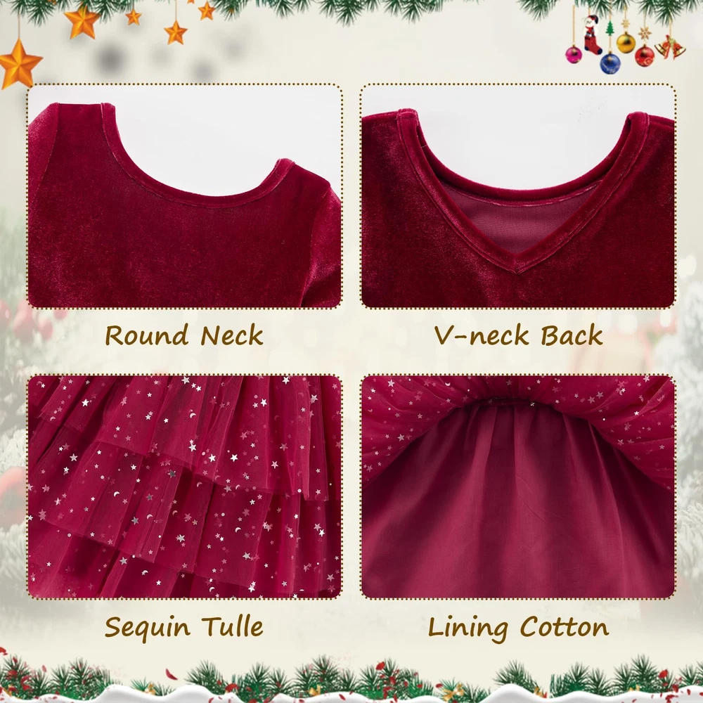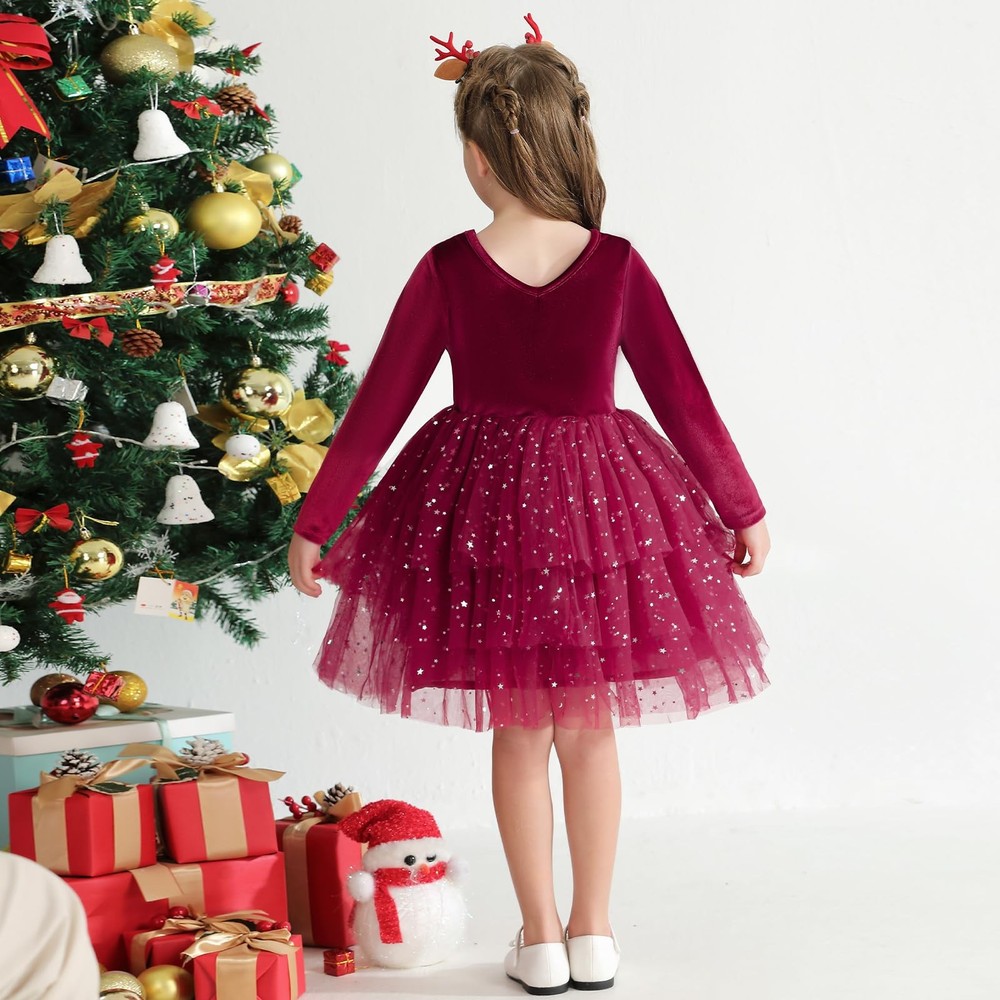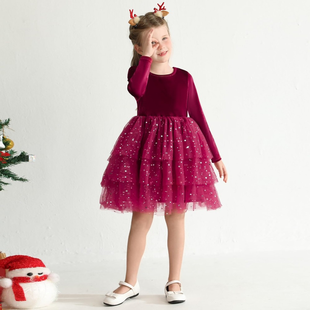 Girls Velvet Dress Fall Winter Clothes Long Sleeve Sequin Tulle Tutu Twirl Party Dresses for Baby Girls Material:girl dress are made with smooth velvet fabric,light-weight and breathable,skin-friendly and soft.The delicate long sleeve princess dresses,warm for spring fall winter.Use a laundry bag machine or hand wash to increase the durability of your dress. Design:girls twirl tutu tulle dress,featuring with delicate V-neck back,solid plain,pullover round collar,knee length.Girls velvet dress with 3 layers tiered tulle and 1 layer breathable cotton,printed the shiny star moon sequinson on multi layers tulle tutu dress hem.The lovely rainbow dress,pink tulle dress are perfect for the party,classic red,green,burgundy dress for girls Christmas and New years. Occasion:Unique girls fluffy tiered fall dress suitable for daily wear,party,photography,vacation,dace party,New Year Day,princess,shooting,family gathering.Great as baby girls Christmas dress,baby birthday dress,baby casual holiday dress,tea party dresses for girls. Size:The fall winter long sleeve girls dress suits for 12M-7T baby girls.2t baby girl dress,3t little girl dresses,fall girl clothes,girls velvet dress winter. Pack List: 1x Baby Girls Velvet Tulle Dress.