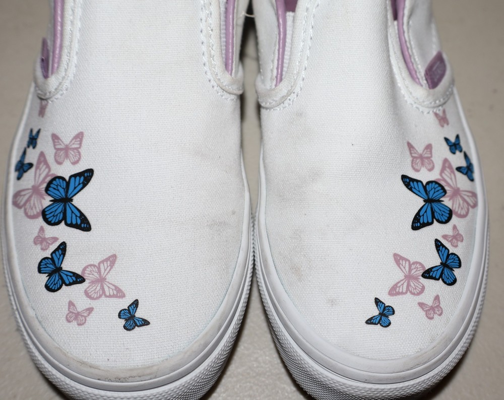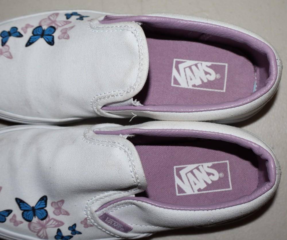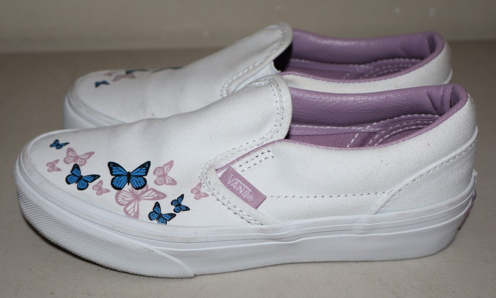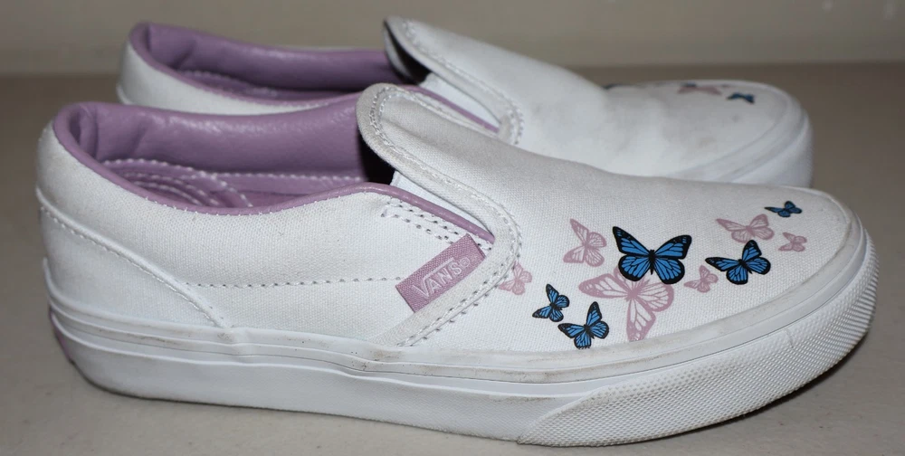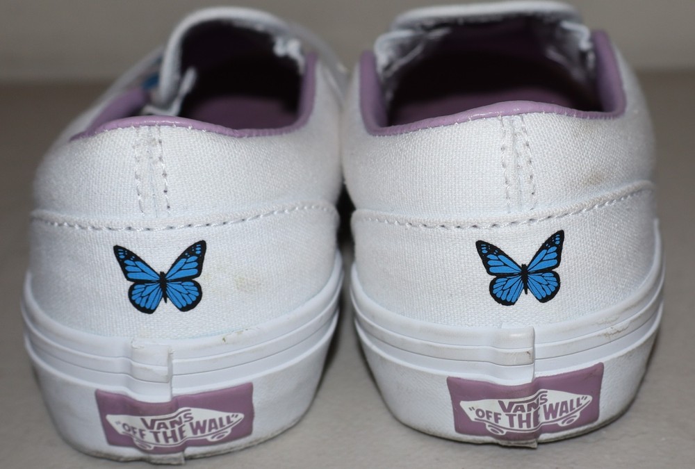 The Girls Youth Butterfly Vans Shoes in White and Purple, Size 1, are a stylish and comfortable slip-on option for young girls. Featuring the iconic Vans Butterfly design, these shoes are perfect for everyday wear. The white color with subtle hints of purple adds a fun and vibrant touch to any outfit. Crafted by the popular brand Vans, these shoes are sure to be a hit with any fashion-forward girl.