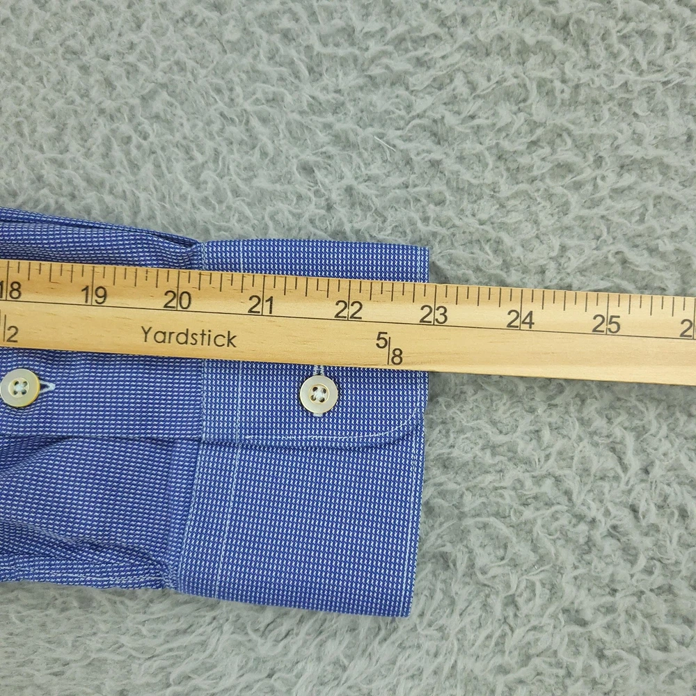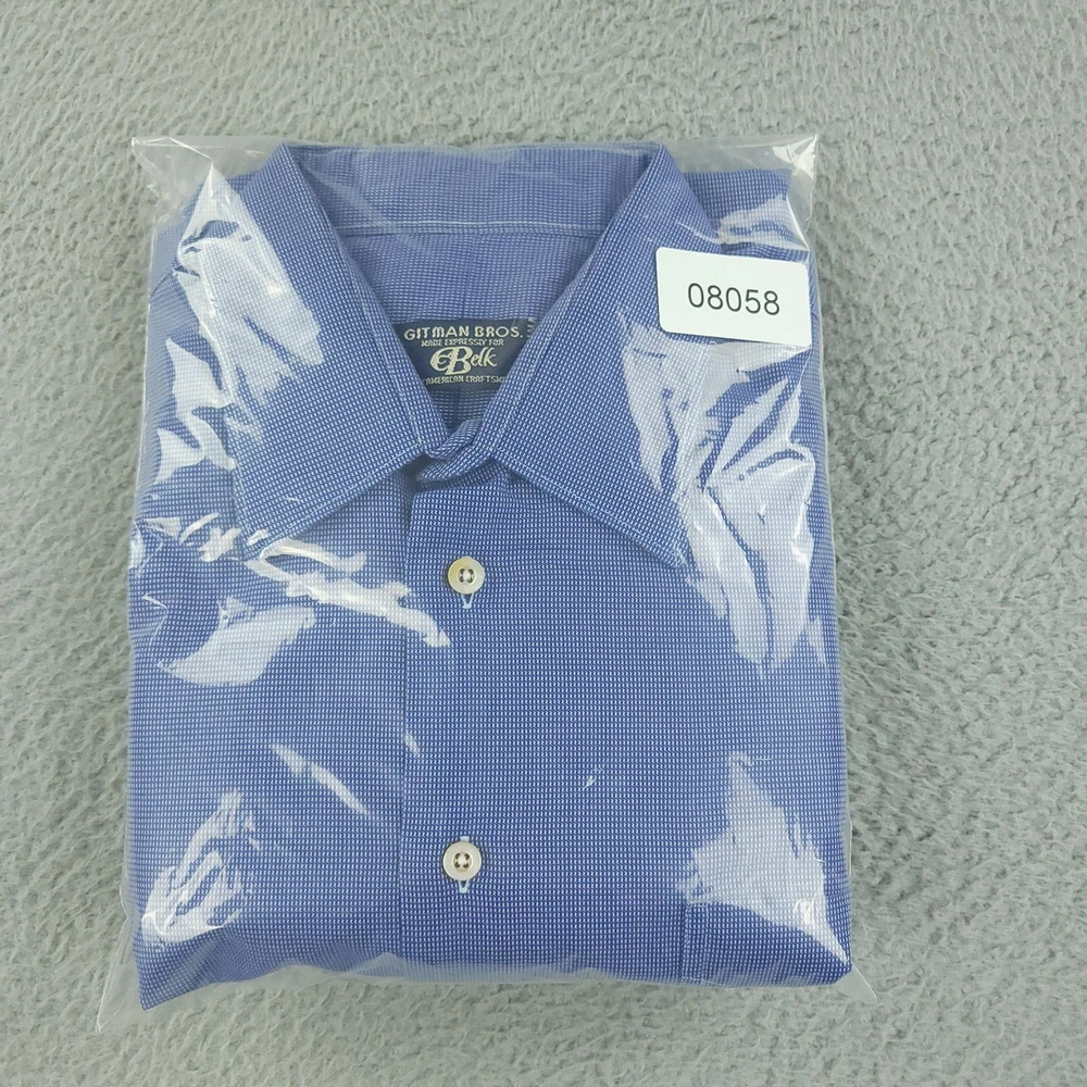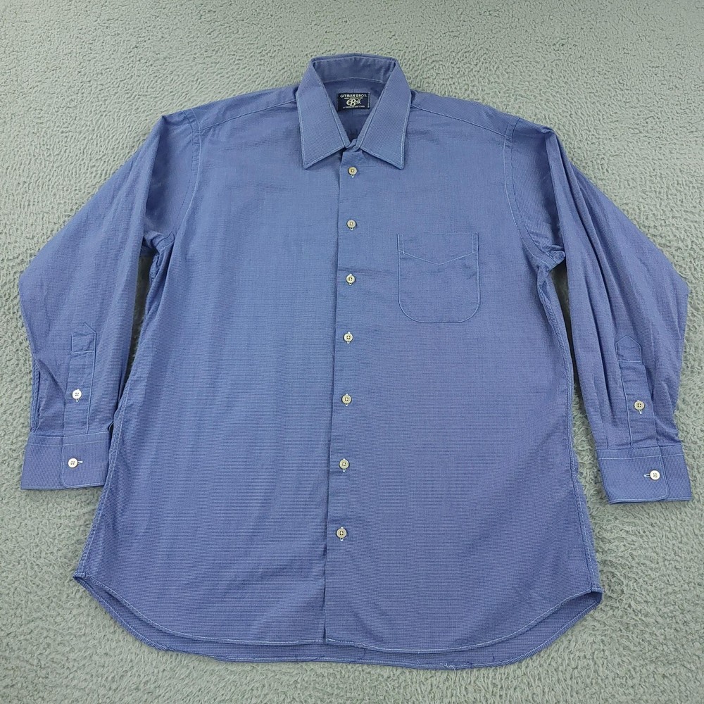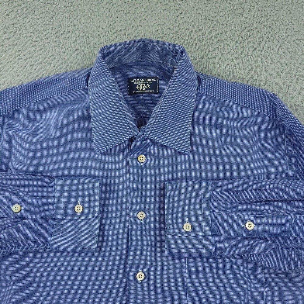 Gitman Bros Dress Shirt Mens 16.5 Blue Check Long Sleeve Cotton Made USA Brand: Gitman Bros for Belk. Style: Mens long sleeve dress shirt with a full button front, point collar, and classic fit silhouette. Color: Blue and white micro check pattern. Size on tag: Mens 16.5 Material: 100% imported cotton woven fabric. Made in USA. Features: Single chest pocket with pointed top detail, long sleeves with buttoned barrel cuffs and sleeve plackets, curved shirttail hem designed to be worn tucked or untucked, button front closure, all-seasons lightweight fabric suitable for business or office wear, crafted by American craftsmen expressly for Belk. Measurements are included in the photos, compare measurements with your item to ensure proper fit. Items are added daily click here to Visit My Store Combined shipping for US customers is 1.99 for each additional item Items are cleaned per eBay standards & policies