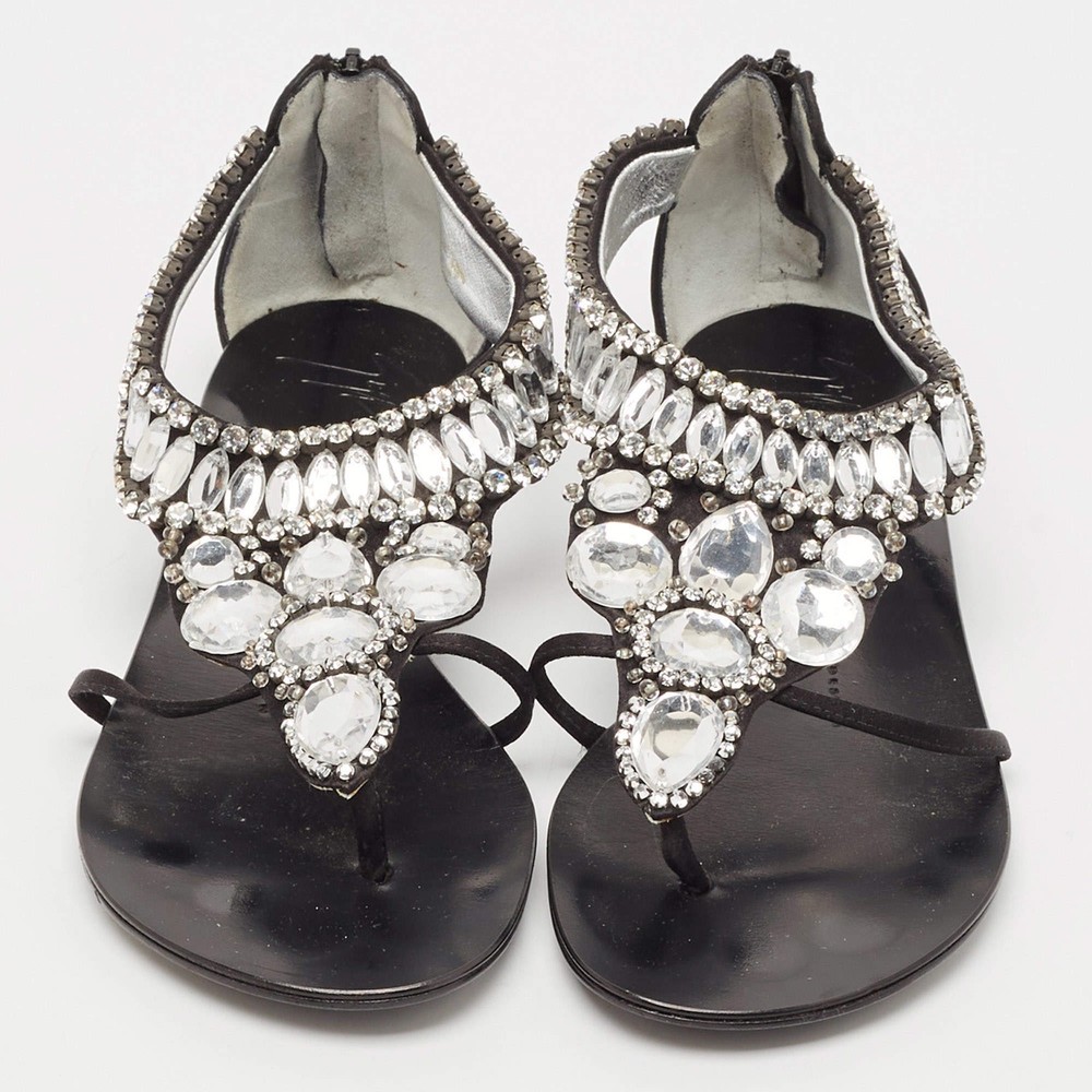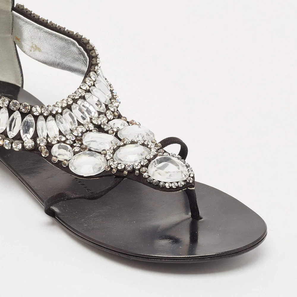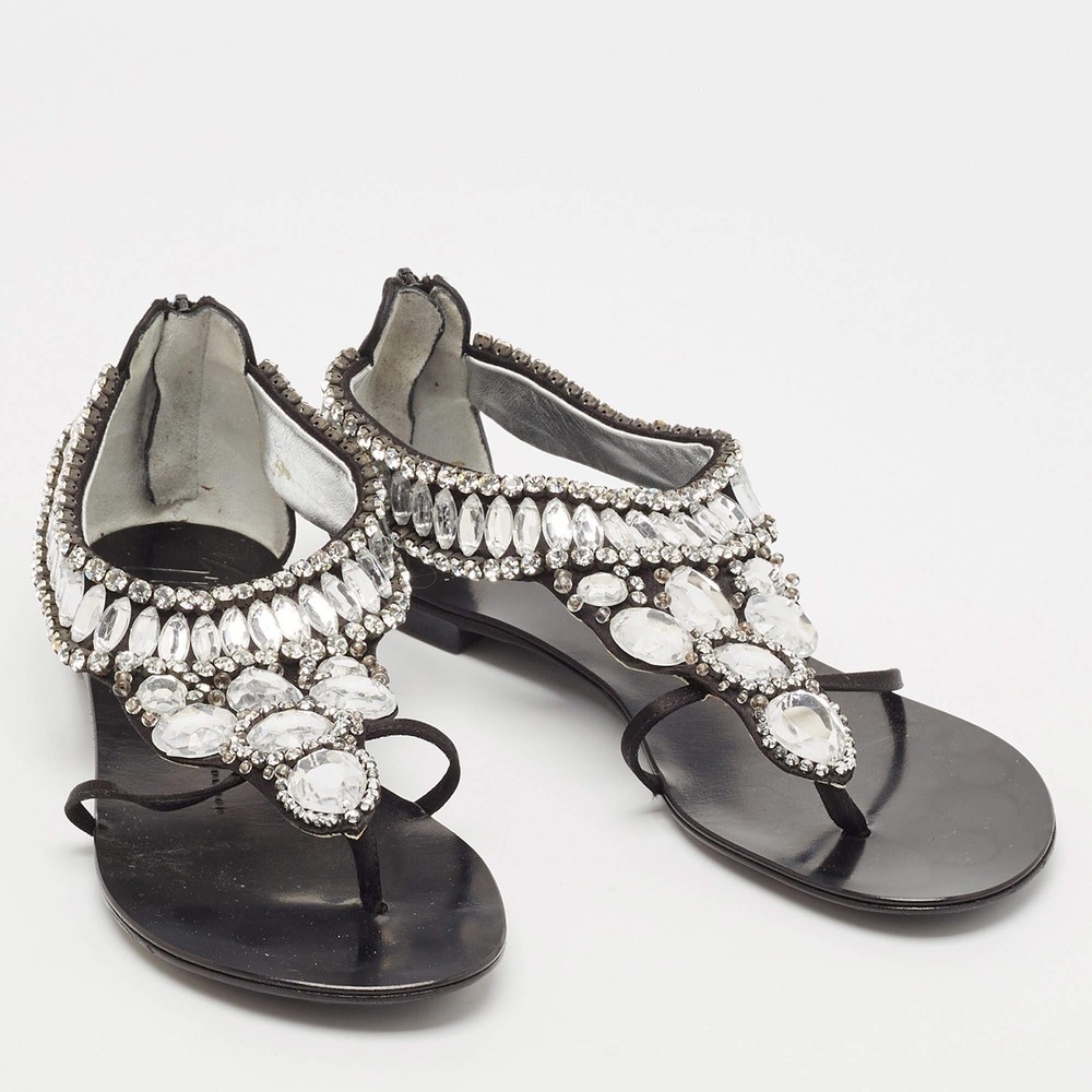 Our eBay Store About Us Contact Us Add to Favorite Sellers Giuseppe Zanotti Black Satin Crystal Embellished Ankle Strap Flat Sandals Size These fashionable sandals from Giuseppe Zanotti can give your entire ensemble a makeover. Crafted from quality satin, they come in a classic shade of black. They are styled with open toes, crystal embellished dragons, ankle straps and black-tone hardware. They are finished with leather soles. Product Details Brand Giuseppe Zanotti Color Black Includes Original Dustbag Size 36.5 Certified by The Luxury Closet This item has gone through a detailed authentication process overseen by our experts. We offer a lifetime guarantee of authenticity on all our items. How We Check The in-house team of experts at The Luxury Closet is highly trained to verify the authenticity and the condition of the luxury products. They ensure that only 100% authentic items are put on sale.The evaluation process is unique with its own mix of assessment criteria and differs according to the category. Each item is evaluated based on the following combination of hallmarks, hardware, stitching, symmetry, material, craftsmanship, stamping, codes, hologram stickers, and packaging. Our authenticators also check if the items have been modified or amended (e.g., aftermarket diamonds, replaced batteries, repaired bags, etc.) International Buyers Import duties, taxes and charges are not included in the item price. These charges are the buyers responsibility. Please check with your country’s customs office to determine what these additional cost will be prior to buying.