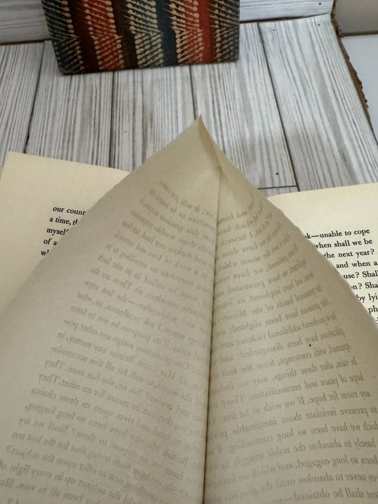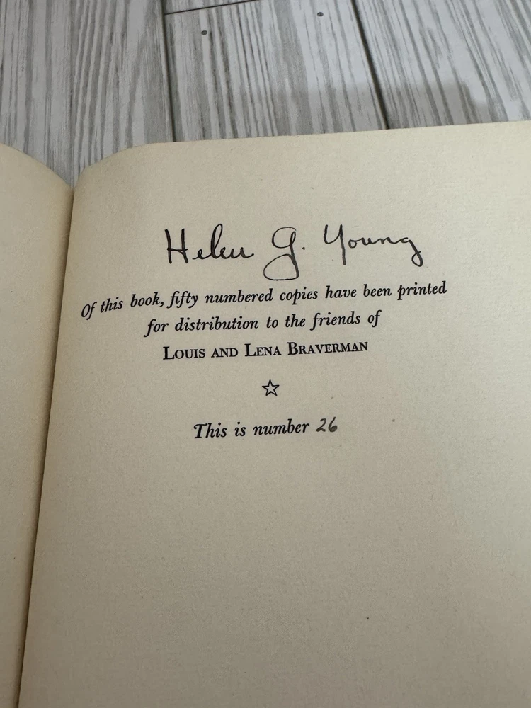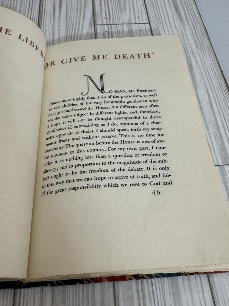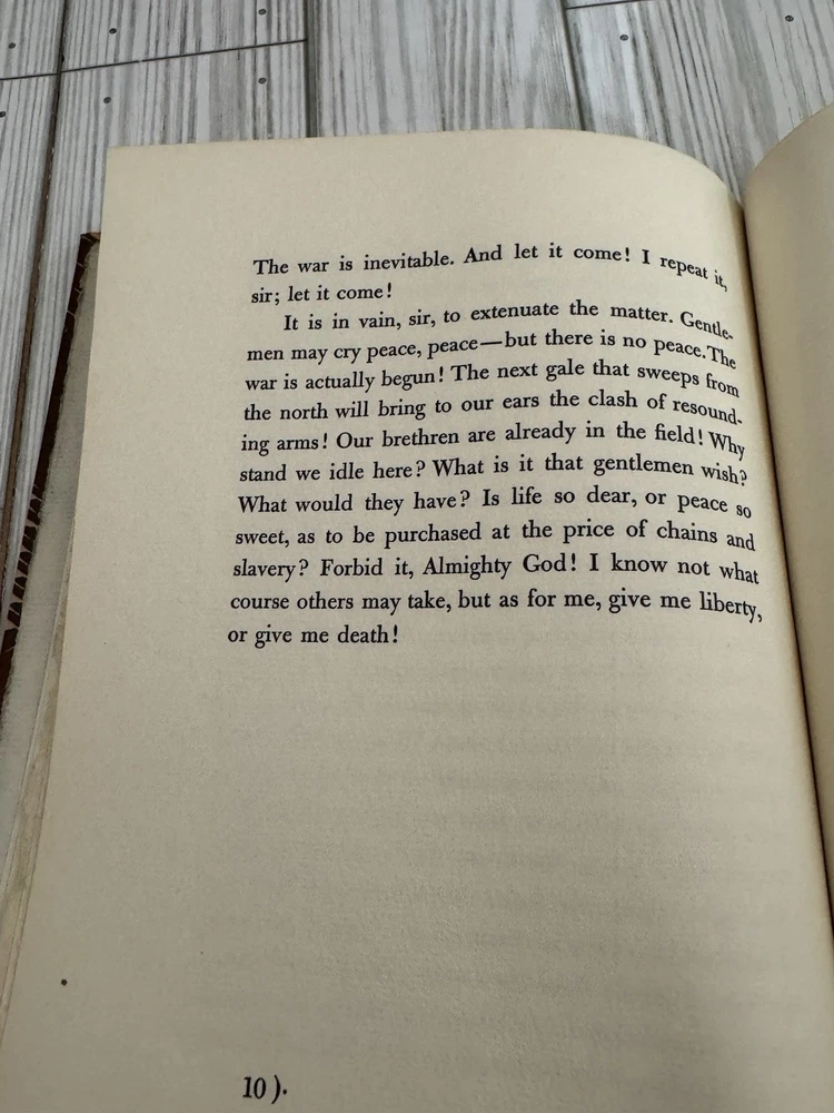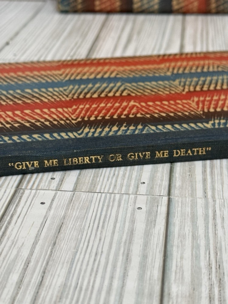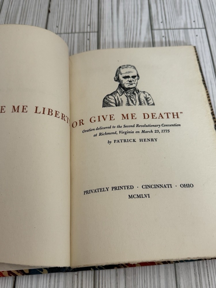 Offered is a scarce privately printed limited edition of Give Me Liberty or Give Me Death by Patrick Henry, issued in 1956. This edition was privately printed in Cincinnati, Ohio, in a strict limitation of only 50 numbered copies. This example is hand-numbered #26 and is signed by Helen G. Young, associated with the production of the book. The volume features decorative patterned cloth boards with gold-stamped spine lettering, and is printed on high-quality paper in a fine private-press style. The text reproduces Patrick Henry’s famous oration delivered at the Second Revolutionary Convention in Richmond, Virginia, March 23, 1775. Condition: Very good overall. Binding is solid and intact. Pages are clean and unmarked with no writing or highlighting. There is some light waviness/cockling to the pages, consistent with age and past moisture exposure, visible in photos. Minor edge and corner wear to the boards. Please review all photos carefully, as they are part of the description. A genuinely scarce Americana collectible, ideal for collectors of: • Private press books • Patrick Henry / Revolutionary War history • Signed & limited editions • Early American political oratory Ships well protected. Any questions, feel free to ask.