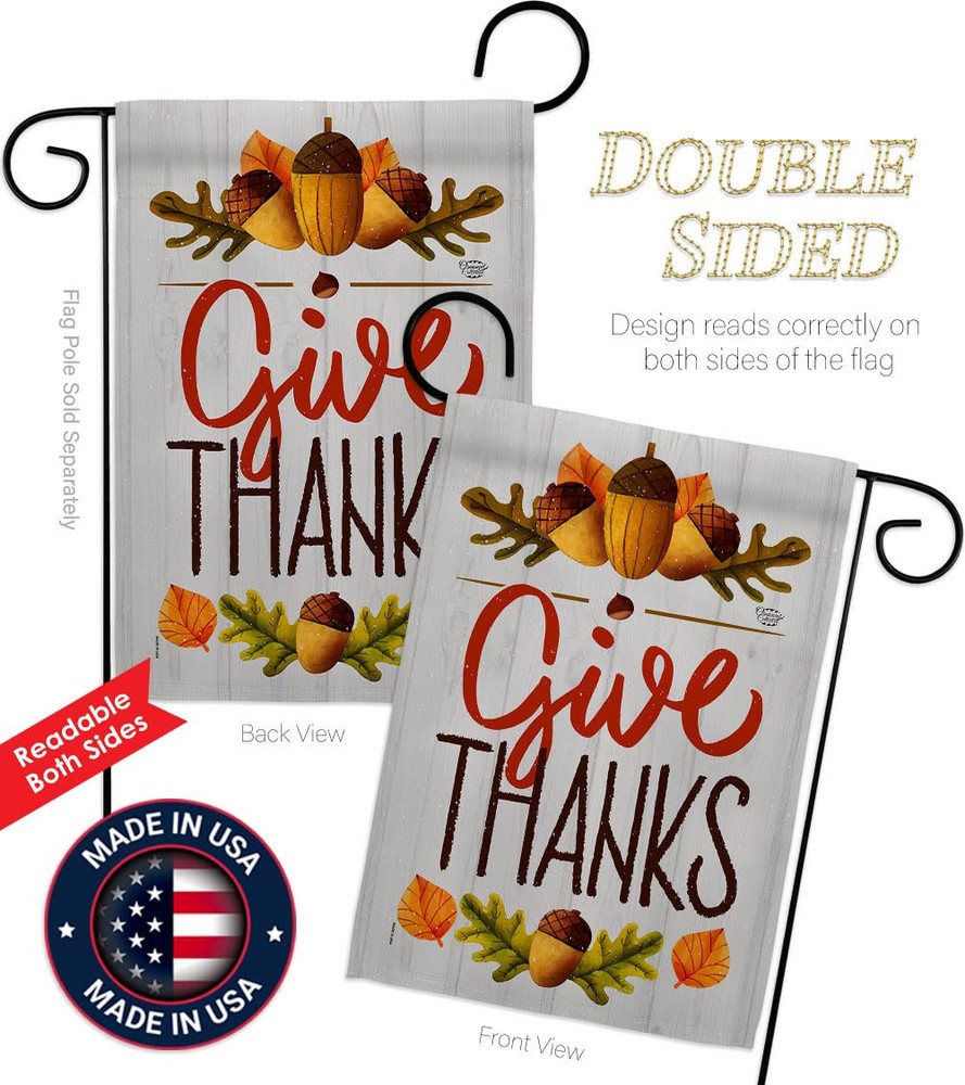 Thanksgiving Beautiful Mini Garden Flag with Metal Garden Banner Pole Stand - Complete Set with Garden Pole - 16" x 40" Power Coated Metal Flag Stand have variety of Garden Flag Set for all occasions. Uniquely design for hanging indoor or outdoor use. We are committed to offering you exceptional values. Our customers enjoy displaying our Garden Flag Set for longer periods. Specification: Theme: Thanksgiving Size: Garden Flag Set 13" x 18.5" Size: Metal Garden Pole Print: Double-Sided Readable: Readable Both Sides Material: Weather Resistant 3 Layers Blockout Stitching: Double Stitched Display: Vertical Hang Type: Sleeve Artist: © Megan Tanaka Special Features: Origin: Made In USA Package Include: 1 pc x Mini Garden Flag 13" x 18.5" 1 pc x Metal Yard Banner Hardware For more than a decade, we’ve been dedicated to manufacturing flags with no comparison in quality and beautiful designs. Our flags are made with our Guard material that is soft to the touch and designs can be read correctly on the flag. A feature that our customers will love. We are committed to using eco-friendly inks that won’t leave a foot print in our environment. MPN: OC-TG-GS-192137-IP-BO-D-US18-OC 92137 92137