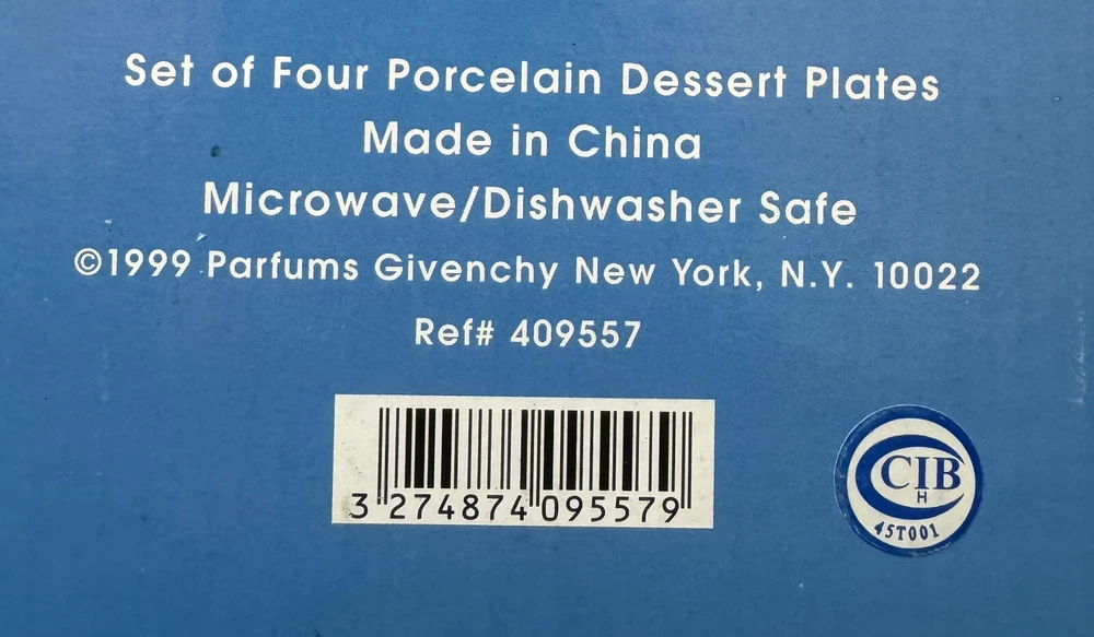 Givenchy Set 4 Porcelain Dessert Plates New Original Box Vintage 1999 Floral 25 years old and never used, still in original box. Brand new. Elegant designer, dessert plates or display plates. Absolutely gorgeous. Box shows wear from storage.