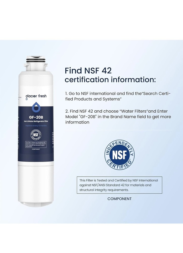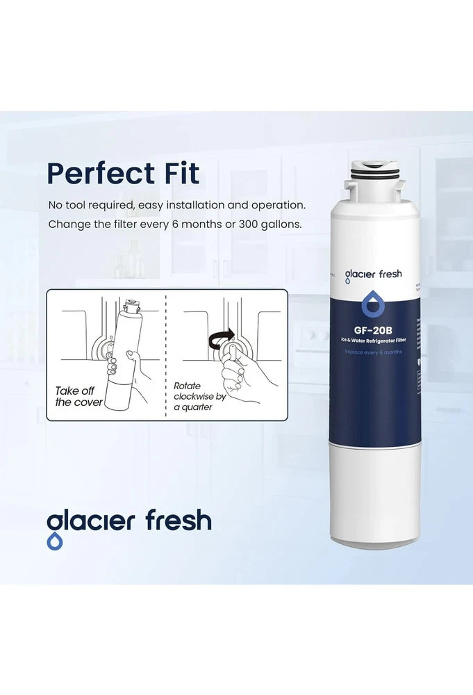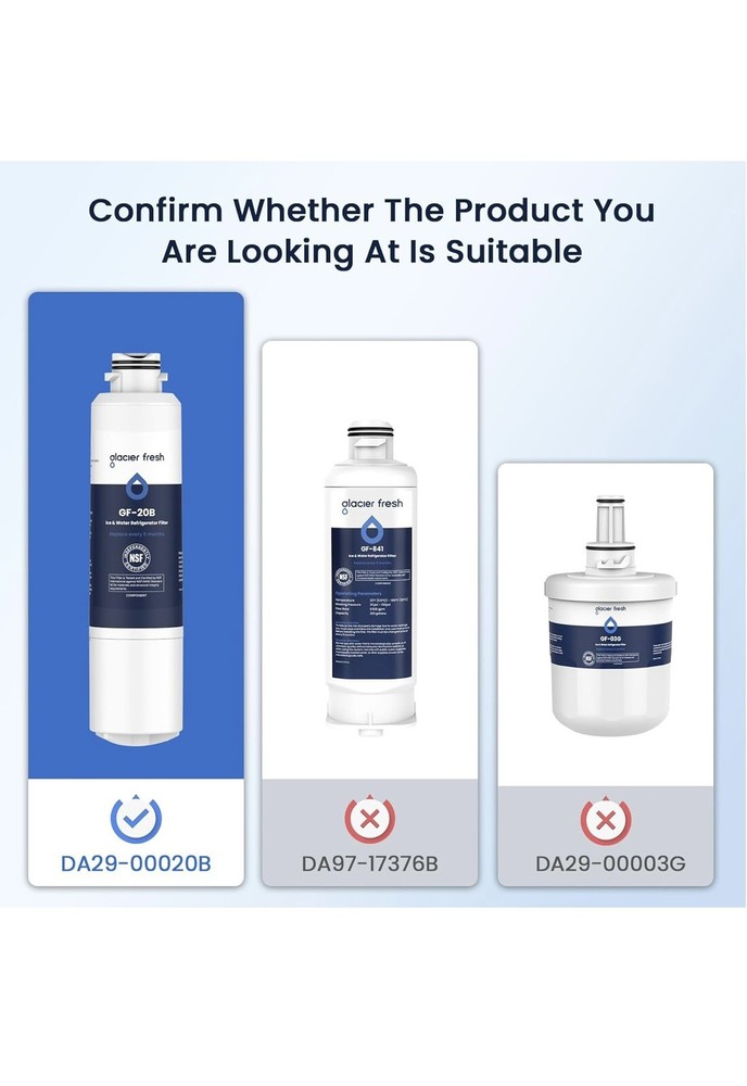 Note: This product is round, not square. Replacement for DA29-00020B (HAF-CIN), not compatible with DA97-17376B (HAF-QIN). GLACIER FRESH GF-20B Samsung* Filter Statement: Material and Construction and Performance Tested to NSF42 Standards. Tested & verified by independent laboratory testing, the GF-20B Samsung* refrigerator water filter removes 97.9%* chlorine and improves water’s smell and taste. Find NSF 42 Standard information: Go to NSF's database, the manufacturer "Ningbo Pureza Technology, LLC" and model number "GF-20B". If you find that the product is not NSF42 certified, you can apply for a ten-fold claim for the purchase amount, this claim statement is listed for GLACIER FRESH and has nothing to do with NSF. Replacement for Samsung* Filters DA-97-08006A-B and HAF-CIN/EXP. Comparable Part Numbers: Samsung* water filter for refrigerators DA29-00020B, DA29-00020A, HAF-CIN, HAF-CIN-EXP, HAF-CINEXP, HAFCIN, 04609101000, 09101, 46-9101, 469101, DA-97-08006A, DA-97-08006A-B, DA-97-08006B, DA29-00019A, DA2900019A, DA2900020A, DA2900020B, DA97-08006A-B. Easy Installation: Compatible with Samsung* refrigerator model: REFSVC RF260BEAESR RF260BEAEWW RF261BEAESR RF263BEAESR RF263TEAESR RF323TEDBSR RF4267HABP RF4267HARS RF4267HAWP RF4287HABP RF4287HARS RF4287HAWP. Easy installation and operation, no tools required. After-Sale Service: Samsung* Fridge Water Filter Replace every 6 months or 300 gallons to maximize contaminant reduction. The product passed strict quality testing, safe for customer use it. If you have any questions you can contact us, we will give prompt reply within 24 hours.