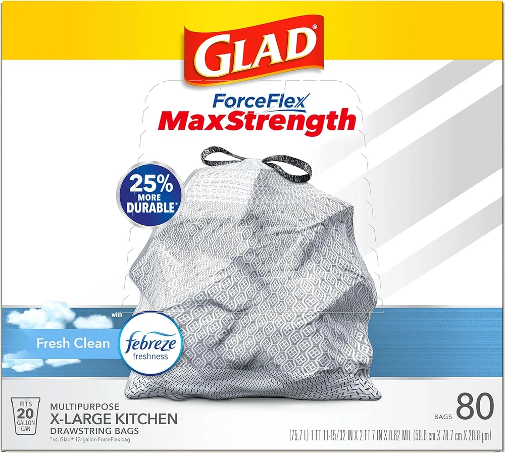 25% MORE DURABLE*: Glad ForceFlex MaxStrength X-Large Kitchen Trash Bags are 25% more durable versus Glad 20 gallon ForceFlex X-Large kitchen bags; packaging may vary FORCEFLEX MAXSTRENGTH: These bags feature double side seams, a reinforced bottom and grips the can drawstring plus Leak and rip protection against leaks, rips and tears NEUTRALIZES TOUGH TRASH ODORS: Febreze freshness in a subtle Fresh Clean scent works to trap odors and helps eliminate garbage smells in the kitchen PRODUCTS WITH LESS PLASTIC: Glad ForceFlex MaxStrength X-Large Kitchen Trash Bags are made with less plastic than the competition** without sacrificing strength DOING MORE TO WASTE LESS: If everyone in the US chose Glad drawstring trash bags it would save 100 million pounds of plastic from going into landfills every year** Glad ForceFlex MaxStrength X-Large Kitchen Trash Bags provide strength and Febreze Freshness to help keep your kitchen smelling fresh and clean. These 20 gallon bags are 25% more durable* with an outer leak protection layer and an inner layer that stretches to prevent rips and tears. Febreze freshness in a Fresh Clean scent provides odor neutralization against even the toughest kitchen smells. The drawstring grips to the trash can, keeping the bag in place. With double side seams and a reinforced bottom, these tall kitchen trash bags are made with 100% renewable electricity. And heres something cool: if everyone in the U.S. chose Glad drawstring trash bags it would save 100 million pounds of plastic from going into landfills every year**. Certain trademarks used under license from The Procter & Gamble Company or its affiliates. *Vs. Glad 20 gallon ForceFlex bag. **Based on IRI sales data. Glad Kitchen drawstring bags are made with 7% to 22% less plastic vs top 10 competitors.