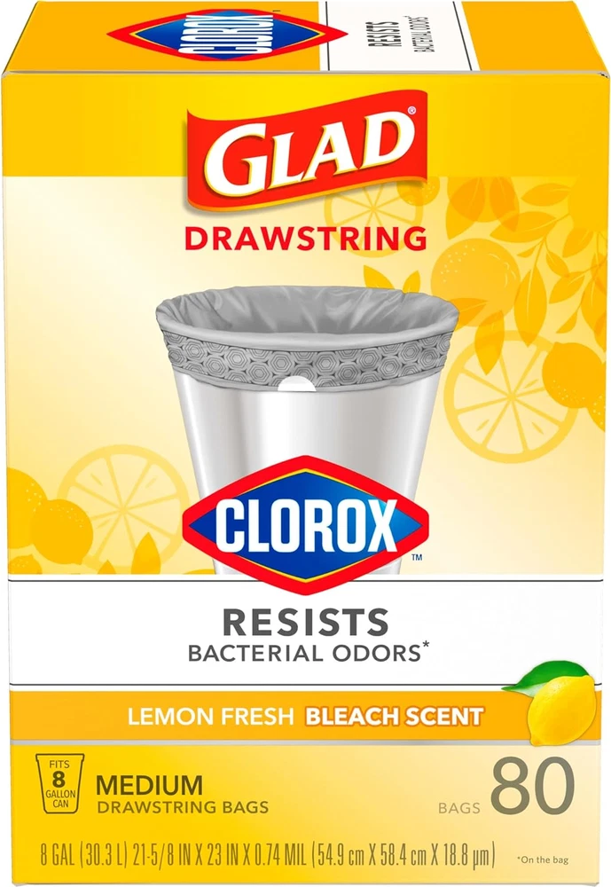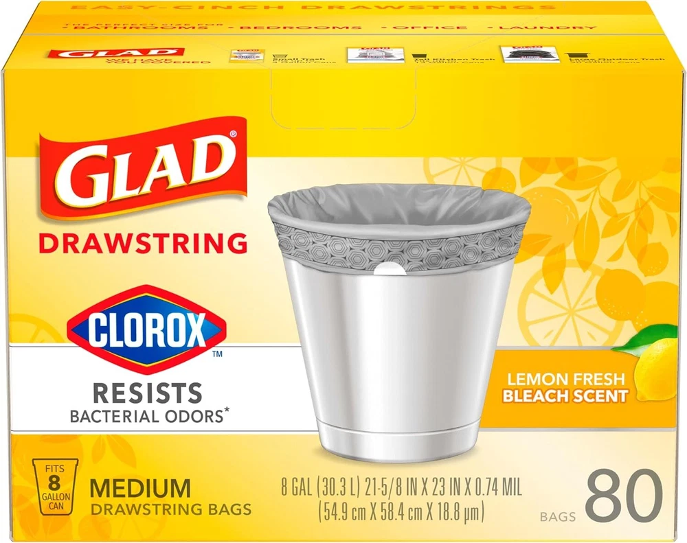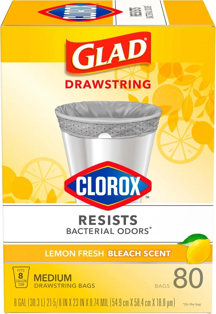 ELIMINATES TRASH AND BACTERIAL ODORS ON THE BAG: Glad with Clorox helps you take control of odors by eliminating trash and bacterial odors on the garbage bag; packaging may vary EASY-CINCH DRAWSTRING: Handle all your daily household demands with medium trash bags that tie with a quick cinch of the drawstring for easy trash removal CLEAN-SMELLING SCENT: These garbage bags feature a Lemon Fresh Bleach scent that gently freshens your home with just a hint of sparkling clean scent 8 GALLON GREY MEDIUM TRASH BAGS: Glad wastebasket liners are great for medium garbage cans, general household needs and just the right size for cars and on-the-go messes CLEANING MADE EASY: Glad with Clorox garbage bags work as hard as you do to help maintain a clean and healthy feeling home with a versatile design for bins around the home