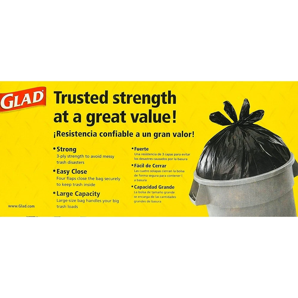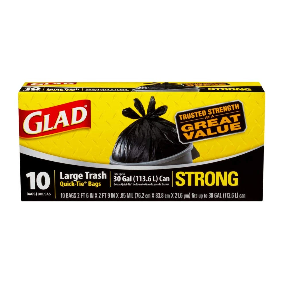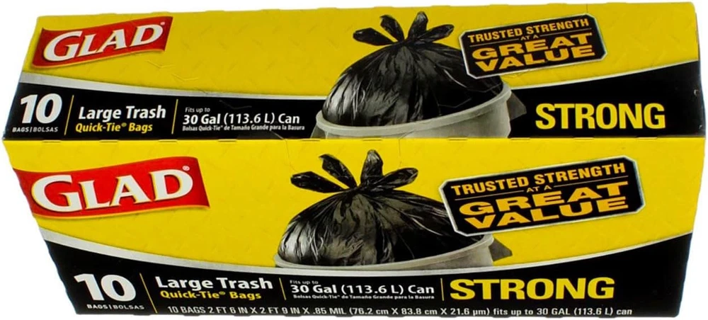Product Description Glad is one of the most well-recognized and trusted brands in your home. Glad offers a wide range of waste management solutions that make handling trash a cinch. The line includes bags that stretch to hold more, neutralize odors, and use less plastic, as well as recycling and compostable bag solutions. Glad also provides a full range of food storage solutions, including wraps, food bags, and containers. Quick Tie Trash Bags: 10 count of 30 gallon plastic trash bags with quick tie closure for easy disposal Clorox Brand: Made by Clorox, a trusted brand known for quality cleaning and household products Plastic Material: Made from durable plastic material that is resistant to tearing and leaks Versatile Use: Can be used for disposing of household waste like garbage, food scraps, and more Unscented Scent: Features an unscented design for those who prefer a neutral odor when disposing of waste Great for use in the house, garage, and home office Three-layer drawstrings for easy closing, carrying, and tossing away Strong bags use less plastic