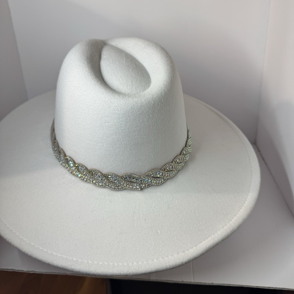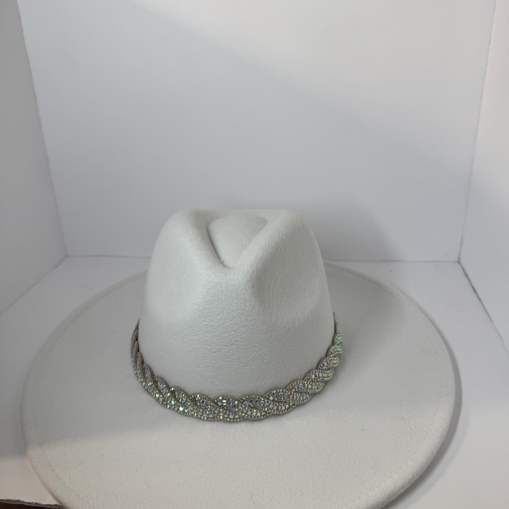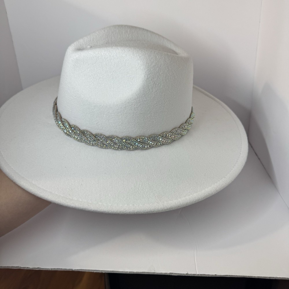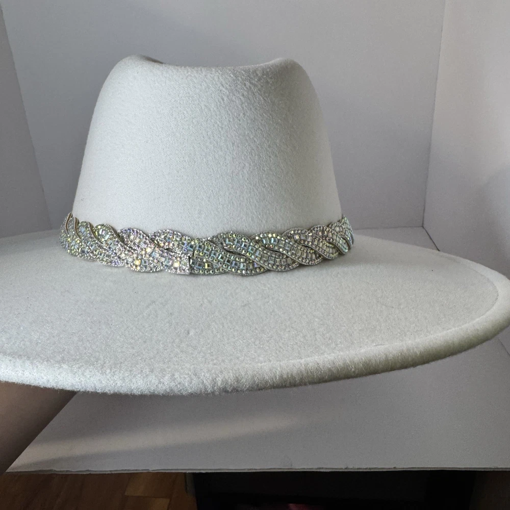 Gorgeous white wool wide-brim hat with a sparkling silver rhinestone braided band. Structured fit that works for glam western, dressy nights out, bachelorette, engagement, bride, or special events. No rips, dents, or stains. Rhinestones all present. Interior sweatband is clean. Statement piece ready to elevate any outfit. Ships fast from a smoke-free home. Add some bling to your wardrobe with this stunning white cowboy hat! Covered in sparkling rhinestones and featuring a wide brim, this hat is perfect for any glamorous occasion. Whether you're attending a wedding, party, or even a casual event, this hat is sure to make a statement. The hat is made of 100% polyester and is designed to fit most with its one size feature. Its structured design and clean interior make it comfortable to wear while its lightweight material ensures it won't weigh you down. The hat's solid pattern and glitter accents make it perfect for any bride, cowgirl, or jazz-inspired look.