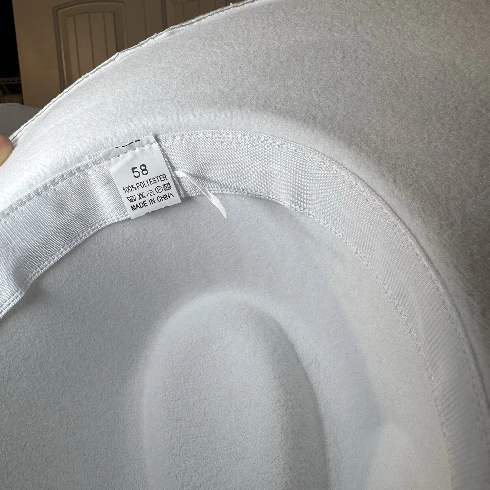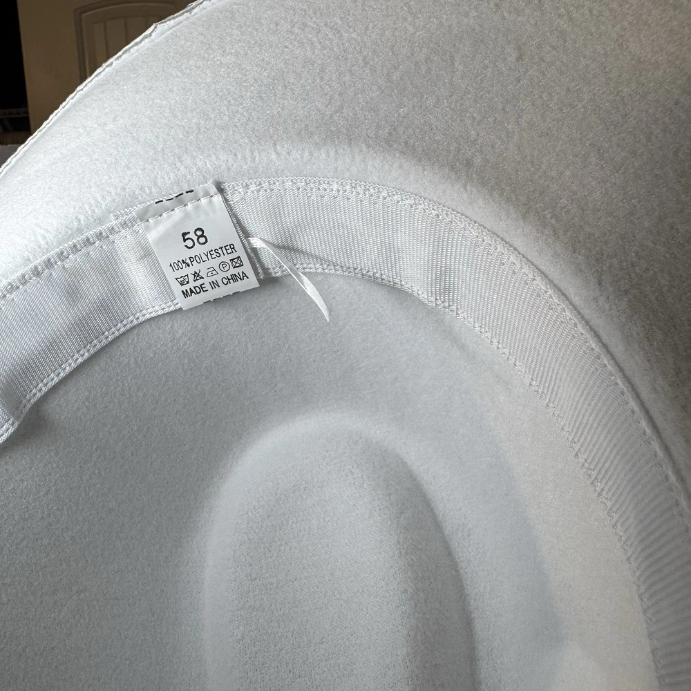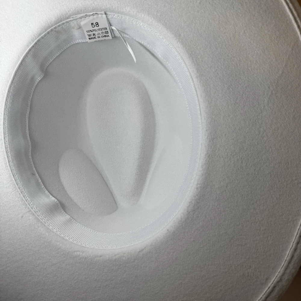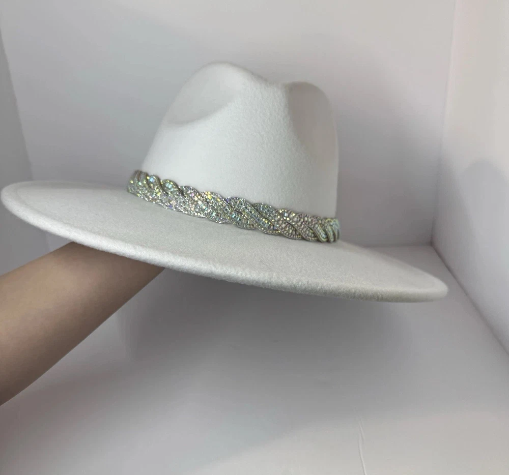 Gorgeous white wool wide-brim hat with a sparkling silver rhinestone braided band. Structured fit that works for glam western, dressy nights out, bachelorette, engagement, bride, or special events. No rips, dents, or stains. Rhinestones all present. Interior sweatband is clean. Statement piece ready to elevate any outfit. Ships fast from a smoke-free home. Add some bling to your wardrobe with this stunning white cowboy hat! Covered in sparkling rhinestones and featuring a wide brim, this hat is perfect for any glamorous occasion. Whether you're attending a wedding, party, or even a casual event, this hat is sure to make a statement. The hat is made of 100% polyester and is designed to fit most with its one size feature. Its structured design and clean interior make it comfortable to wear while its lightweight material ensures it won't weigh you down. The hat's solid pattern and glitter accents make it perfect for any bride, cowgirl, or jazz-inspired look.
