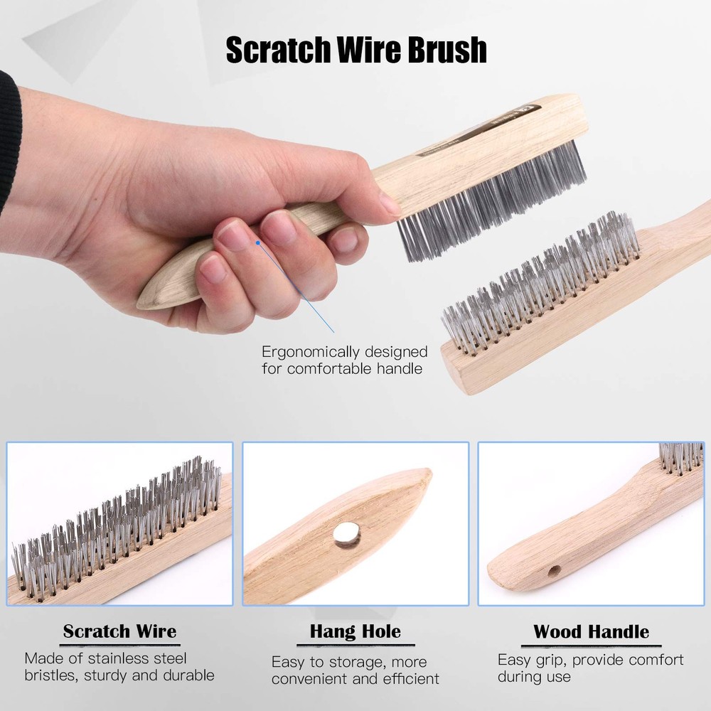 Glarks 4Pcs 10'' Welding Chipping Hammer with Coil Spring Handle and Wire Brush with a Pair Welding Gloves for Removing Slag and Welding Residue Specification Product Type: Welding cleaning tools Welding Chipping Hammer Width: 5 inch (12.5cm) Overall Length of The Hammer: 10 inch (25.5cm) Brush Wire Length: 4.3 inch (11cm) Overall Length of The Brush: 10 inch (25.5cm) Package Detail Welding chipping hammer x 1pc Wire scratch brush x 1pc Leather forge welding glove x 2pcs Total Quantity: 4Pcs Why Choose Us? ☀ We provide you with a complete welding cleaning kit, it can help you complete the entire cleaning process. ☀ A flat chisel on the one endand and the pointed chisel on the other end, which is convenient for using under different conditions. ☀ There is black layer on the surface of the hammer, more wear-resistant and greatly improves its service life. ☀ The gloves in the suit are made of leather and have extremely high abrasion resistance. Not only can they be used for welding, but also can be used in barbecues, trimming flowers or camping. ♚ [What You Get]: This set includes a 10 inch welding chipping hammer, a wire scratch bush and a pair of welding protective gloves, 4pcs in total. With this powerful set, you can quickly remove rust and slag during welding and keep your work clean. ♚ [Welding Chipping Hammer]: The welding chipping hammer is made of high strength and toughness steel. Dual-headed design, one end is a flat chisel and the other end is a pointed chisel, which is convenient for working in a small space. The coil spring handle can reduce vibration and improve comfort. ♚ [Wire Scratch Brush]: We use stainless steel bristles to make wire brushes and increase the wire density, so they are not only durable but also have a strong cleaning ability. The brush is 10 inches long, the appropriate size and wooden handle make it easier for grasping. ♚ [Welding Gloves]: Wear-resistant welding gloves protect your hands at all times. The gloves are made of soft leather, resistant to oil, heat and cutting. The proper size also ensures that it will not easily fall off your hands. ♚ [Widely Application]: This set of welding slag removal tools can not only be used for daily welding and cleaning work, the hammer can also be used as a life hammer and ice breaking hammer, and the brush can be used to clean up rust stains on furniture and metal.