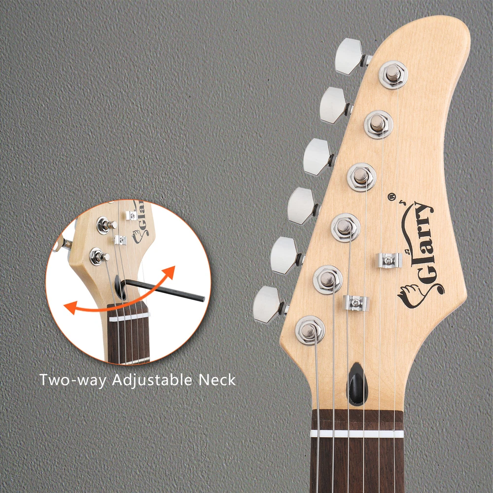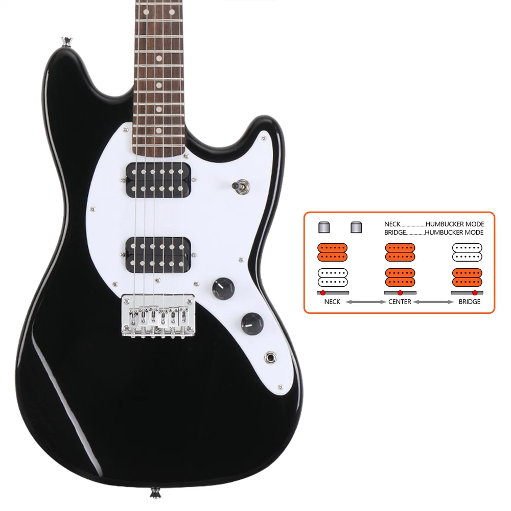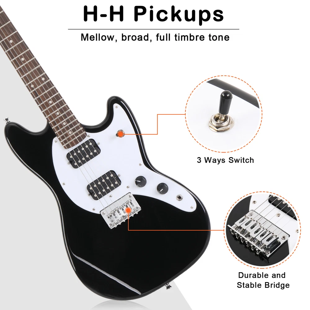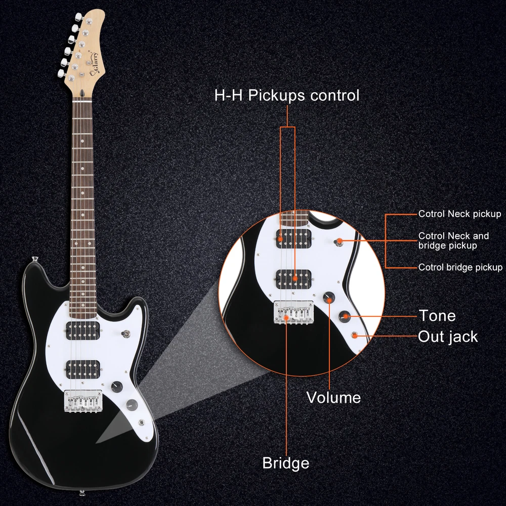Introductions: Glarry 6 String H-H Pickups GMF Electric Guitar! Featuring great sound and ease of playability, it is an ideal choice for beginners. Constructed with a wooden body with a stunning finish, Single Pickups control get a obtain mellow, broad, full timbre Tone. Comfortable neck and fingerboard are ideal for any style of playing. Adjustable bridge provides solid tone, sustain, and great intonation. High-tensile strength fretwire ensures durability and smooth playability. Bring it home right now! a stunning finish, Single Pickups control get a obtain mellow, broad, full timbre Tone. Comfortable neck and fingerboard are ideal for any style of playing. Adjustable bridge provides solid tone, sustain, and great intonation. High-tensile strength fretwire ensures durability and smooth playability. Bring it home right now! Features: 1. Wooden and synthetic body with a stunning finish 2. Outstanding look, Thin and Lightweight Body 3. Comfortable neck and fingerboard, ideal for any style of playing 4. Adjustable bridge provides solid tone, sustain, and great intonation 5. High-tensile strength fretwire for durability and smooth playability 6. Ideal for beginners as well as electric guitar musicians 7. Humbucker Pickups control get a obtain mellow, broad, full timbre Tone 8. It comes with guitar bag, shoulder strap, plectrum, connecting wire and spanner tool etc Specifications: Body 1. Type: Electric guitar 2. Brand: Glarry 3. Orientation: Right Handed 4. Body: Basswood 5. Color: Black Neck and Fingerboard 1. Strings: 6 2. Frets: 22 3. Nut width: 1.653 in. (42 mm) 4. Scale Length: 24" 5. Neck Shape: "C" Shape 6. Face Material: Basswood 7. Back Material: Basswood 8. Side Panel Material: Basswood 9. Neck Material: Maple 10. Fingerboard Material: Laurel Wood 11. Tuning Peg Material: Metal 12. Nut Material: Plastic 13. Bridge Material: Metal 14. String Winder Peg Tool: Closed Tunning Pegs Pickups & Hardware 1. Pickups: Humbucker Pickups; Humbucker Pickups 2. Control: 3 Way Switch; One Volume Controls; One Tone Control 3. Hardware: Fixed (Chrome) 4. Jack: 1/4" Dimensions 1. Guitar: (39.37 x 11.8 x 1.65)" / (100 x 30 x 4.2)cm(L x W x H) 2. Net Weight: 2.89kg/6.35lb 3. Gross Weight: 3.89kg/8.55lb Package Includes: 1 x Electric Guitar 1 x Electric Guitar Bag 1 x Strap 1 x Connecting Wire 1 x Spanner Tool 1 x Plectrum