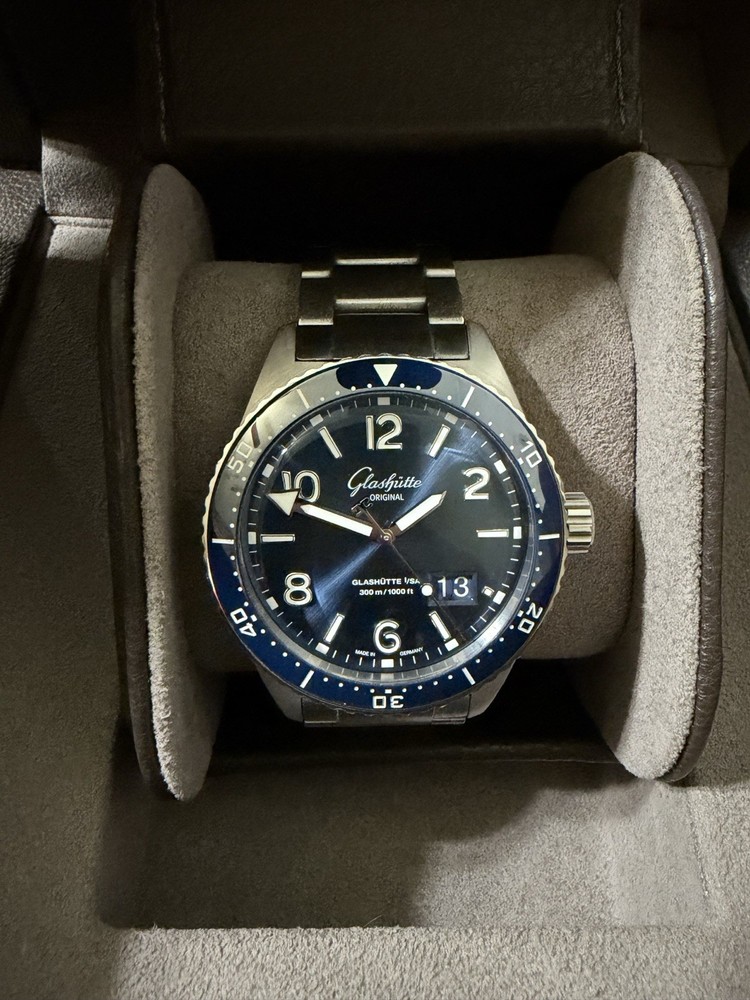 This watch is practically brand new! only worn a couple times for special occasions! Box and papers included! Serial # 221018 Date of Purchase- 27, June 2024 Made in Germany The Glashutte Original SeaQ Pano Date SS Blue dial on bracelet is a luxury mechanical wristwatch for men, featuring a stainless steel case and bracelet. This elegant timepiece boasts a blue dial, analog display. With a sleek silver case color and a round watch shape, this Glashütte Original watch is a stylish and sophisticated accessory for any man's wardrobe. Additionally, it comes with papers, a manual/booklet, and is brand new, making it a valuable and high-quality choice for watch enthusiasts.