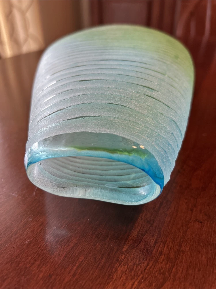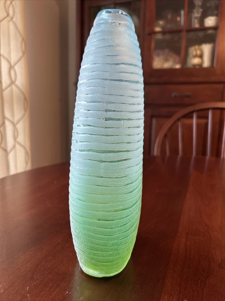 Crafted with attention to detail, this glass vase would be an attractive element to a beach themed space. Its layered glass pattern has an ombre effect, fading gracefully from a rich green to a serene blue. The frosted sandblasted finish adds a tactile dimension to the piece, making it a standout decorative item for any space. The vase stands 10.5 inches in height and measures 6 inches in width, providing a substantial and elegant canvas for your favorite blooms or as a standalone statement piece. This piece blends seamlessly with a variety of decor styles, bringing a touch of coastal charm to your home.