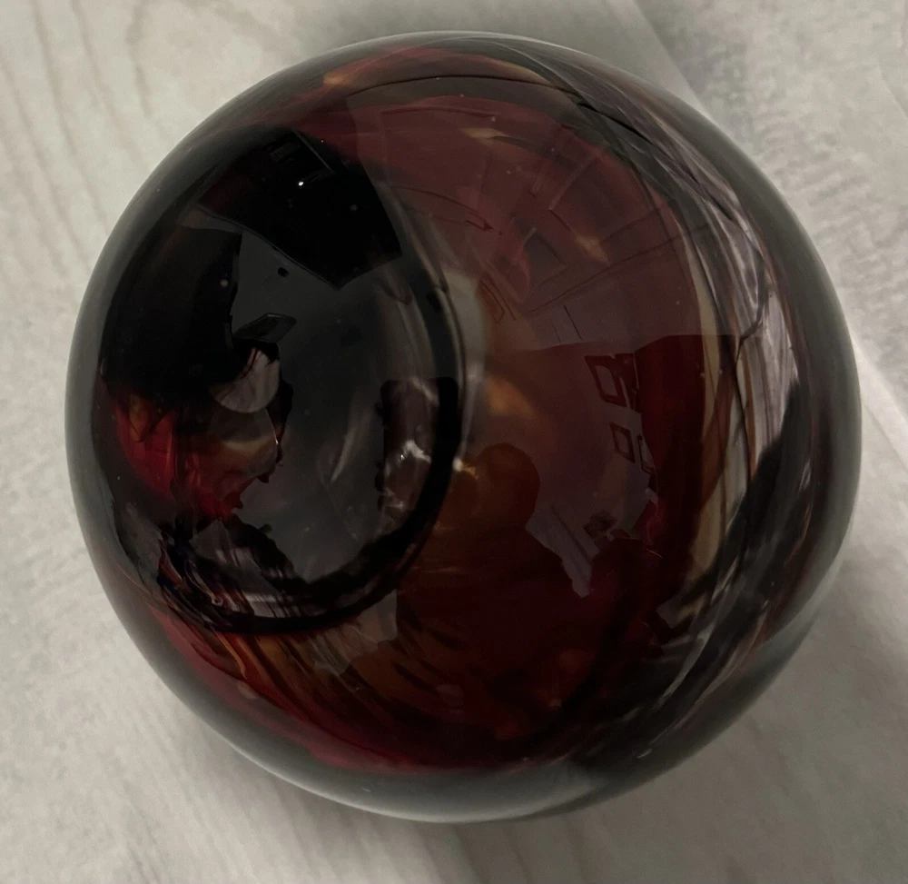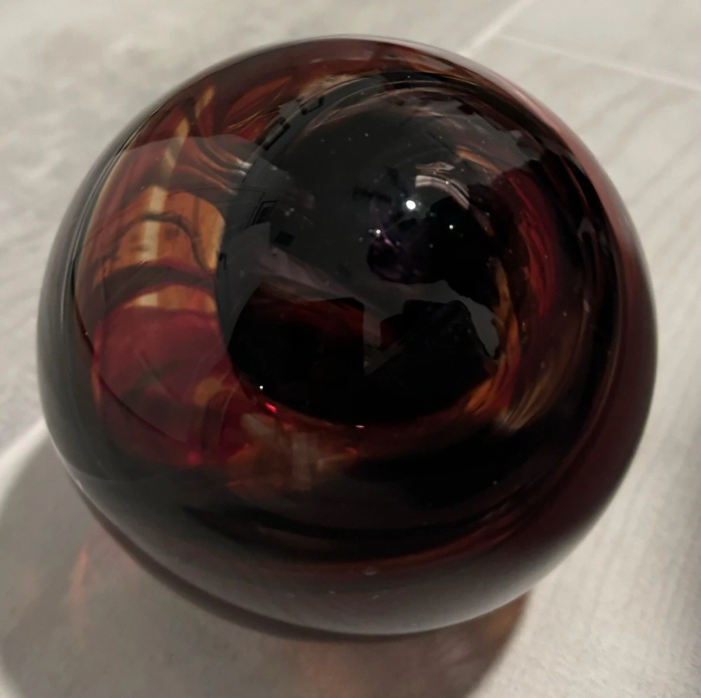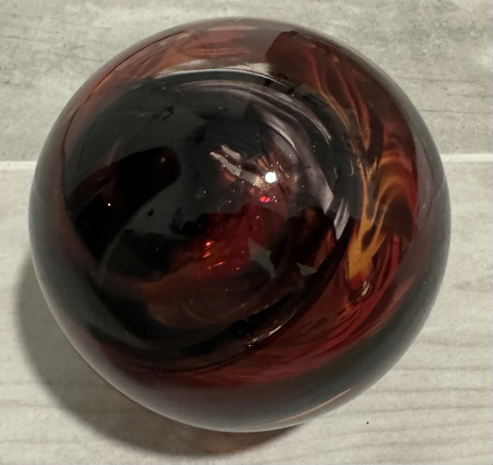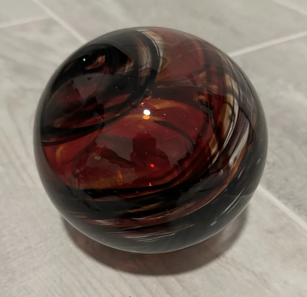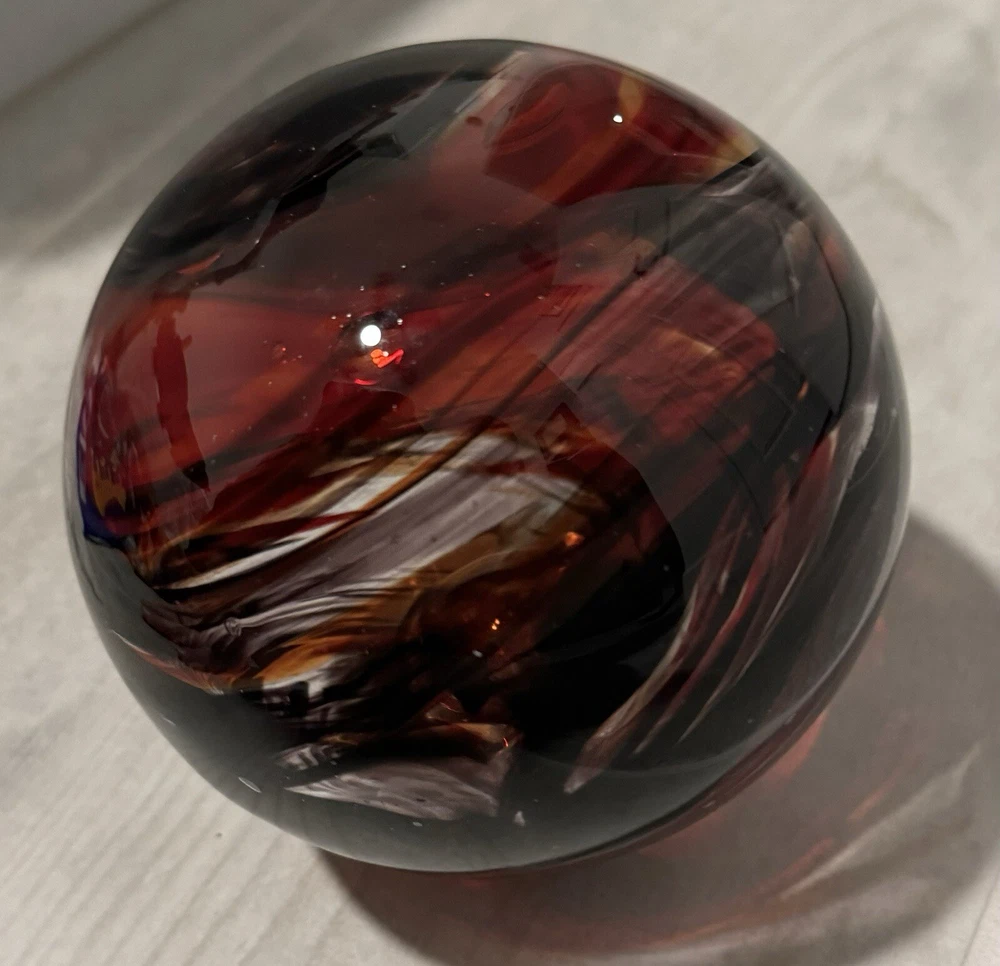 This beautiful glass ball is a stunning example of hand-blown art glass, made in Oregon in the 21st century. The swirling pattern and multi-colored design make it a unique and decorative piece, perfect for any mid-century modern or bohemian-inspired decor. Crafted with care and attention to detail, this unmarked ball is an original piece, made with high-quality glass materials. It features a smooth, seamless finish and a sturdy construction, ensuring that it will last for years to come. Whether you're looking for a statement piece for your office or a gift for a loved one, this glass ball is sure to impress. Around 6in in diameter and 6in tall. Calculation may vary.