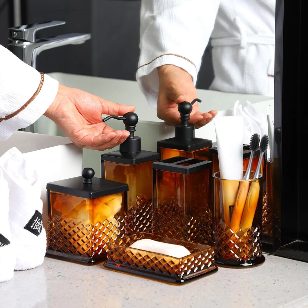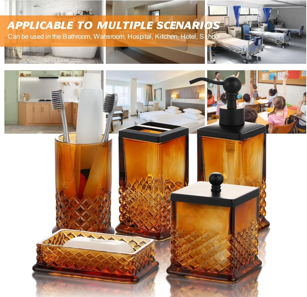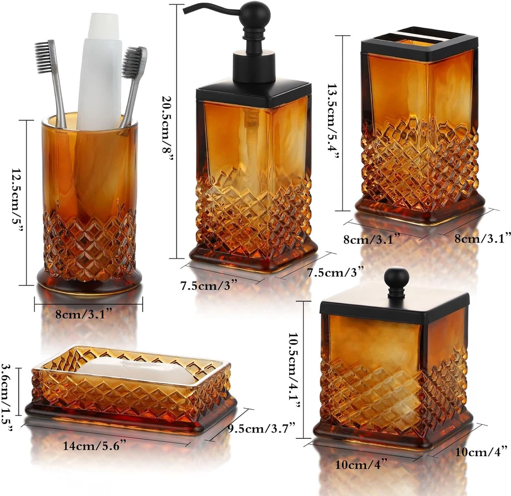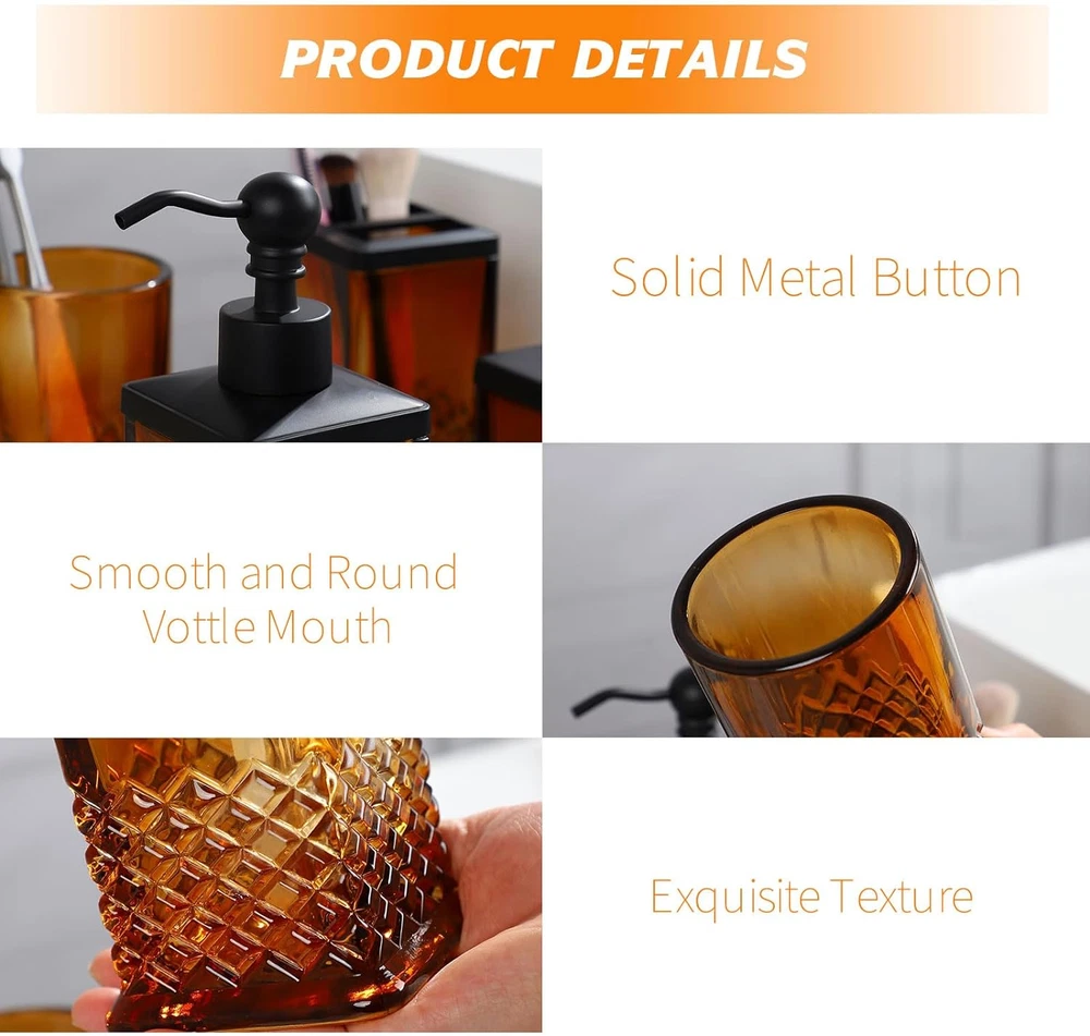 Glass Bathroom Accessories Set - Complete 5 Pc Bathroom Accessories Set Includes Lotion Dispenser, Soap Dish, Toothbrush Holder, Tumbler, Cotton Pads Jars, Modern Bathroom Decor (Amber) 100% Glass High borosilicate glass, Fivefold transparency compared to ordinary glass, resistant to pressure and stains, durable, easy to clean and maintain 5pcs Bathroom Accessories Set Includes Soap Dispenser with 12.8 oz, Tumbler, Soap Dish, Toothbrush Holder and cotton pads jar. All the accessories are using top-notch hardware not the plastic,Stuable,Pefect plating coating to avoid fading and rusting,undergo durability testing to ensure the can withstand the constant pressure and inpact of long time use A perfect gift for family, friends, and coworkers; perfect as a housewarming present, wedding gift, and perfect for remodelers looking to upgrade the bathroom in their home or apartment; bathroom essentials for a new home; guest bathroom decor We are committed to presenting the best quality materials and satisfaction services to our customers. If you have any issue with the contemporary bathroom accessories set, contact us and Fully refund or Free replace Product Description Style Amber Color Amber Material Glass Material Type Glass Included Components Lotion Dispenser, Tumbler, Toothbrush Holder, Soap Dish, Cotton pads Jars Finish Type Glass Style Name Amber Shipping Fast shipping is very important for us. Our standard US shipping service is FREE. Your order will be shipped within 2-3 business days upon full payment received. Your order will be delivered within 2-3 business days after the handling time. We only ship to the confirmed PayPal address. We reserve the right to cancel any order for any reason at any time. We are not responsible for undeliverable addresses. Returns and payment We offer a 30 days return policy from checkout winning date. We allow only PayPal as payment method FeedBack Your feedback very important to us, after you get your package and you are satisfied with our service please leave us positive feedback If you have any problem with your order / any questions please before leave any type of feedback For any questions, using eBay contact system Please visit our eBay store to check out other items for sale! Thank you for shopping at our store.