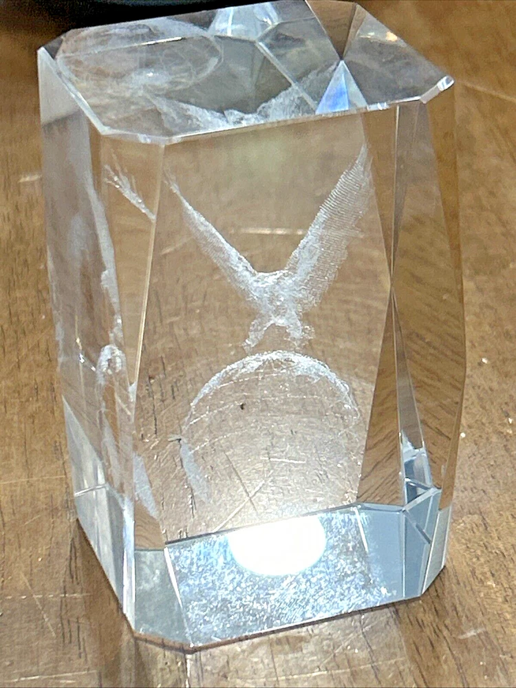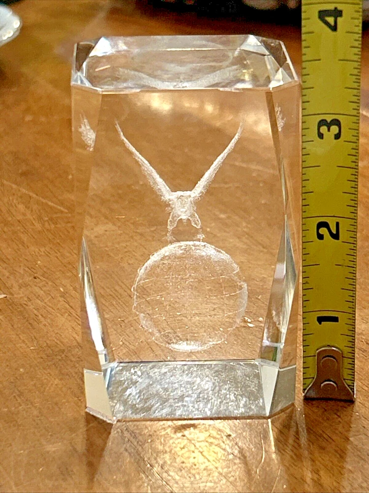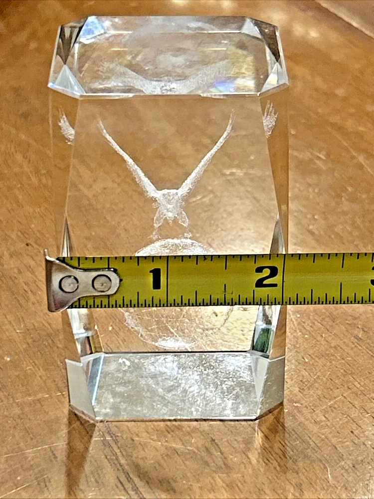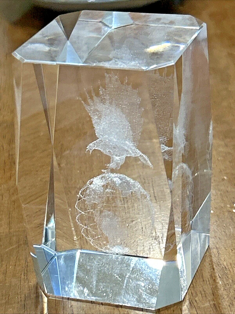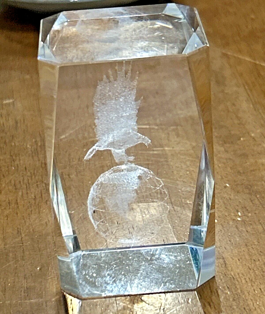Glass Cube Eagle on Globe Image Paperweight 3D Fine Laser Etched 3" X 2" No Box Beautiful laser cut glass cube with Bald Eagle standing on the Earth Very good pre-owned condition - no chips, cracks or scratches 3" X 2" Tall Beveled corners Elegant paperweight or desk decoration Thank you for visiting Magpie Revibe ! 78213990125 H