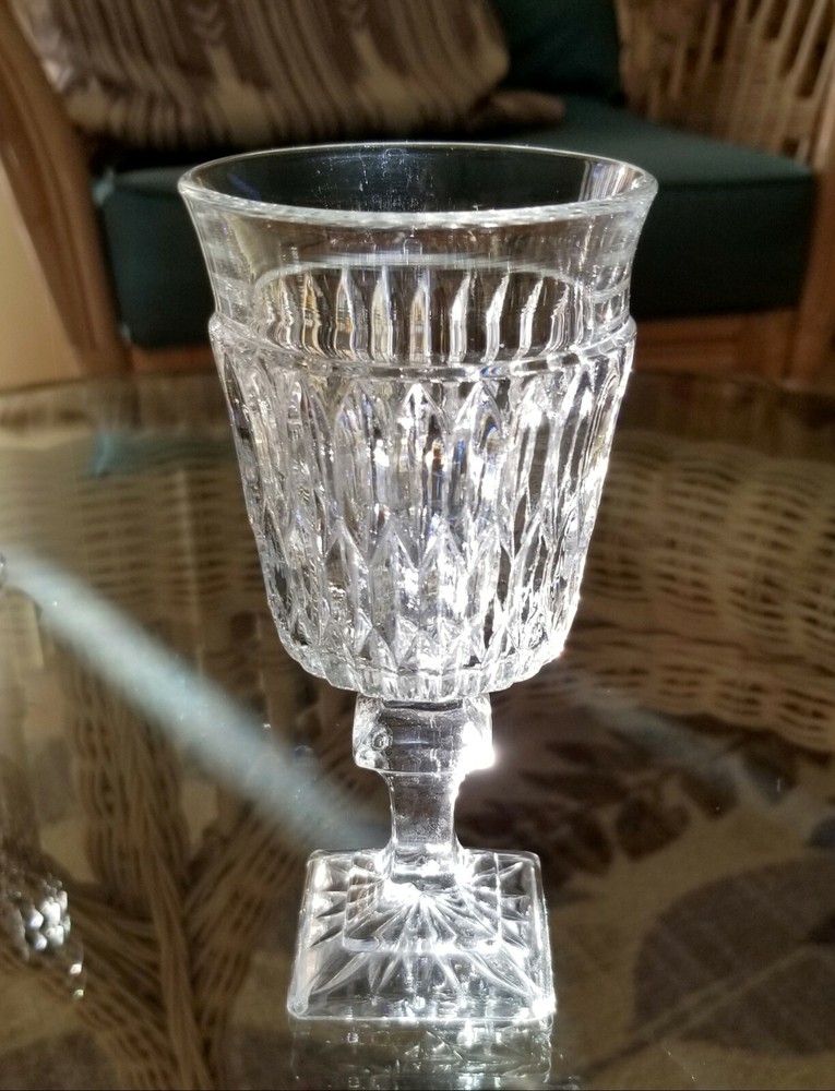 Goblets measure 5.5 inches in height and 2.5 inches in width. The set includes six glasses that weigh a total of 7.5 ounces each, mid-20th century vintage set of six.