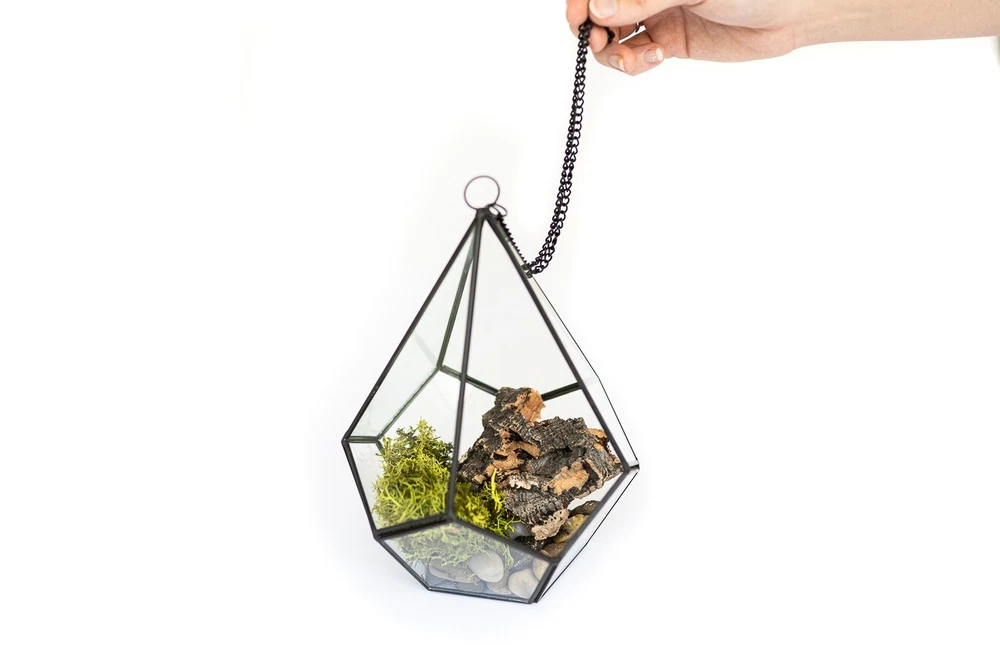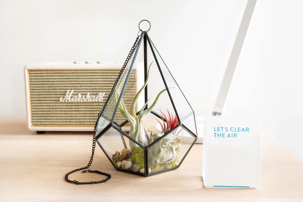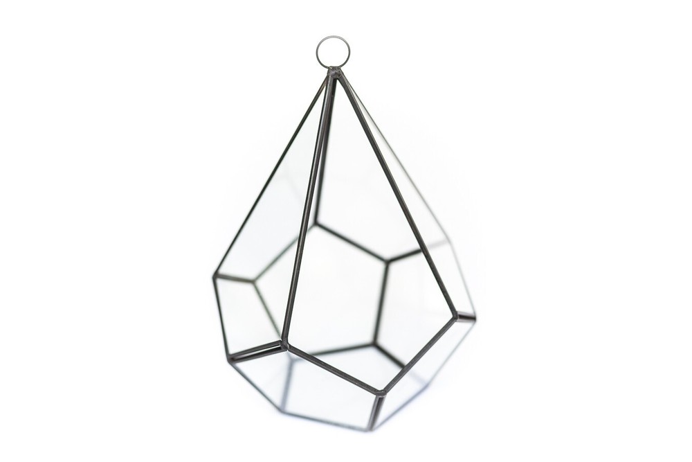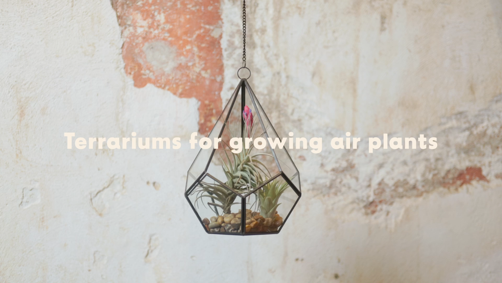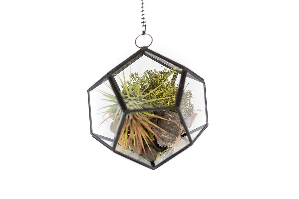 More About Our Large Glass Multifaceted Terrariums Showcase your air plants in modern style with our multifaceted glass terrariums, available in two striking shapes; a sleek diamond or a bold dodecahedron (pentagon). Both designs feature multiple glass panes framed in black metal, with a unique shaped opening that makes adding plants a breeze. Perfect for displaying multiple small plants. Each terrarium includes a black chain for hanging and can also sit beautifully on any flat surface. Size: Diamond - Plant Opening - Width - Height 4 x7 inches 4 inches 9 inches Pentagon - Plant Opening - Width - Height 3x3 inches 5.5 inches 5 inches More About Air Plants Air plants are easy-care house plants in the genus Tillandsia. Air plants are unique because they do not need soil to grow. They are epiphyte plants native to Central and South America. They only need light, water and air to survive. They are great for small spaces, as accents, home decor or party favors. The options are unlimited – Tillandsia can stand alone or pair with an accessory such as a terrarium, ceramic hanger, cork bark, driftwood, and more! Air plants also make great gifts – They are the gift that keeps giving! Air plants reproduce by producing offsets or “pups” from the base of the plant after they show off their spectacular bloom. Every order comes with care instructions. Multiple Uses Air plants add beauty to indoor and outdoor spaces. Place them in terrariums, wall planters, containers, globes and use them to stylize vertical gardens displays. As a succulent alternative, Tillandsia (air plants) can decorate events like weddings, birthdays, for Easter and Christmas. Use them as party favors, Mother's Day gifts, centerpieces or as unique gifts. Easy-To-Care-For Air Plants (Genus: Tillandsia) are hardy bromeliad plants from Central and South America that don't require soil to grow. Simply soak them in water for 20 to 30 minutes once a week and let them dry out. They require indirect but bright light. A care instruction card from Air Plant Shop will be included in every order. Hand Packed & Picked Our shippers are trained to only send the healthiest living plants. We pack every order with quality and care. All our plants come with a 30 Day Guarantee. Let us know if you are not completely happy with your order and we will send you new plants. We have a variety of plants available. Select anywhere from 5 to 5,000 plants we will ship them out the same business day if the order is made by 3 PM Eastern Time Monday-Friday. About Blooming & Color Plants will not always arrive in bloom with red and purple color. However, most will bloom 2-3 times a year. See photos for what the non-blooming green plants look like Air Plant Care Tips Do not plant your air plants in soil. Do not let them stay wet for long periods of time to avoid rotting. Let them dry completely before placing in a glass terrarium. You may cut the unsightly roots off and peel or trim off the brown leaves. Some species have naturally dark bases. Where To Use Air Plants In a terrarium or ceramic holder As a desk plant On a shelf or in a decorative bowl Table centerpieces Party favors On a porch Attach to a tree Pair with driftwood, seashells or cork bark