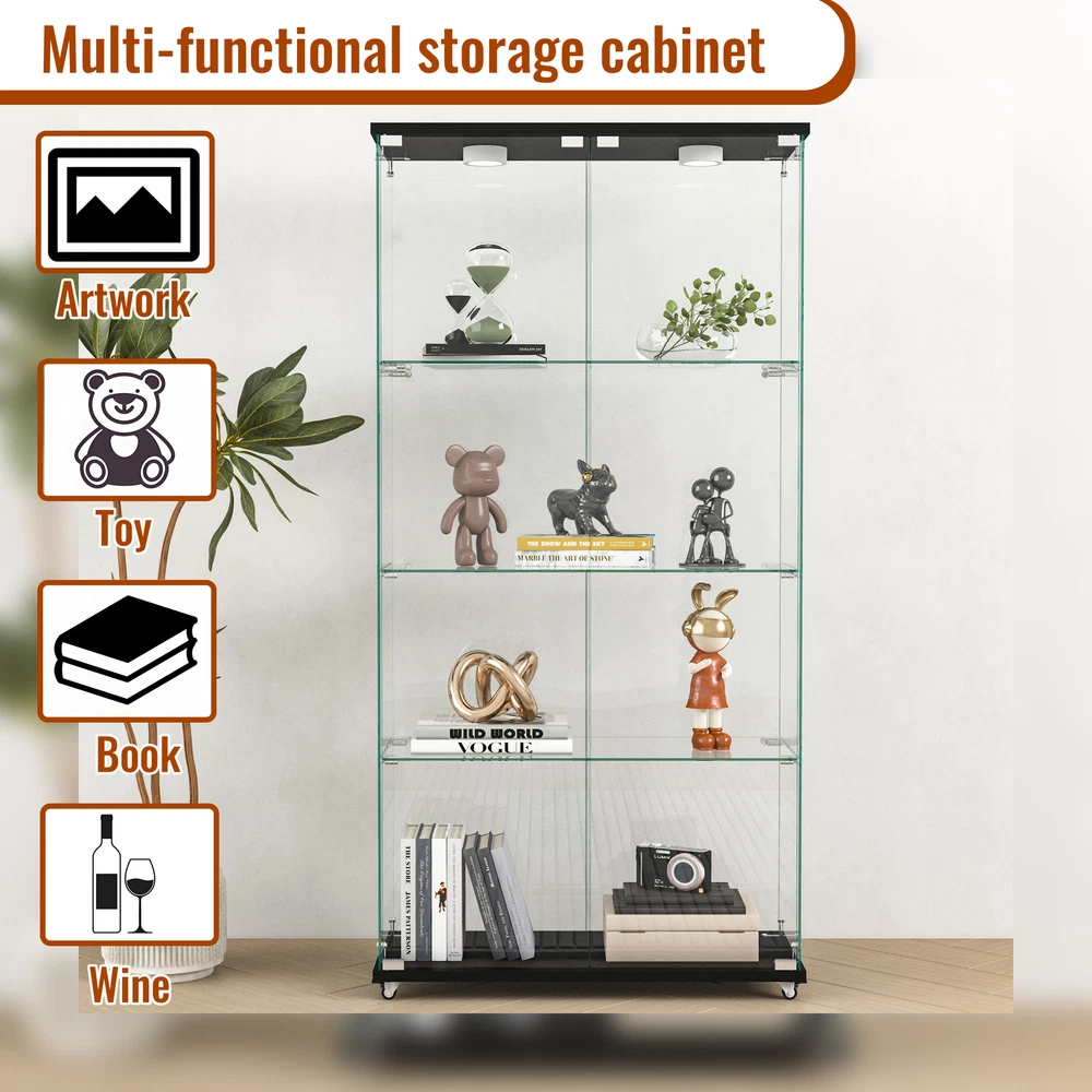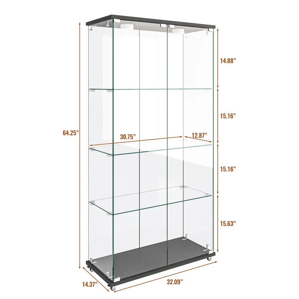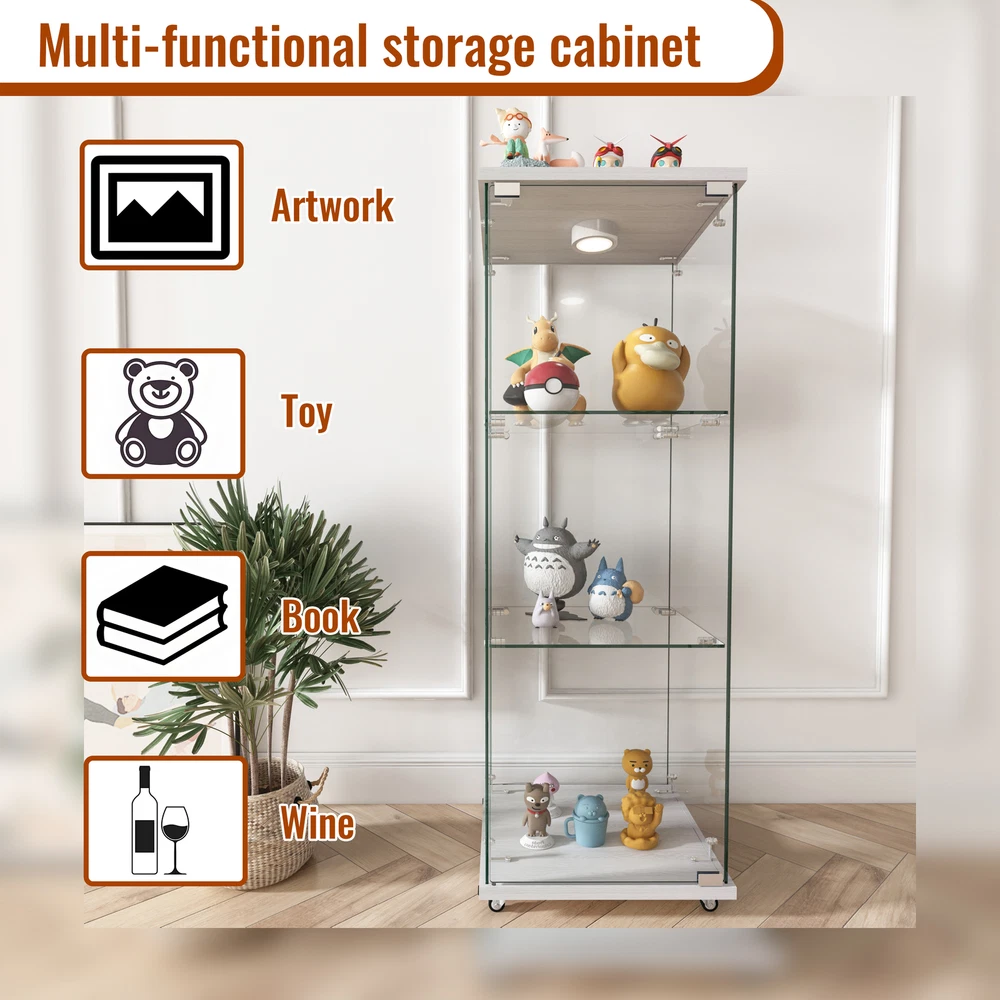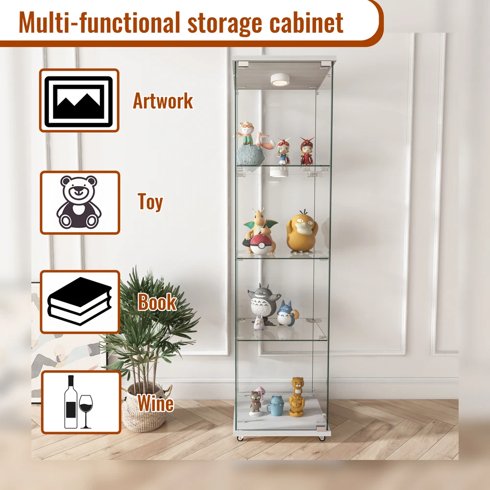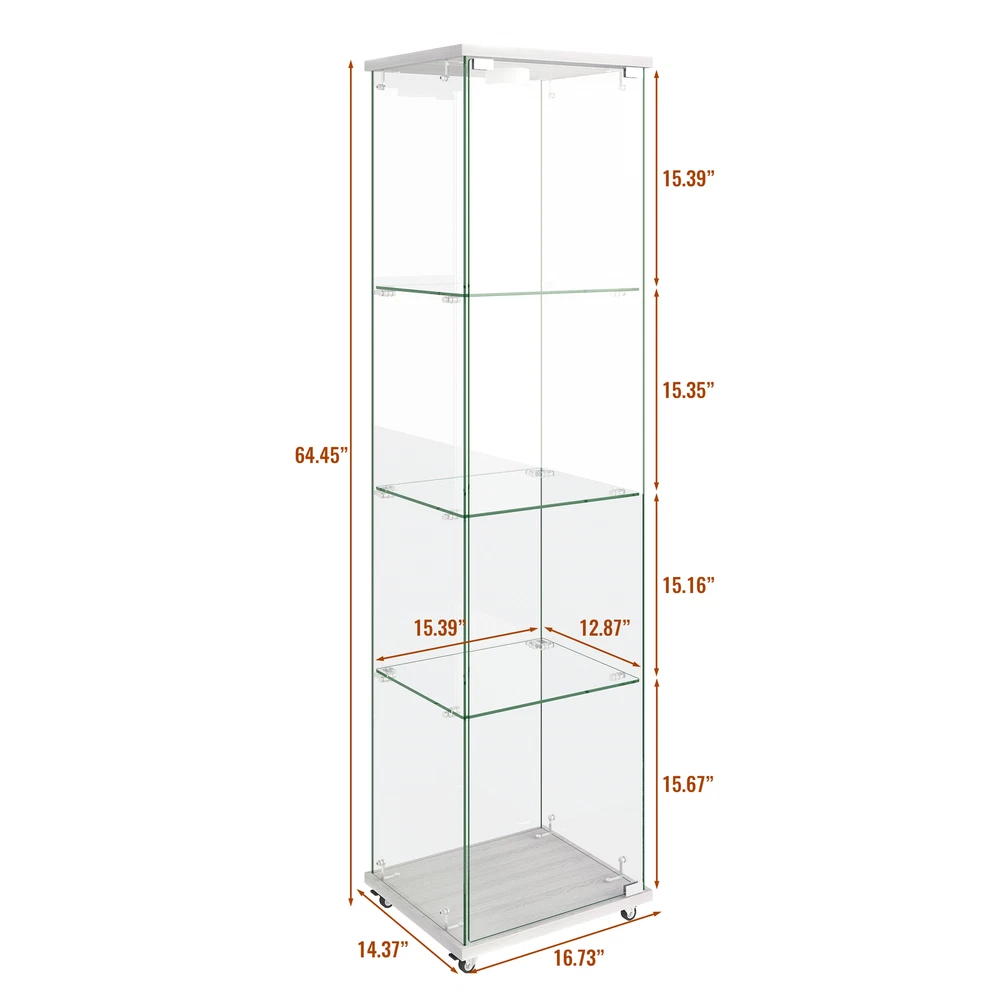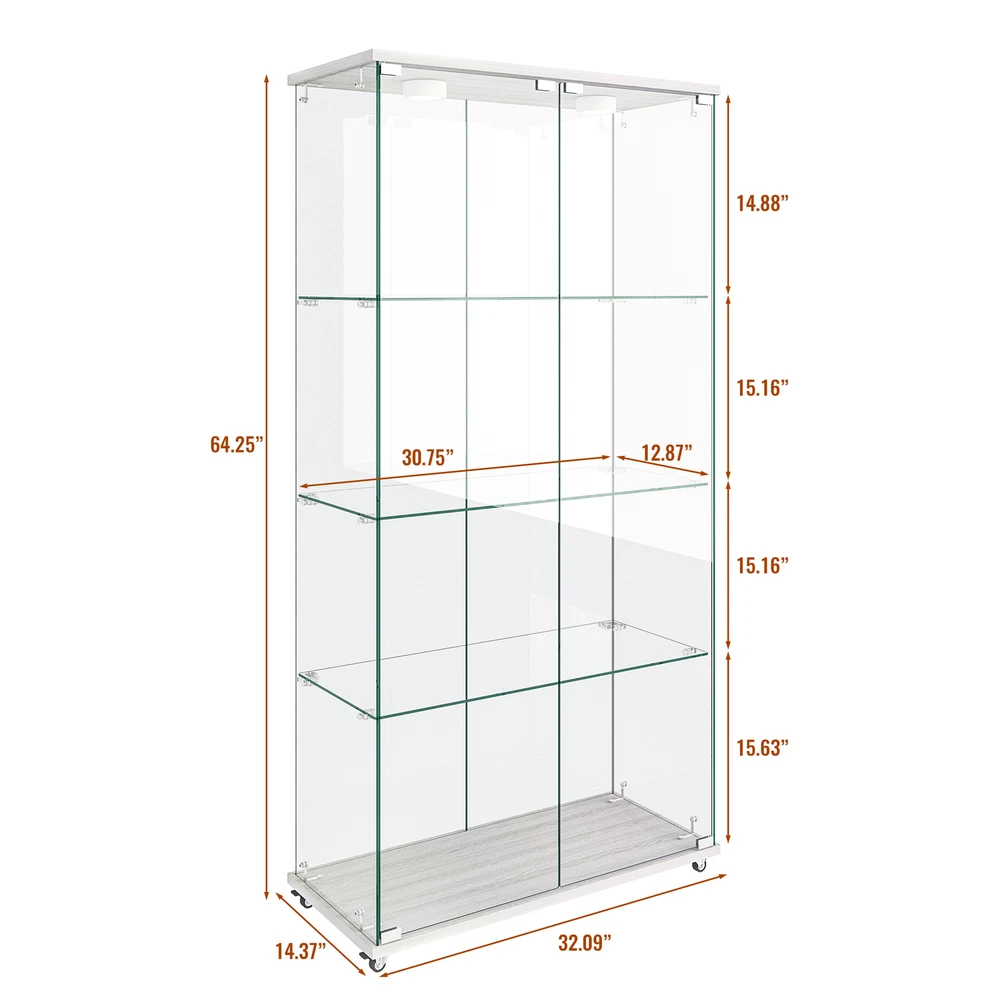 Glass Display Cabinet with LED Lights Modern Collectibles Toy Organizers Rack Features 1.Glass Display Cabinet: Size 64.25"(H) x 32.09"(L) x 14.37"(W) inches, each tempered glass is 5mm thick. The 4-layer shelf is designed to be sturdy and stylish. The glass doors are easy to open and close. It is equipped with 4 caster wheels with brakes. 2.load-bearing: Each layer of the glass shelf can bear a maximum weight of 45 pounds. 3.Enhanced Protection: Made of tough tempered glass and MDF top and bottom panels. There are fixed accessories to connect the side glass and the glass shelves, which can ensure maximum stability. It is durable and practical, suitable for daily use. 4.Store all kinds of items in this glass cabinet. The glass doors help to keep out dust and protect your collections well. 5.It is highly suitable for displaying models, photos, medals, action figures, wine bottles, toys, works of art and ornaments. The transparent glass is an ideal choice for showcasing personal collections and items of commemorative significance. 6.Customizable Lighting: This display cabinet is equipped with 2 colorful lights and a remote control with adjustable colors, allowing you to create the perfect atmosphere for any occasion. There are 12 adjustable colors to choose from, and you can freely adjust the brightness to easily set the atmosphere that suits your preferences or the theme of the event. 7.Easy to clean: The glass material is easy to clean, which can save you a lot of time. 8.Aesthetic Appeal: With its simple design that is both Stylish and Attractive, it seamlessly blends into various modern home environments, suitable for homes, bedrooms, living rooms, offices, shopping centers, and more. 9.Quick Installation: This glass display cabinet is designed for convenience and can be easily assembled through a quick installation process. Just peel off the double-sided tape and stick the light strips on the top of the cabinet. There is no need for complicated wiring or tools, making the installation effortless and worry-free.