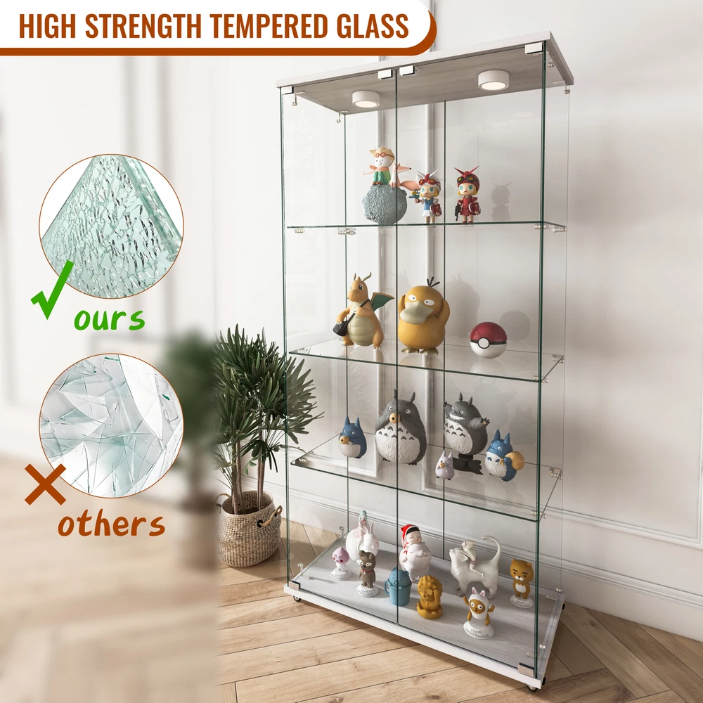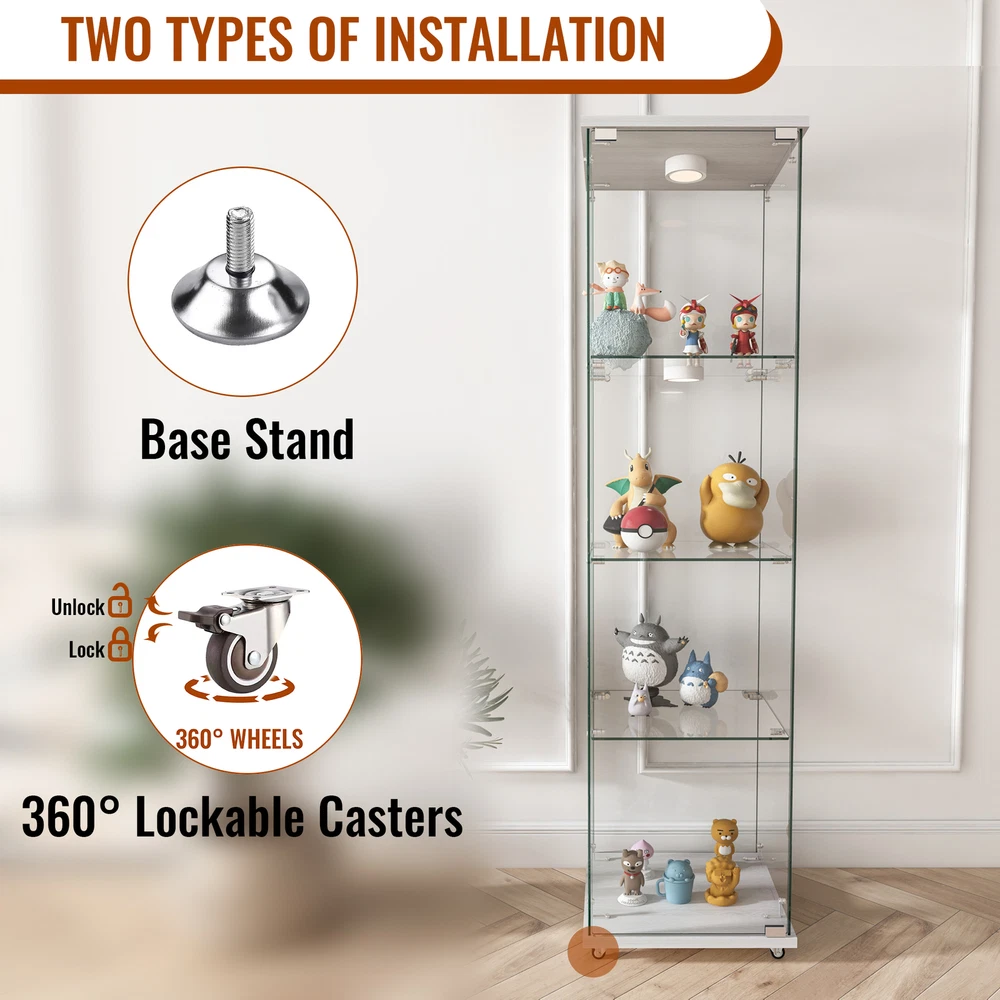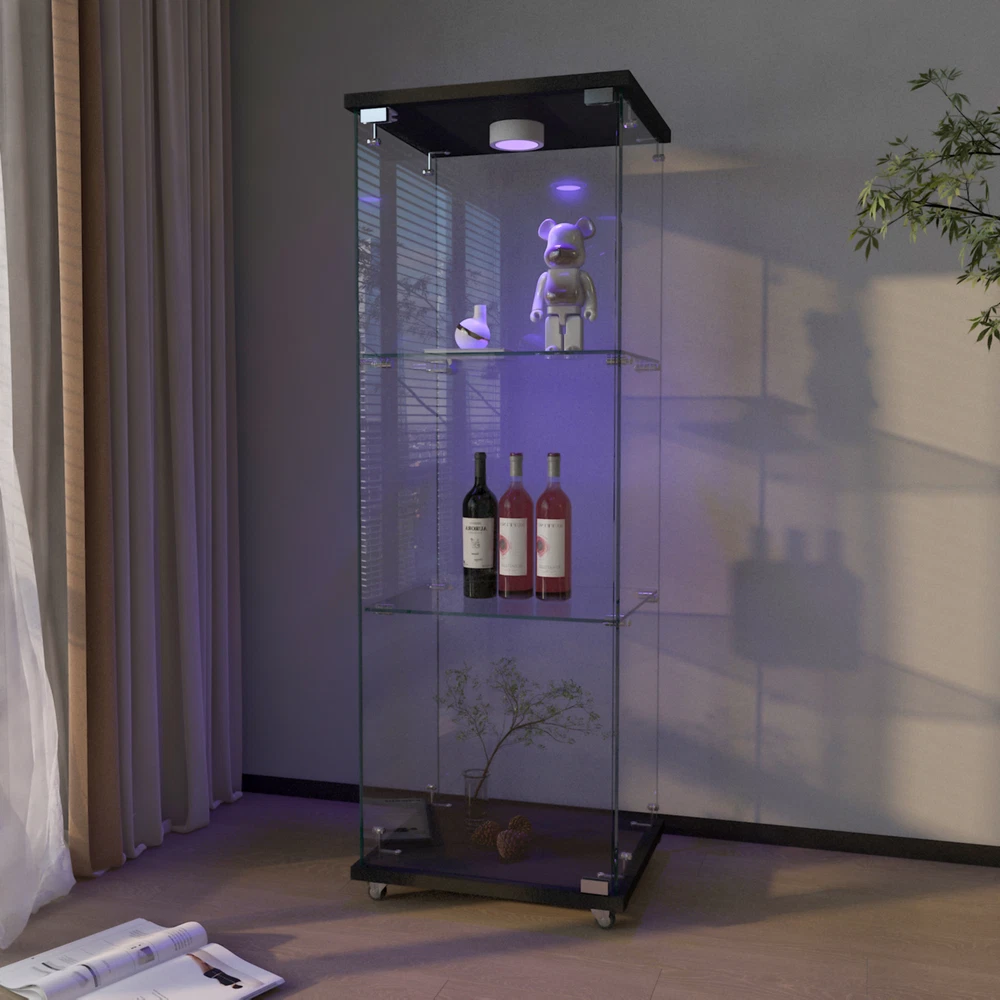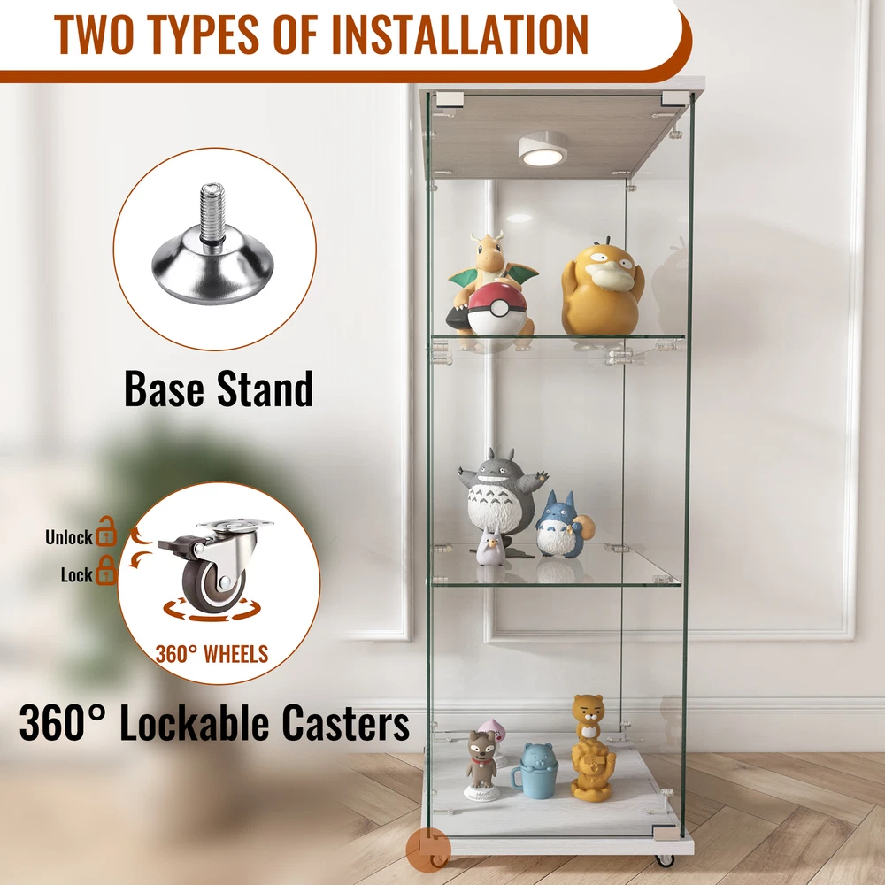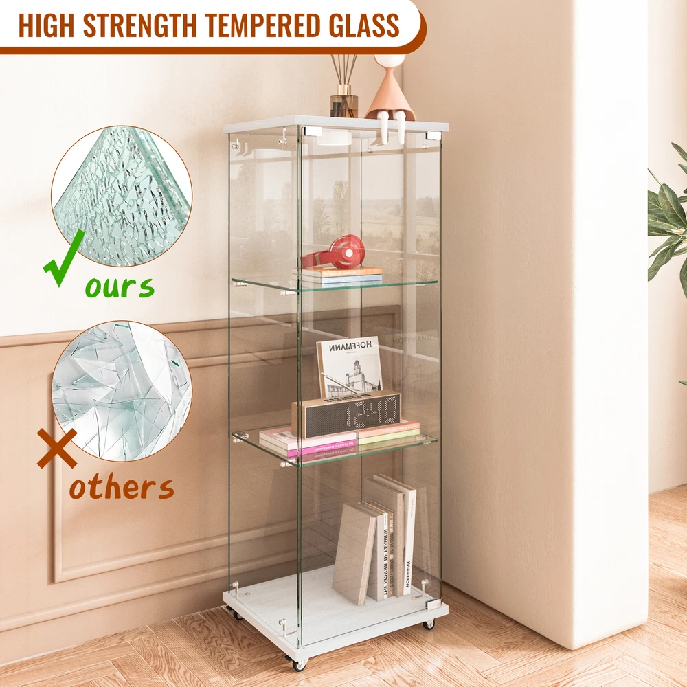 Glass Display Cabinet with LED Lights Modern Collectibles Toy Organizers Rack Features 1.Glass Display Cabinet: Size 64.25"(H) x 32.09"(L) x 14.37"(W) inches, each tempered glass is 5mm thick. The 4-layer shelf is designed to be sturdy and stylish. The glass doors are easy to open and close. It is equipped with 4 caster wheels with brakes. 2.load-bearing: Each layer of the glass shelf can bear a maximum weight of 45 pounds. 3.Enhanced Protection: Made of tough tempered glass and MDF top and bottom panels. There are fixed accessories to connect the side glass and the glass shelves, which can ensure maximum stability. It is durable and practical, suitable for daily use. 4.Store all kinds of items in this glass cabinet. The glass doors help to keep out dust and protect your collections well. 5.It is highly suitable for displaying models, photos, medals, action figures, wine bottles, toys, works of art and ornaments. The transparent glass is an ideal choice for showcasing personal collections and items of commemorative significance. 6.Customizable Lighting: This display cabinet is equipped with 2 colorful lights and a remote control with adjustable colors, allowing you to create the perfect atmosphere for any occasion. There are 12 adjustable colors to choose from, and you can freely adjust the brightness to easily set the atmosphere that suits your preferences or the theme of the event. 7.Easy to clean: The glass material is easy to clean, which can save you a lot of time. 8.Aesthetic Appeal: With its simple design that is both Stylish and Attractive, it seamlessly blends into various modern home environments, suitable for homes, bedrooms, living rooms, offices, shopping centers, and more. 9.Quick Installation: This glass display cabinet is designed for convenience and can be easily assembled through a quick installation process. Just peel off the double-sided tape and stick the light strips on the top of the cabinet. There is no need for complicated wiring or tools, making the installation effortless and worry-free.